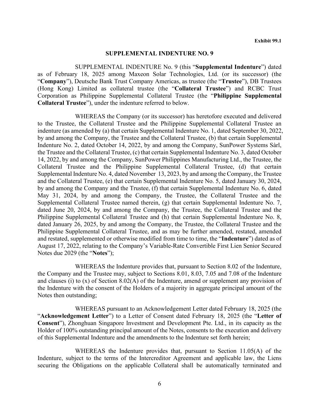 6 Exhibit 99.1 SUPPLEMENTAL INDENTURE NO. 9 SUPPLEMENTAL INDENTURE No. 9 (this “Supplemental Indenture”) dated as of February 18, 2025 among Maxeon Solar Technologies, Ltd. (or its successor) (the “Company”), Deutsche Bank Trust Company Americas, as trustee (the “Trustee”), DB Trustees (Hong Kong) Limited as collateral trustee (the “Collateral Trustee”) and RCBC Trust Corporation as Philippine Supplemental Collateral Trustee (the “Philippine Supplemental Collateral Trustee”), under the indenture referred to below. WHEREAS the Company (or its successor) has heretofore executed and delivered to the Trustee, the Collateral Trustee and the Philippine Supplemental Collateral Trustee an indenture (as amended by (a) that certain Supplemental Indenture No. 1, dated September 30, 2022, by and among the Company, the Trustee and the Collateral Trustee, (b) that certain Supplemental Indenture No. 2, dated October 14, 2022, by and among the Company, SunPower Systems Sàrl, the Trustee and the Collateral Trustee, (c) that certain Supplemental Indenture No. 3, dated October 14, 2022, by and among the Company, SunPower Philippines Manufacturing Ltd., the Trustee, the Collateral Trustee and the Philippine Supplemental Collateral Trustee, (d) that certain Supplemental Indenture No. 4, dated November 13, 2023, by and among the Company, the Trustee and the Collateral Trustee, (e) that certain Supplemental Indenture No. 5, dated January 30, 2024, by and among the Company and the Trustee, (f) that certain Supplemental Indenture No. 6, dated May 31, 2024, by and among the Company, the Trustee, the Collateral Trustee and the Supplemental Collateral Trustee named therein, (g) that certain Supplemental Indenture No. 7, dated June 20, 2024, by and among the Company, the Trustee, the Collateral Trustee and the Philippine Supplemental Collateral Trustee and (h) that certain Supplemental Indenture No. 8, dated January 26, 2025, by and among the Company, the Trustee, the Collateral Trustee and the Philippine Supplemental Collateral Trustee, and as may be further amended, restated, amended and restated, supplemented or otherwise modified from time to time, the “Indenture”) dated as of August 17, 2022, relating to the Company’s Variable-Rate Convertible First Lien Senior Secured Notes due 2029 (the “Notes”); WHEREAS the Indenture provides that, pursuant to Section 8.02 of the Indenture, the Company and the Trustee may, subject to Sections 8.01, 8.03, 7.05 and 7.08 of the Indenture and clauses (i) to (x) of Section 8.02(A) of the Indenture, amend or supplement any provision of the Indenture with the consent of the Holders of a majority in aggregate principal amount of the Notes then outstanding; WHEREAS pursuant to an Acknowledgement Letter dated February 18, 2025 (the “Acknowledgement Letter”) to a Letter of Consent dated February 18, 2025 (the “Letter of Consent”), Zhonghuan Singapore Investment and Development Pte. Ltd., in its capacity as the Holder of 100% outstanding principal amount of the Notes, consents to the execution and delivery of this Supplemental Indenture and the amendments to the Indenture set forth herein; WHEREAS the Indenture provides that, pursuant to Section 11.05(A) of the Indenture, subject to the terms of the Intercreditor Agreement and applicable law, the Liens securing the Obligations on the applicable Collateral shall be automatically terminated and