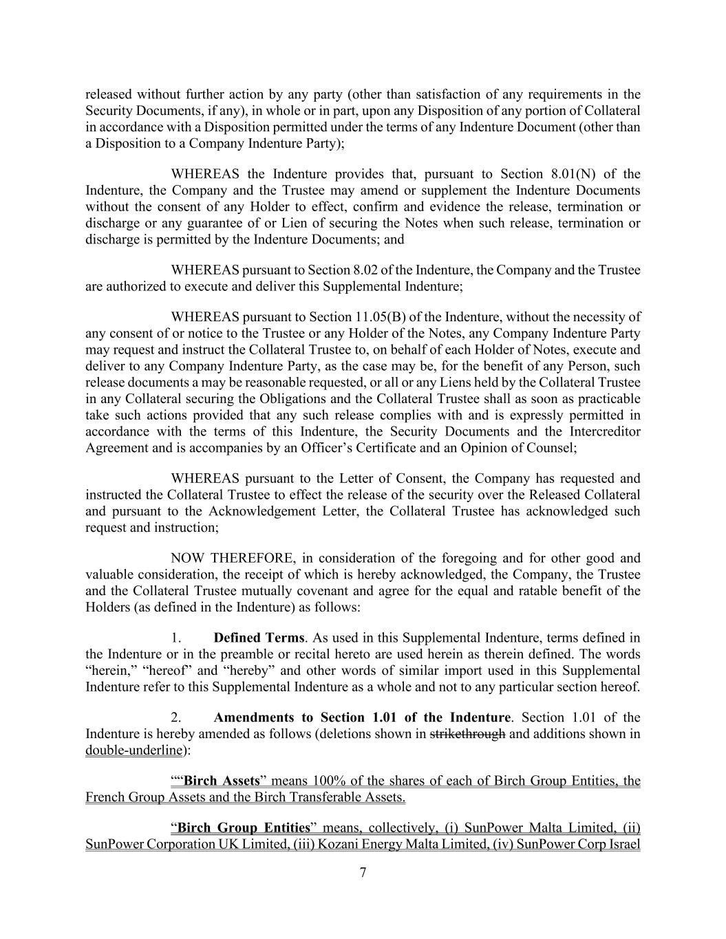 7 released without further action by any party (other than satisfaction of any requirements in the Security Documents, if any), in whole or in part, upon any Disposition of any portion of Collateral in accordance with a Disposition permitted under the terms of any Indenture Document (other than a Disposition to a Company Indenture Party); WHEREAS the Indenture provides that, pursuant to Section 8.01(N) of the Indenture, the Company and the Trustee may amend or supplement the Indenture Documents without the consent of any Holder to effect, confirm and evidence the release, termination or discharge or any guarantee of or Lien of securing the Notes when such release, termination or discharge is permitted by the Indenture Documents; and WHEREAS pursuant to Section 8.02 of the Indenture, the Company and the Trustee are authorized to execute and deliver this Supplemental Indenture; WHEREAS pursuant to Section 11.05(B) of the Indenture, without the necessity of any consent of or notice to the Trustee or any Holder of the Notes, any Company Indenture Party may request and instruct the Collateral Trustee to, on behalf of each Holder of Notes, execute and deliver to any Company Indenture Party, as the case may be, for the benefit of any Person, such release documents a may be reasonable requested, or all or any Liens held by the Collateral Trustee in any Collateral securing the Obligations and the Collateral Trustee shall as soon as practicable take such actions provided that any such release complies with and is expressly permitted in accordance with the terms of this Indenture, the Security Documents and the Intercreditor Agreement and is accompanies by an Officer’s Certificate and an Opinion of Counsel; WHEREAS pursuant to the Letter of Consent, the Company has requested and instructed the Collateral Trustee to effect the release of the security over the Released Collateral and pursuant to the Acknowledgement Letter, the Collateral Trustee has acknowledged such request and instruction; NOW THEREFORE, in consideration of the foregoing and for other good and valuable consideration, the receipt of which is hereby acknowledged, the Company, the Trustee and the Collateral Trustee mutually covenant and agree for the equal and ratable benefit of the Holders (as defined in the Indenture) as follows: 1. Defined Terms. As used in this Supplemental Indenture, terms defined in the Indenture or in the preamble or recital hereto are used herein as therein defined. The words “herein,” “hereof” and “hereby” and other words of similar import used in this Supplemental Indenture refer to this Supplemental Indenture as a whole and not to any particular section hereof. 2. Amendments to Section 1.01 of the Indenture. Section 1.01 of the Indenture is hereby amended as follows (deletions shown in strikethrough and additions shown in double-underline): ““Birch Assets” means 100% of the shares of each of Birch Group Entities, the French Group Assets and the Birch Transferable Assets. “Birch Group Entities” means, collectively, (i) SunPower Malta Limited, (ii) SunPower Corporation UK Limited, (iii) Kozani Energy Malta Limited, (iv) SunPower Corp Israel