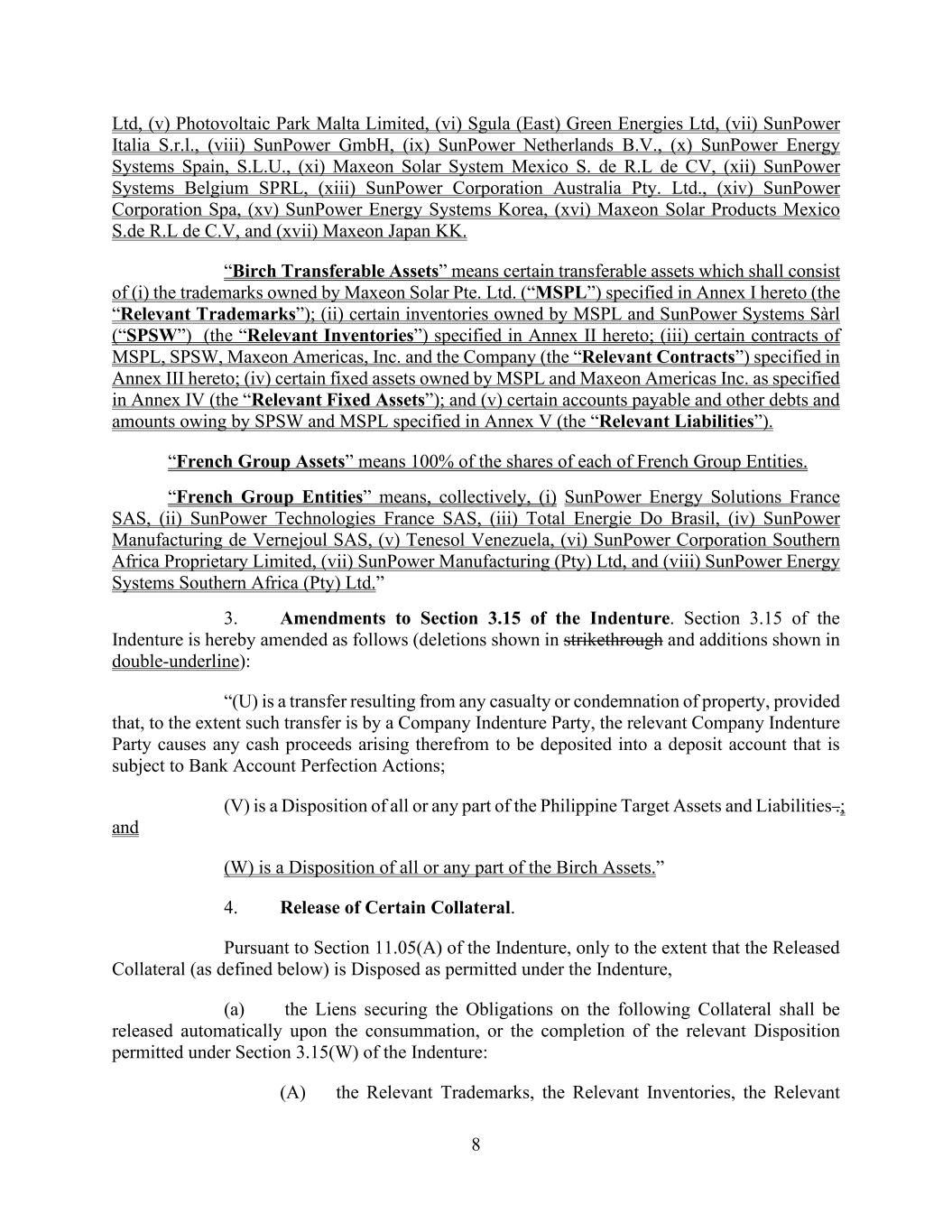 8 Ltd, (v) Photovoltaic Park Malta Limited, (vi) Sgula (East) Green Energies Ltd, (vii) SunPower Italia S.r.l., (viii) SunPower GmbH, (ix) SunPower Netherlands B.V., (x) SunPower Energy Systems Spain, S.L.U., (xi) Maxeon Solar System Mexico S. de R.L de CV, (xii) SunPower Systems Belgium SPRL, (xiii) SunPower Corporation Australia Pty. Ltd., (xiv) SunPower Corporation Spa, (xv) SunPower Energy Systems Korea, (xvi) Maxeon Solar Products Mexico S.de R.L de C.V, and (xvii) Maxeon Japan KK. “Birch Transferable Assets” means certain transferable assets which shall consist of (i) the trademarks owned by Maxeon Solar Pte. Ltd. (“MSPL”) specified in Annex I hereto (the “Relevant Trademarks”); (ii) certain inventories owned by MSPL and SunPower Systems Sàrl (“SPSW”) (the “Relevant Inventories”) specified in Annex II hereto; (iii) certain contracts of MSPL, SPSW, Maxeon Americas, Inc. and the Company (the “Relevant Contracts”) specified in Annex III hereto; (iv) certain fixed assets owned by MSPL and Maxeon Americas Inc. as specified in Annex IV (the “Relevant Fixed Assets”); and (v) certain accounts payable and other debts and amounts owing by SPSW and MSPL specified in Annex V (the “Relevant Liabilities”). “French Group Assets” means 100% of the shares of each of French Group Entities. “French Group Entities” means, collectively, (i) SunPower Energy Solutions France SAS, (ii) SunPower Technologies France SAS, (iii) Total Energie Do Brasil, (iv) SunPower Manufacturing de Vernejoul SAS, (v) Tenesol Venezuela, (vi) SunPower Corporation Southern Africa Proprietary Limited, (vii) SunPower Manufacturing (Pty) Ltd, and (viii) SunPower Energy Systems Southern Africa (Pty) Ltd.” 3. Amendments to Section 3.15 of the Indenture. Section 3.15 of the Indenture is hereby amended as follows (deletions shown in strikethrough and additions shown in double-underline): “(U) is a transfer resulting from any casualty or condemnation of property, provided that, to the extent such transfer is by a Company Indenture Party, the relevant Company Indenture Party causes any cash proceeds arising therefrom to be deposited into a deposit account that is subject to Bank Account Perfection Actions; (V) is a Disposition of all or any part of the Philippine Target Assets and Liabilities .; and (W) is a Disposition of all or any part of the Birch Assets.” 4. Release of Certain Collateral. Pursuant to Section 11.05(A) of the Indenture, only to the extent that the Released Collateral (as defined below) is Disposed as permitted under the Indenture, (a) the Liens securing the Obligations on the following Collateral shall be released automatically upon the consummation, or the completion of the relevant Disposition permitted under Section 3.15(W) of the Indenture: (A) the Relevant Trademarks, the Relevant Inventories, the Relevant