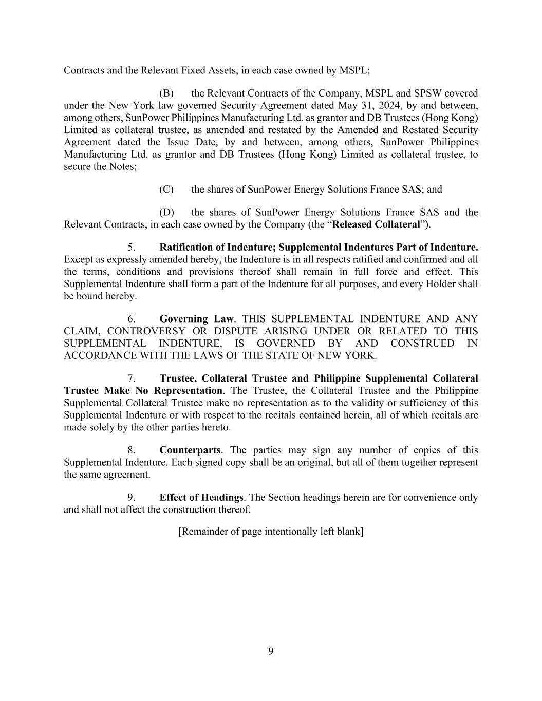 9 Contracts and the Relevant Fixed Assets, in each case owned by MSPL; (B) the Relevant Contracts of the Company, MSPL and SPSW covered under the New York law governed Security Agreement dated May 31, 2024, by and between, among others, SunPower Philippines Manufacturing Ltd. as grantor and DB Trustees (Hong Kong) Limited as collateral trustee, as amended and restated by the Amended and Restated Security Agreement dated the Issue Date, by and between, among others, SunPower Philippines Manufacturing Ltd. as grantor and DB Trustees (Hong Kong) Limited as collateral trustee, to secure the Notes; (C) the shares of SunPower Energy Solutions France SAS; and (D) the shares of SunPower Energy Solutions France SAS and the Relevant Contracts, in each case owned by the Company (the “Released Collateral”). 5. Ratification of Indenture; Supplemental Indentures Part of Indenture. Except as expressly amended hereby, the Indenture is in all respects ratified and confirmed and all the terms, conditions and provisions thereof shall remain in full force and effect. This Supplemental Indenture shall form a part of the Indenture for all purposes, and every Holder shall be bound hereby. 6. Governing Law. THIS SUPPLEMENTAL INDENTURE AND ANY CLAIM, CONTROVERSY OR DISPUTE ARISING UNDER OR RELATED TO THIS SUPPLEMENTAL INDENTURE, IS GOVERNED BY AND CONSTRUED IN ACCORDANCE WITH THE LAWS OF THE STATE OF NEW YORK. 7. Trustee, Collateral Trustee and Philippine Supplemental Collateral Trustee Make No Representation. The Trustee, the Collateral Trustee and the Philippine Supplemental Collateral Trustee make no representation as to the validity or sufficiency of this Supplemental Indenture or with respect to the recitals contained herein, all of which recitals are made solely by the other parties hereto. 8. Counterparts. The parties may sign any number of copies of this Supplemental Indenture. Each signed copy shall be an original, but all of them together represent the same agreement. 9. Effect of Headings. The Section headings herein are for convenience only and shall not affect the construction thereof. [Remainder of page intentionally left blank]