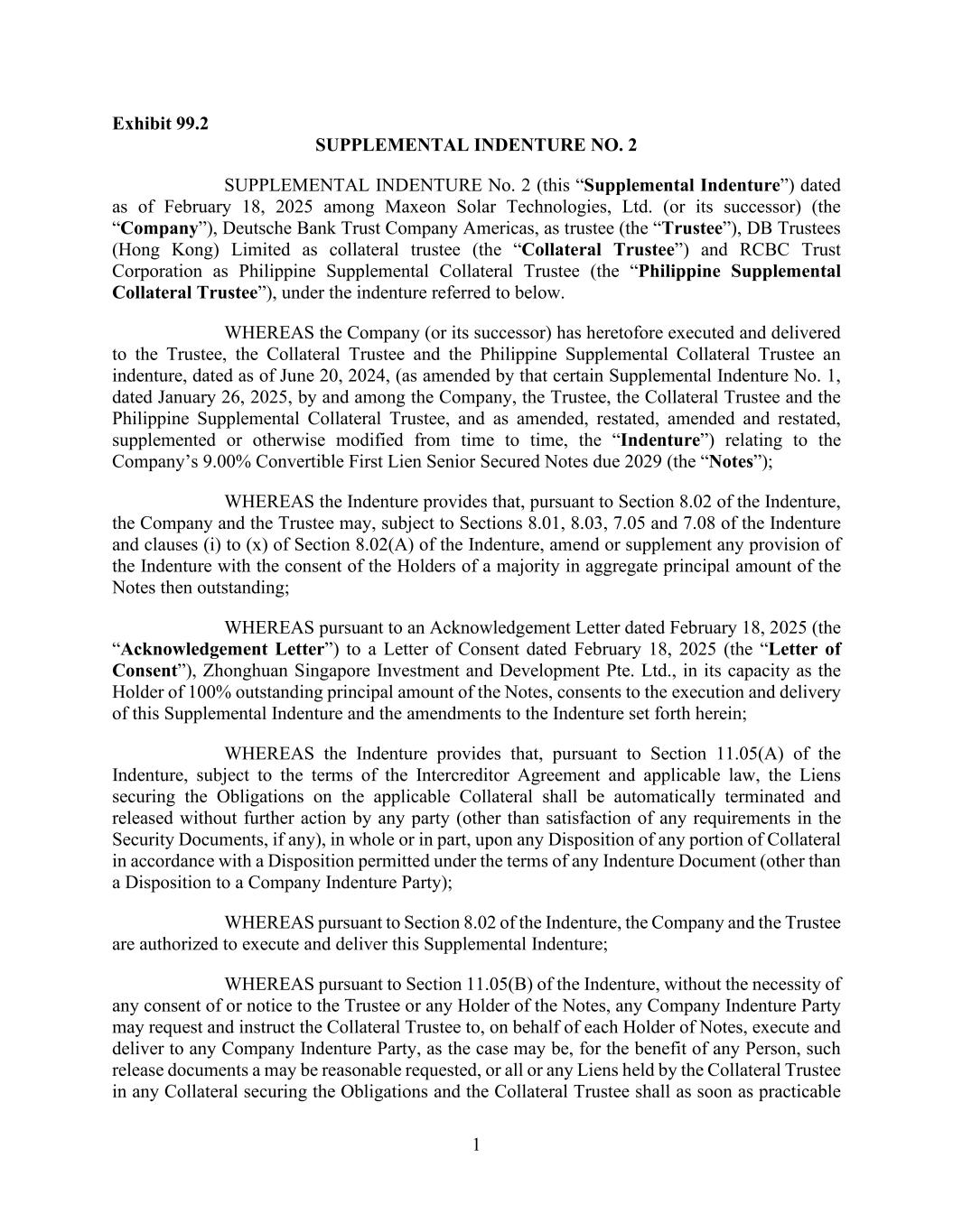 1 Exhibit 99.2 SUPPLEMENTAL INDENTURE NO. 2 SUPPLEMENTAL INDENTURE No. 2 (this “Supplemental Indenture”) dated as of February 18, 2025 among Maxeon Solar Technologies, Ltd. (or its successor) (the “Company”), Deutsche Bank Trust Company Americas, as trustee (the “Trustee”), DB Trustees (Hong Kong) Limited as collateral trustee (the “Collateral Trustee”) and RCBC Trust Corporation as Philippine Supplemental Collateral Trustee (the “Philippine Supplemental Collateral Trustee”), under the indenture referred to below. WHEREAS the Company (or its successor) has heretofore executed and delivered to the Trustee, the Collateral Trustee and the Philippine Supplemental Collateral Trustee an indenture, dated as of June 20, 2024, (as amended by that certain Supplemental Indenture No. 1, dated January 26, 2025, by and among the Company, the Trustee, the Collateral Trustee and the Philippine Supplemental Collateral Trustee, and as amended, restated, amended and restated, supplemented or otherwise modified from time to time, the “Indenture”) relating to the Company’s 9.00% Convertible First Lien Senior Secured Notes due 2029 (the “Notes”); WHEREAS the Indenture provides that, pursuant to Section 8.02 of the Indenture, the Company and the Trustee may, subject to Sections 8.01, 8.03, 7.05 and 7.08 of the Indenture and clauses (i) to (x) of Section 8.02(A) of the Indenture, amend or supplement any provision of the Indenture with the consent of the Holders of a majority in aggregate principal amount of the Notes then outstanding; WHEREAS pursuant to an Acknowledgement Letter dated February 18, 2025 (the “Acknowledgement Letter”) to a Letter of Consent dated February 18, 2025 (the “Letter of Consent”), Zhonghuan Singapore Investment and Development Pte. Ltd., in its capacity as the Holder of 100% outstanding principal amount of the Notes, consents to the execution and delivery of this Supplemental Indenture and the amendments to the Indenture set forth herein; WHEREAS the Indenture provides that, pursuant to Section 11.05(A) of the Indenture, subject to the terms of the Intercreditor Agreement and applicable law, the Liens securing the Obligations on the applicable Collateral shall be automatically terminated and released without further action by any party (other than satisfaction of any requirements in the Security Documents, if any), in whole or in part, upon any Disposition of any portion of Collateral in accordance with a Disposition permitted under the terms of any Indenture Document (other than a Disposition to a Company Indenture Party); WHEREAS pursuant to Section 8.02 of the Indenture, the Company and the Trustee are authorized to execute and deliver this Supplemental Indenture; WHEREAS pursuant to Section 11.05(B) of the Indenture, without the necessity of any consent of or notice to the Trustee or any Holder of the Notes, any Company Indenture Party may request and instruct the Collateral Trustee to, on behalf of each Holder of Notes, execute and deliver to any Company Indenture Party, as the case may be, for the benefit of any Person, such release documents a may be reasonable requested, or all or any Liens held by the Collateral Trustee in any Collateral securing the Obligations and the Collateral Trustee shall as soon as practicable
