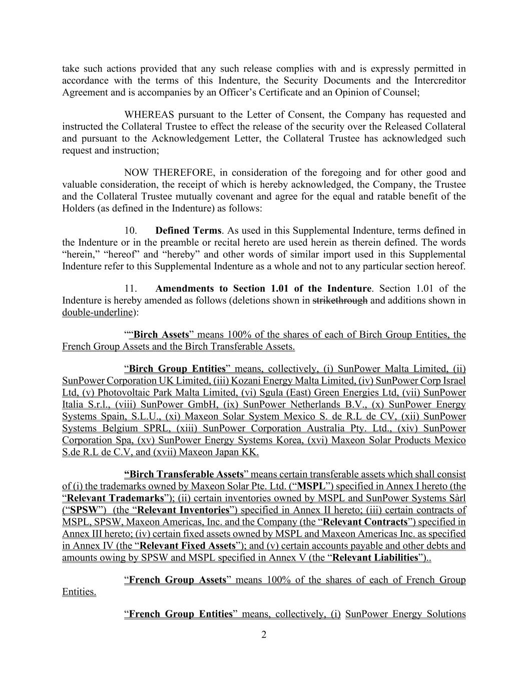 2 take such actions provided that any such release complies with and is expressly permitted in accordance with the terms of this Indenture, the Security Documents and the Intercreditor Agreement and is accompanies by an Officer’s Certificate and an Opinion of Counsel; WHEREAS pursuant to the Letter of Consent, the Company has requested and instructed the Collateral Trustee to effect the release of the security over the Released Collateral and pursuant to the Acknowledgement Letter, the Collateral Trustee has acknowledged such request and instruction; NOW THEREFORE, in consideration of the foregoing and for other good and valuable consideration, the receipt of which is hereby acknowledged, the Company, the Trustee and the Collateral Trustee mutually covenant and agree for the equal and ratable benefit of the Holders (as defined in the Indenture) as follows: 10. Defined Terms. As used in this Supplemental Indenture, terms defined in the Indenture or in the preamble or recital hereto are used herein as therein defined. The words “herein,” “hereof” and “hereby” and other words of similar import used in this Supplemental Indenture refer to this Supplemental Indenture as a whole and not to any particular section hereof. 11. Amendments to Section 1.01 of the Indenture. Section 1.01 of the Indenture is hereby amended as follows (deletions shown in strikethrough and additions shown in double-underline): ““Birch Assets” means 100% of the shares of each of Birch Group Entities, the French Group Assets and the Birch Transferable Assets. “Birch Group Entities” means, collectively, (i) SunPower Malta Limited, (ii) SunPower Corporation UK Limited, (iii) Kozani Energy Malta Limited, (iv) SunPower Corp Israel Ltd, (v) Photovoltaic Park Malta Limited, (vi) Sgula (East) Green Energies Ltd, (vii) SunPower Italia S.r.l., (viii) SunPower GmbH, (ix) SunPower Netherlands B.V., (x) SunPower Energy Systems Spain, S.L.U., (xi) Maxeon Solar System Mexico S. de R.L de CV, (xii) SunPower Systems Belgium SPRL, (xiii) SunPower Corporation Australia Pty. Ltd., (xiv) SunPower Corporation Spa, (xv) SunPower Energy Systems Korea, (xvi) Maxeon Solar Products Mexico S.de R.L de C.V, and (xvii) Maxeon Japan KK. “Birch Transferable Assets” means certain transferable assets which shall consist of (i) the trademarks owned by Maxeon Solar Pte. Ltd. (“MSPL”) specified in Annex I hereto (the “Relevant Trademarks”); (ii) certain inventories owned by MSPL and SunPower Systems Sàrl (“SPSW”) (the “Relevant Inventories”) specified in Annex II hereto; (iii) certain contracts of MSPL, SPSW, Maxeon Americas, Inc. and the Company (the “Relevant Contracts”) specified in Annex III hereto; (iv) certain fixed assets owned by MSPL and Maxeon Americas Inc. as specified in Annex IV (the “Relevant Fixed Assets”); and (v) certain accounts payable and other debts and amounts owing by SPSW and MSPL specified in Annex V (the “Relevant Liabilities”).. “French Group Assets” means 100% of the shares of each of French Group Entities. “French Group Entities” means, collectively, (i) SunPower Energy Solutions