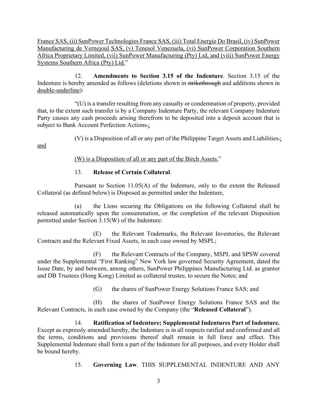 3 France SAS, (ii) SunPower Technologies France SAS, (iii) Total Energie Do Brasil, (iv) SunPower Manufacturing de Vernejoul SAS, (v) Tenesol Venezuela, (vi) SunPower Corporation Southern Africa Proprietary Limited, (vii) SunPower Manufacturing (Pty) Ltd, and (viii) SunPower Energy Systems Southern Africa (Pty) Ltd.” 12. Amendments to Section 3.15 of the Indenture. Section 3.15 of the Indenture is hereby amended as follows (deletions shown in strikethrough and additions shown in double-underline): “(U) is a transfer resulting from any casualty or condemnation of property, provided that, to the extent such transfer is by a Company Indenture Party, the relevant Company Indenture Party causes any cash proceeds arising therefrom to be deposited into a deposit account that is subject to Bank Account Perfection Actions.; (V) is a Disposition of all or any part of the Philippine Target Assets and Liabilities.; and (W) is a Disposition of all or any part of the Birch Assets.” 13. Release of Certain Collateral. Pursuant to Section 11.05(A) of the Indenture, only to the extent the Released Collateral (as defined below) is Disposed as permitted under the Indenture, (a) the Liens securing the Obligations on the following Collateral shall be released automatically upon the consummation, or the completion of the relevant Disposition permitted under Section 3.15(W) of the Indenture: (E) the Relevant Trademarks, the Relevant Inventories, the Relevant Contracts and the Relevant Fixed Assets, in each case owned by MSPL; (F) the Relevant Contracts of the Company, MSPL and SPSW covered under the Supplemental “First Ranking” New York law governed Security Agreement, dated the Issue Date, by and between, among others, SunPower Philippines Manufacturing Ltd. as grantor and DB Trustees (Hong Kong) Limited as collateral trustee, to secure the Notes; and (G) the shares of SunPower Energy Solutions France SAS; and (H) the shares of SunPower Energy Solutions France SAS and the Relevant Contracts, in each case owned by the Company (the “Released Collateral”). 14. Ratification of Indenture; Supplemental Indentures Part of Indenture. Except as expressly amended hereby, the Indenture is in all respects ratified and confirmed and all the terms, conditions and provisions thereof shall remain in full force and effect. This Supplemental Indenture shall form a part of the Indenture for all purposes, and every Holder shall be bound hereby. 15. Governing Law. THIS SUPPLEMENTAL INDENTURE AND ANY