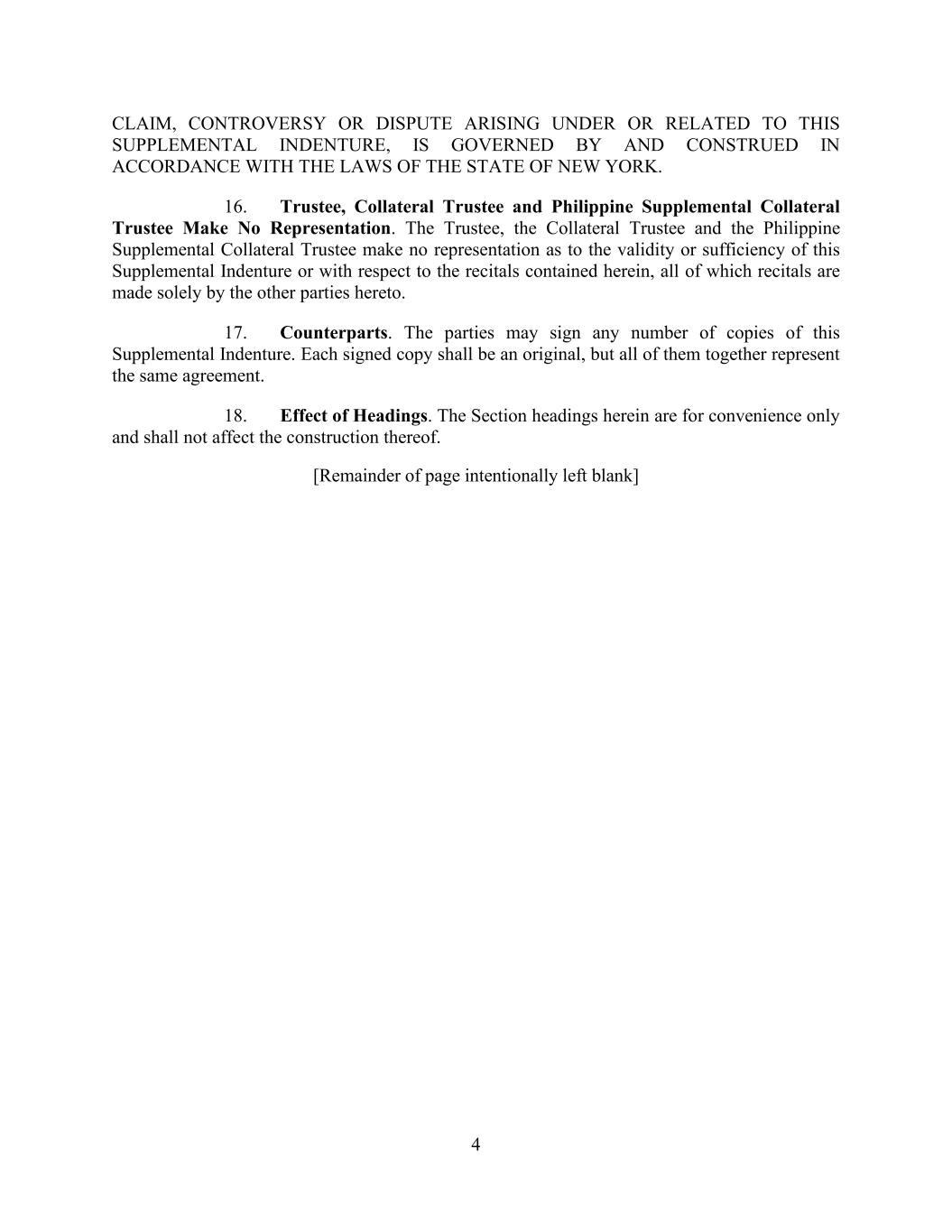 4 CLAIM, CONTROVERSY OR DISPUTE ARISING UNDER OR RELATED TO THIS SUPPLEMENTAL INDENTURE, IS GOVERNED BY AND CONSTRUED IN ACCORDANCE WITH THE LAWS OF THE STATE OF NEW YORK. 16. Trustee, Collateral Trustee and Philippine Supplemental Collateral Trustee Make No Representation. The Trustee, the Collateral Trustee and the Philippine Supplemental Collateral Trustee make no representation as to the validity or sufficiency of this Supplemental Indenture or with respect to the recitals contained herein, all of which recitals are made solely by the other parties hereto. 17. Counterparts. The parties may sign any number of copies of this Supplemental Indenture. Each signed copy shall be an original, but all of them together represent the same agreement. 18. Effect of Headings. The Section headings herein are for convenience only and shall not affect the construction thereof. [Remainder of page intentionally left blank]
