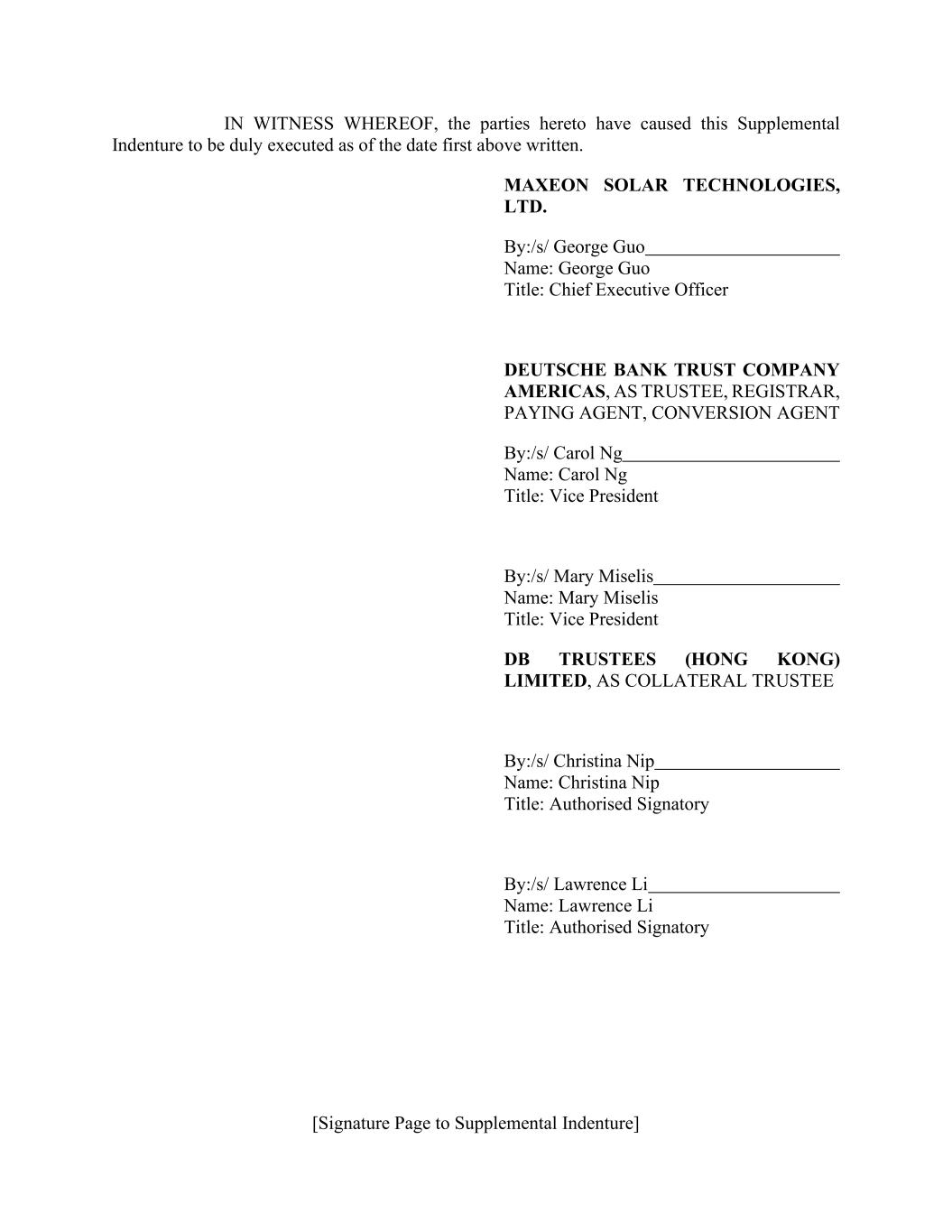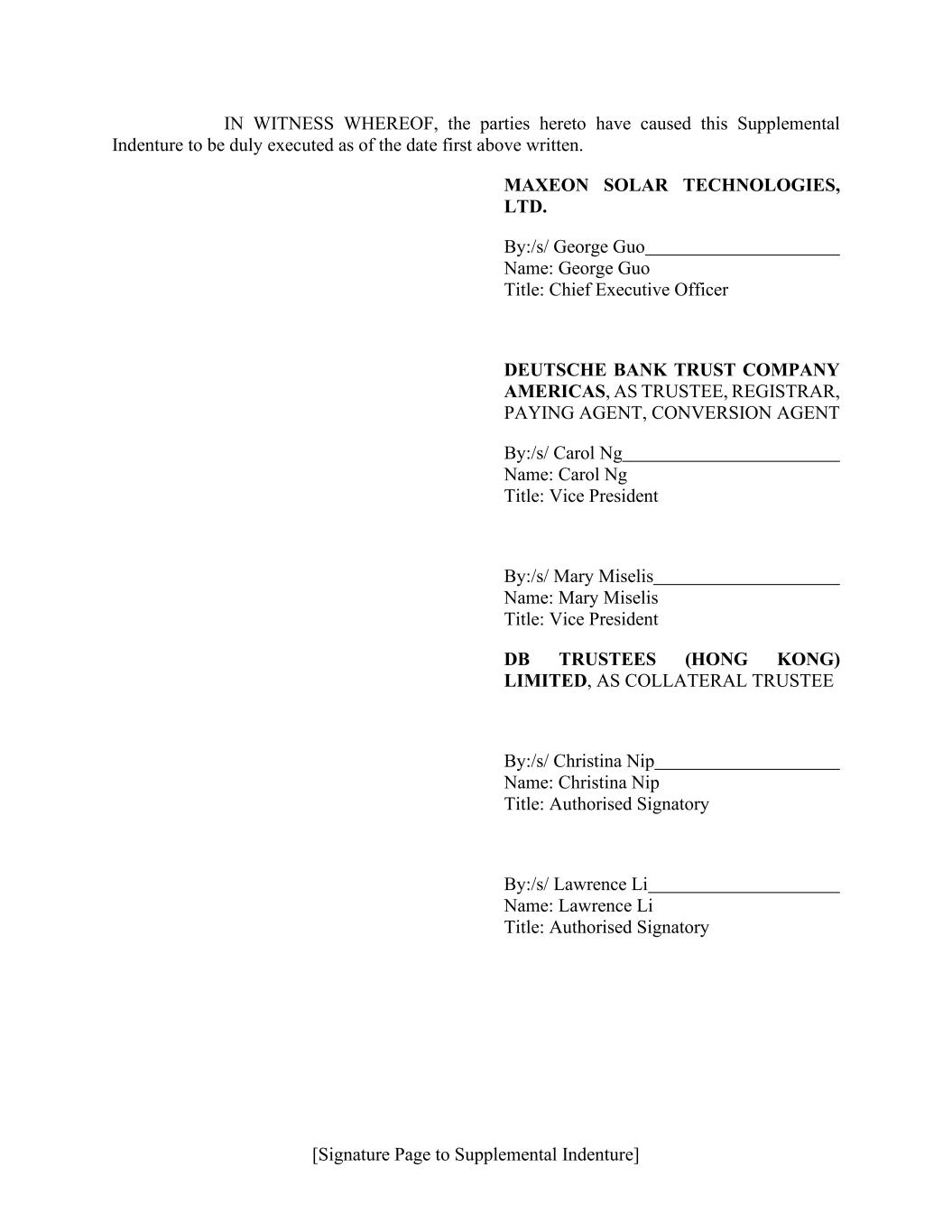 [Signature Page to Supplemental Indenture] IN WITNESS WHEREOF, the parties hereto have caused this Supplemental Indenture to be duly executed as of the date first above written. MAXEON SOLAR TECHNOLOGIES, LTD. By:/s/ George Guo Name: George Guo Title: Chief Executive Officer DEUTSCHE BANK TRUST COMPANY AMERICAS, AS TRUSTEE, REGISTRAR, PAYING AGENT, CONVERSION AGENT By:/s/ Carol Ng Name: Carol Ng Title: Vice President By:/s/ Mary Miselis Name: Mary Miselis Title: Vice President DB TRUSTEES (HONG KONG) LIMITED, AS COLLATERAL TRUSTEE By:/s/ Christina Nip Name: Christina Nip Title: Authorised Signatory By:/s/ Lawrence Li Name: Lawrence Li Title: Authorised Signatory