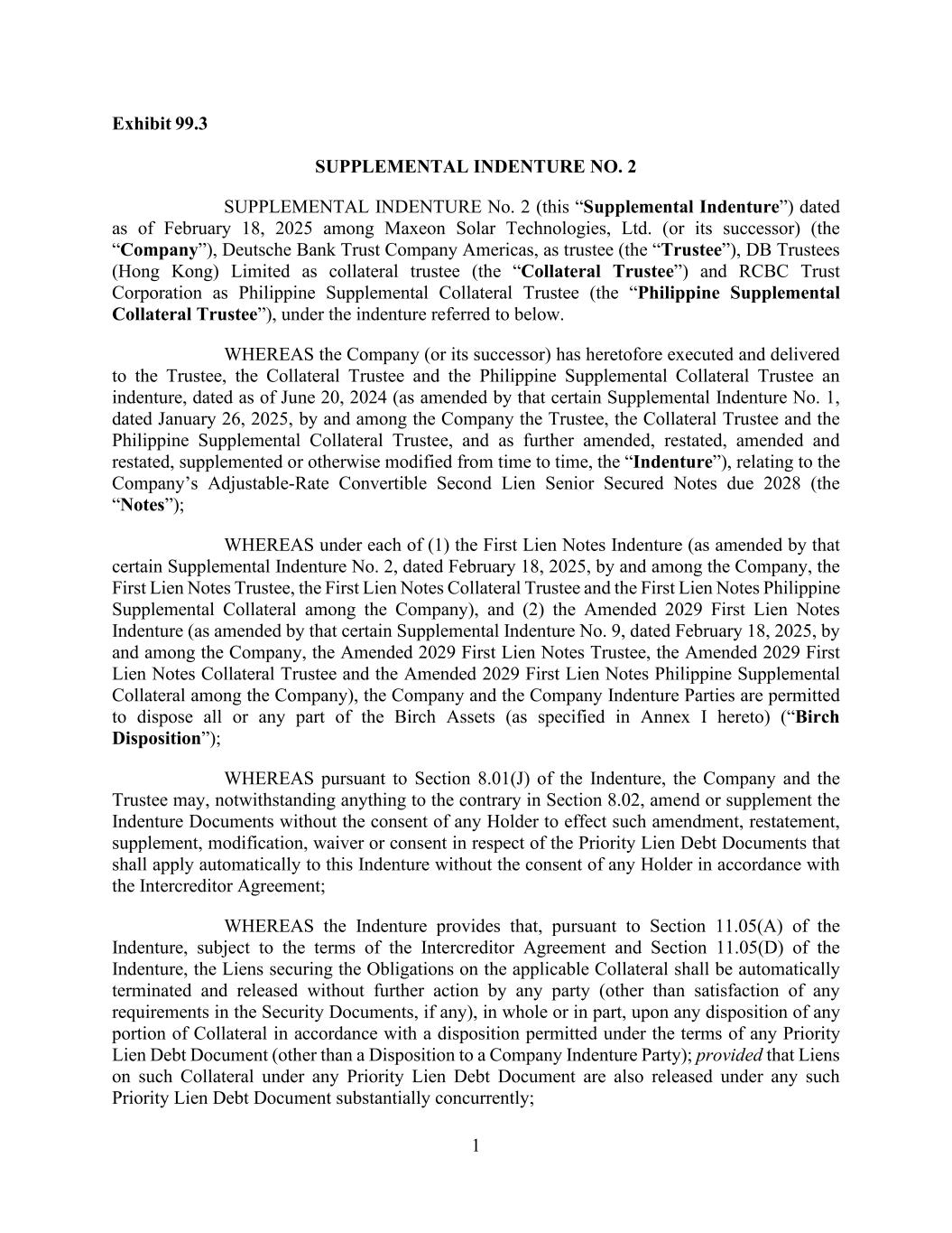 1 Exhibit 99.3 SUPPLEMENTAL INDENTURE NO. 2 SUPPLEMENTAL INDENTURE No. 2 (this “Supplemental Indenture”) dated as of February 18, 2025 among Maxeon Solar Technologies, Ltd. (or its successor) (the “Company”), Deutsche Bank Trust Company Americas, as trustee (the “Trustee”), DB Trustees (Hong Kong) Limited as collateral trustee (the “Collateral Trustee”) and RCBC Trust Corporation as Philippine Supplemental Collateral Trustee (the “Philippine Supplemental Collateral Trustee”), under the indenture referred to below. WHEREAS the Company (or its successor) has heretofore executed and delivered to the Trustee, the Collateral Trustee and the Philippine Supplemental Collateral Trustee an indenture, dated as of June 20, 2024 (as amended by that certain Supplemental Indenture No. 1, dated January 26, 2025, by and among the Company the Trustee, the Collateral Trustee and the Philippine Supplemental Collateral Trustee, and as further amended, restated, amended and restated, supplemented or otherwise modified from time to time, the “Indenture”), relating to the Company’s Adjustable-Rate Convertible Second Lien Senior Secured Notes due 2028 (the “Notes”); WHEREAS under each of (1) the First Lien Notes Indenture (as amended by that certain Supplemental Indenture No. 2, dated February 18, 2025, by and among the Company, the First Lien Notes Trustee, the First Lien Notes Collateral Trustee and the First Lien Notes Philippine Supplemental Collateral among the Company), and (2) the Amended 2029 First Lien Notes Indenture (as amended by that certain Supplemental Indenture No. 9, dated February 18, 2025, by and among the Company, the Amended 2029 First Lien Notes Trustee, the Amended 2029 First Lien Notes Collateral Trustee and the Amended 2029 First Lien Notes Philippine Supplemental Collateral among the Company), the Company and the Company Indenture Parties are permitted to dispose all or any part of the Birch Assets (as specified in Annex I hereto) (“Birch Disposition”); WHEREAS pursuant to Section 8.01(J) of the Indenture, the Company and the Trustee may, notwithstanding anything to the contrary in Section 8.02, amend or supplement the Indenture Documents without the consent of any Holder to effect such amendment, restatement, supplement, modification, waiver or consent in respect of the Priority Lien Debt Documents that shall apply automatically to this Indenture without the consent of any Holder in accordance with the Intercreditor Agreement; WHEREAS the Indenture provides that, pursuant to Section 11.05(A) of the Indenture, subject to the terms of the Intercreditor Agreement and Section 11.05(D) of the Indenture, the Liens securing the Obligations on the applicable Collateral shall be automatically terminated and released without further action by any party (other than satisfaction of any requirements in the Security Documents, if any), in whole or in part, upon any disposition of any portion of Collateral in accordance with a disposition permitted under the terms of any Priority Lien Debt Document (other than a Disposition to a Company Indenture Party); provided that Liens on such Collateral under any Priority Lien Debt Document are also released under any such Priority Lien Debt Document substantially concurrently;