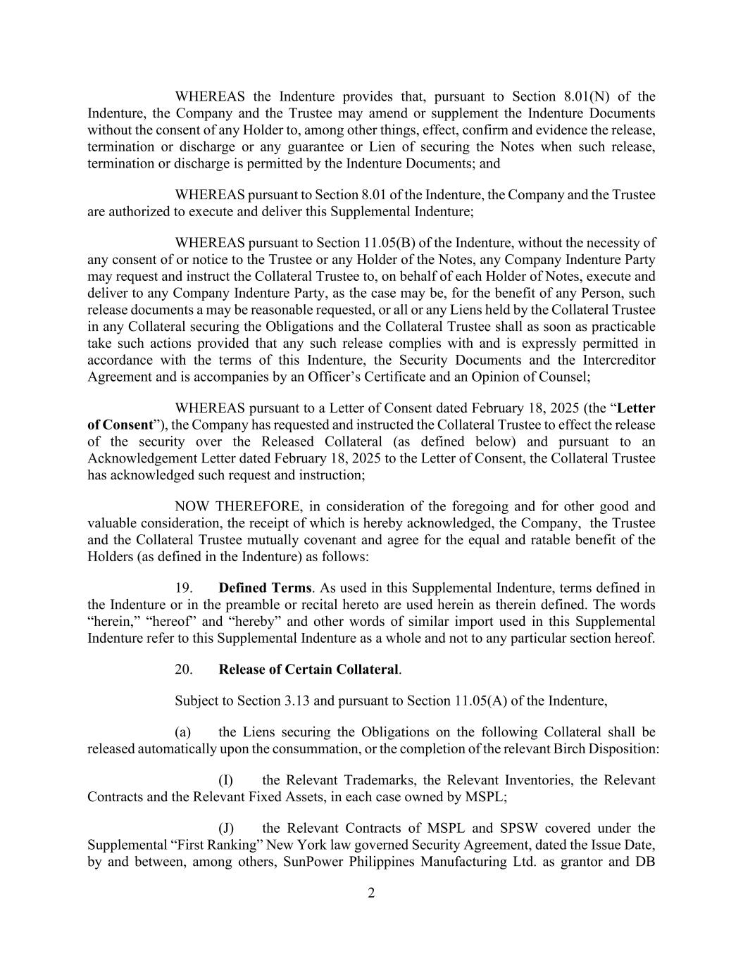 2 WHEREAS the Indenture provides that, pursuant to Section 8.01(N) of the Indenture, the Company and the Trustee may amend or supplement the Indenture Documents without the consent of any Holder to, among other things, effect, confirm and evidence the release, termination or discharge or any guarantee or Lien of securing the Notes when such release, termination or discharge is permitted by the Indenture Documents; and WHEREAS pursuant to Section 8.01 of the Indenture, the Company and the Trustee are authorized to execute and deliver this Supplemental Indenture; WHEREAS pursuant to Section 11.05(B) of the Indenture, without the necessity of any consent of or notice to the Trustee or any Holder of the Notes, any Company Indenture Party may request and instruct the Collateral Trustee to, on behalf of each Holder of Notes, execute and deliver to any Company Indenture Party, as the case may be, for the benefit of any Person, such release documents a may be reasonable requested, or all or any Liens held by the Collateral Trustee in any Collateral securing the Obligations and the Collateral Trustee shall as soon as practicable take such actions provided that any such release complies with and is expressly permitted in accordance with the terms of this Indenture, the Security Documents and the Intercreditor Agreement and is accompanies by an Officer’s Certificate and an Opinion of Counsel; WHEREAS pursuant to a Letter of Consent dated February 18, 2025 (the “Letter of Consent”), the Company has requested and instructed the Collateral Trustee to effect the release of the security over the Released Collateral (as defined below) and pursuant to an Acknowledgement Letter dated February 18, 2025 to the Letter of Consent, the Collateral Trustee has acknowledged such request and instruction; NOW THEREFORE, in consideration of the foregoing and for other good and valuable consideration, the receipt of which is hereby acknowledged, the Company, the Trustee and the Collateral Trustee mutually covenant and agree for the equal and ratable benefit of the Holders (as defined in the Indenture) as follows: 19. Defined Terms. As used in this Supplemental Indenture, terms defined in the Indenture or in the preamble or recital hereto are used herein as therein defined. The words “herein,” “hereof” and “hereby” and other words of similar import used in this Supplemental Indenture refer to this Supplemental Indenture as a whole and not to any particular section hereof. 20. Release of Certain Collateral. Subject to Section 3.13 and pursuant to Section 11.05(A) of the Indenture, (a) the Liens securing the Obligations on the following Collateral shall be released automatically upon the consummation, or the completion of the relevant Birch Disposition: (I) the Relevant Trademarks, the Relevant Inventories, the Relevant Contracts and the Relevant Fixed Assets, in each case owned by MSPL; (J) the Relevant Contracts of MSPL and SPSW covered under the Supplemental “First Ranking” New York law governed Security Agreement, dated the Issue Date, by and between, among others, SunPower Philippines Manufacturing Ltd. as grantor and DB