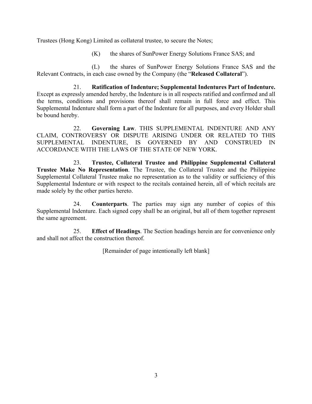3 Trustees (Hong Kong) Limited as collateral trustee, to secure the Notes; (K) the shares of SunPower Energy Solutions France SAS; and (L) the shares of SunPower Energy Solutions France SAS and the Relevant Contracts, in each case owned by the Company (the “Released Collateral”). 21. Ratification of Indenture; Supplemental Indentures Part of Indenture. Except as expressly amended hereby, the Indenture is in all respects ratified and confirmed and all the terms, conditions and provisions thereof shall remain in full force and effect. This Supplemental Indenture shall form a part of the Indenture for all purposes, and every Holder shall be bound hereby. 22. Governing Law. THIS SUPPLEMENTAL INDENTURE AND ANY CLAIM, CONTROVERSY OR DISPUTE ARISING UNDER OR RELATED TO THIS SUPPLEMENTAL INDENTURE, IS GOVERNED BY AND CONSTRUED IN ACCORDANCE WITH THE LAWS OF THE STATE OF NEW YORK. 23. Trustee, Collateral Trustee and Philippine Supplemental Collateral Trustee Make No Representation. The Trustee, the Collateral Trustee and the Philippine Supplemental Collateral Trustee make no representation as to the validity or sufficiency of this Supplemental Indenture or with respect to the recitals contained herein, all of which recitals are made solely by the other parties hereto. 24. Counterparts. The parties may sign any number of copies of this Supplemental Indenture. Each signed copy shall be an original, but all of them together represent the same agreement. 25. Effect of Headings. The Section headings herein are for convenience only and shall not affect the construction thereof. [Remainder of page intentionally left blank]