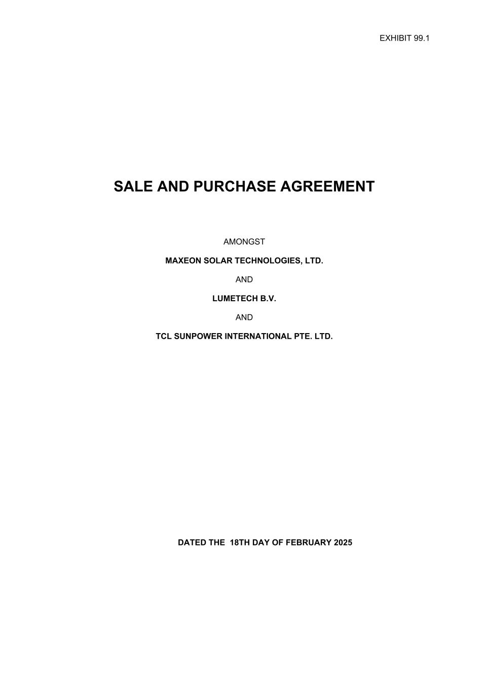 EXHIBIT 99.1 SALE AND PURCHASE AGREEMENT AMONGST MAXEON SOLAR TECHNOLOGIES, LTD. AND LUMETECH B.V. AND TCL SUNPOWER INTERNATIONAL PTE. LTD. DATED THE 18TH DAY OF FEBRUARY 2025