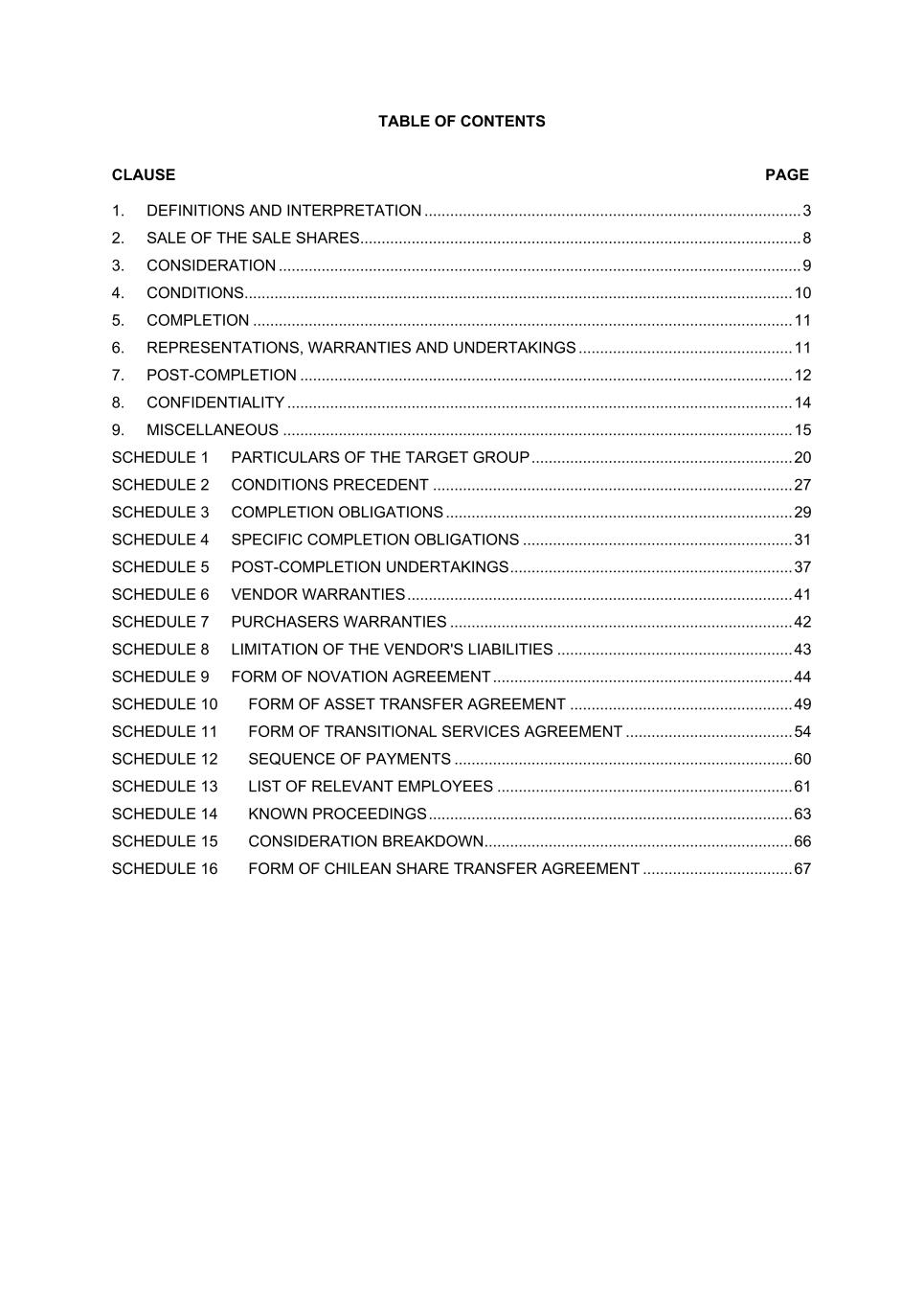 TABLE OF CONTENTS CLAUSE PAGE 1. DEFINITIONS AND INTERPRETATION ........................................................................................ 3 2. SALE OF THE SALE SHARES ....................................................................................................... 8 3. CONSIDERATION .......................................................................................................................... 9 4. CONDITIONS ................................................................................................................................ 10 5. COMPLETION .............................................................................................................................. 11 6. REPRESENTATIONS, WARRANTIES AND UNDERTAKINGS .................................................. 11 7. POST-COMPLETION ................................................................................................................... 12 8. CONFIDENTIALITY ...................................................................................................................... 14 9. MISCELLANEOUS ....................................................................................................................... 15 SCHEDULE 1 PARTICULARS OF THE TARGET GROUP ............................................................. 20 SCHEDULE 2 CONDITIONS PRECEDENT .................................................................................... 27 SCHEDULE 3 COMPLETION OBLIGATIONS ................................................................................. 29 SCHEDULE 4 SPECIFIC COMPLETION OBLIGATIONS ............................................................... 31 SCHEDULE 5 POST-COMPLETION UNDERTAKINGS .................................................................. 37 SCHEDULE 6 VENDOR WARRANTIES .......................................................................................... 41 SCHEDULE 7 PURCHASERS WARRANTIES ................................................................................ 42 SCHEDULE 8 LIMITATION OF THE VENDOR'S LIABILITIES ....................................................... 43 SCHEDULE 9 FORM OF NOVATION AGREEMENT ...................................................................... 44 SCHEDULE 10 FORM OF ASSET TRANSFER AGREEMENT .................................................... 49 SCHEDULE 11 FORM OF TRANSITIONAL SERVICES AGREEMENT ....................................... 54 SCHEDULE 12 SEQUENCE OF PAYMENTS ............................................................................... 60 SCHEDULE 13 LIST OF RELEVANT EMPLOYEES ..................................................................... 61 SCHEDULE 14 KNOWN PROCEEDINGS ..................................................................................... 63 SCHEDULE 15 CONSIDERATION BREAKDOWN ........................................................................ 66 SCHEDULE 16 FORM OF CHILEAN SHARE TRANSFER AGREEMENT ................................... 67