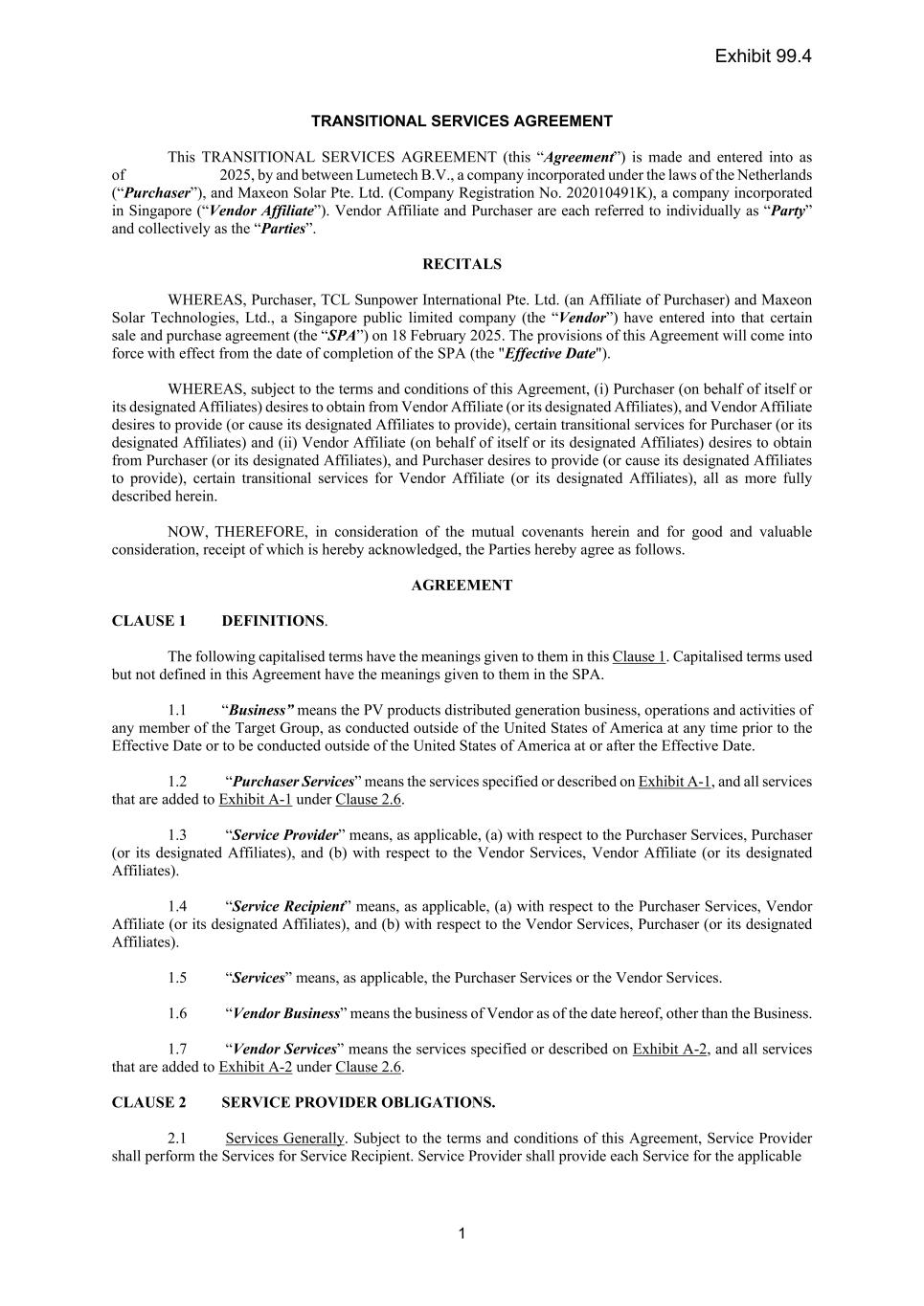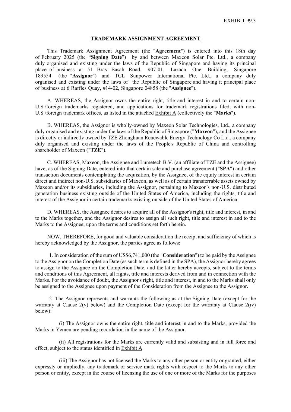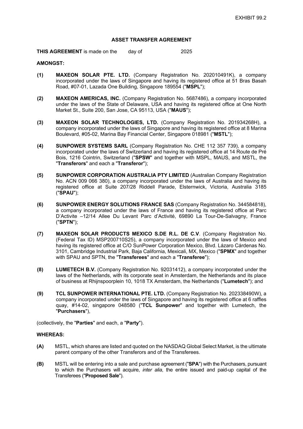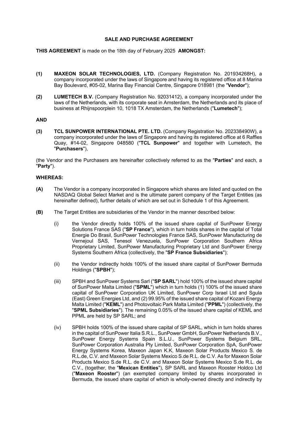 SALE AND PURCHASE AGREEMENT THIS AGREEMENT is made on the 18th day of February 2025 AMONGST: (1) MAXEON SOLAR TECHNOLOGIES, LTD. (Company Registration No. 201934268H), a company incorporated under the laws of Singapore and having its registered office at 8 Marina Bay Boulevard, #05-02, Marina Bay Financial Centre, Singapore 018981 (the "Vendor"); (2) LUMETECH B.V. (Company Registration No. 92031412), a company incorporated under the laws of the Netherlands, with its corporate seat in Amsterdam, the Netherlands and its place of business at Rhijnspoorplein 10, 1018 TX Amsterdam, the Netherlands ("Lumetech"); AND (3) TCL SUNPOWER INTERNATIONAL PTE. LTD. (Company Registration No. 202338490W), a company incorporated under the laws of Singapore and having its registered office at 6 Raffles Quay, #14-02, Singapore 048580 ("TCL Sunpower" and together with Lumetech, the "Purchasers"), (the Vendor and the Purchasers are hereinafter collectively referred to as the "Parties" and each, a "Party"). WHEREAS: (A) The Vendor is a company incorporated in Singapore which shares are listed and quoted on the NASDAQ Global Select Market and is the ultimate parent company of the Target Entities (as hereinafter defined), further details of which are set out in Schedule 1 of this Agreement. (B) The Target Entities are subsidiaries of the Vendor in the manner described below: (i) the Vendor directly holds 100% of the issued share capital of SunPower Energy Solutions France SAS ("SP France"), which in turn holds shares in the capital of Total Energie Do Brasil, SunPower Technologies France SAS, SunPower Manufacturing de Vernejoul SAS, Tenesol Venezuela, SunPower Corporation Southern Africa Proprietary Limited, SunPower Manufacturing Proprietary Ltd and SunPower Energy Systems Southern Africa (collectively, the "SP France Subsidiaries"); (ii) the Vendor indirectly holds 100% of the issued share capital of SunPower Bermuda Holdings ("SPBH"); (iii) SPBH and SunPower Systems Sarl ("SP SARL") hold 100% of the issued share capital of SunPower Malta Limited ("SPML") which in turn holds (1) 100% of the issued share capital of SunPower Corporation UK Limited, SunPower Corp Israel Ltd and Sgula (East) Green Energies Ltd, and (2) 99.95% of the issued share capital of Kozani Energy Malta Limited ("KEML") and Photovoltaic Park Malta Limited ("PPML") (collectively, the "SPML Subsidiaries"). The remaining 0.05% of the issued share capital of KEML and PPML are held by SP SARL; and (iv) SPBH holds 100% of the issued share capital of SP SARL, which in turn holds shares in the capital of SunPower Italia S.R.L., SunPower GmbH, SunPower Netherlands B.V., SunPower Energy Systems Spain S.L.U., SunPower Systems Belgium SRL, SunPower Corporation Australia Pty Limited, SunPower Corporation SpA, SunPower Energy Systems Korea, Maxeon Japan K.K, Maxeon Solar Products Mexico S. de R.L.de, C.V. and Maxeon Solar Systems Mexico S.de R.L. de C.V. As for Maxeon Solar Products Mexico S.de R.L. de C.V. and Maxeon Solar Systems Mexico S.de R.L. de C.V., (together, the "Mexican Entities"), SP SARL and Maxeon Rooster Holdco Ltd ("Maxeon Rooster") (an exempted company limited by shares incorporated in Bermuda, the issued share capital of which is wholly-owned directly and indirectly by