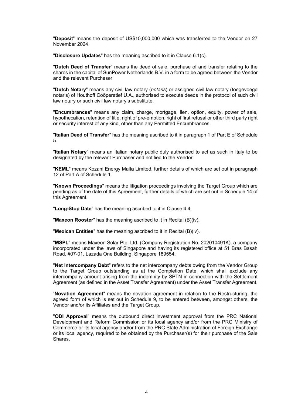 4 "Deposit" means the deposit of US$10,000,000 which was transferred to the Vendor on 27 November 2024. "Disclosure Updates" has the meaning ascribed to it in Clause 6.1(c). "Dutch Deed of Transfer" means the deed of sale, purchase of and transfer relating to the shares in the capital of SunPower Netherlands B.V. in a form to be agreed between the Vendor and the relevant Purchaser. "Dutch Notary" means any civil law notary (notaris) or assigned civil law notary (toegevoegd notaris) of Houthoff Coöperatief U.A., authorised to execute deeds in the protocol of such civil law notary or such civil law notary’s substitute. "Encumbrances" means any claim, charge, mortgage, lien, option, equity, power of sale, hypothecation, retention of title, right of pre-emption, right of first refusal or other third party right or security interest of any kind, other than any Permitted Encumbrances. "Italian Deed of Transfer" has the meaning ascribed to it in paragraph 1 of Part E of Schedule 5. "Italian Notary" means an Italian notary public duly authorised to act as such in Italy to be designated by the relevant Purchaser and notified to the Vendor. "KEML" means Kozani Energy Malta Limited, further details of which are set out in paragraph 12 of Part A of Schedule 1. "Known Proceedings" means the litigation proceedings involving the Target Group which are pending as of the date of this Agreement, further details of which are set out in Schedule 14 of this Agreement. "Long-Stop Date" has the meaning ascribed to it in Clause 4.4. "Maxeon Rooster" has the meaning ascribed to it in Recital (B)(iv). "Mexican Entities" has the meaning ascribed to it in Recital (B)(iv). "MSPL" means Maxeon Solar Pte. Ltd. (Company Registration No. 202010491K), a company incorporated under the laws of Singapore and having its registered office at 51 Bras Basah Road, #07-01, Lazada One Building, Singapore 189554. "Net Intercompany Debt" refers to the net intercompany debts owing from the Vendor Group to the Target Group outstanding as at the Completion Date, which shall exclude any intercompany amount arising from the indemnity by SPTN in connection with the Settlement Agreement (as defined in the Asset Transfer Agreement) under the Asset Transfer Agreement. "Novation Agreement" means the novation agreement in relation to the Restructuring, the agreed form of which is set out in Schedule 9, to be entered between, amongst others, the Vendor and/or its Affiliates and the Target Group. "ODI Approval" means the outbound direct investment approval from the PRC National Development and Reform Commission or its local agency and/or from the PRC Ministry of Commerce or its local agency and/or from the PRC State Administration of Foreign Exchange or its local agency, required to be obtained by the Purchaser(s) for their purchase of the Sale Shares.