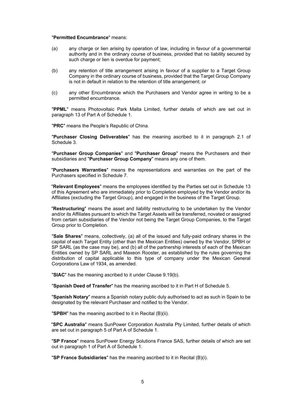 5 "Permitted Encumbrance" means: (a) any charge or lien arising by operation of law, including in favour of a governmental authority and in the ordinary course of business, provided that no liability secured by such charge or lien is overdue for payment; (b) any retention of title arrangement arising in favour of a supplier to a Target Group Company in the ordinary course of business, provided that the Target Group Company is not in default in relation to the retention of title arrangement; or (c) any other Encumbrance which the Purchasers and Vendor agree in writing to be a permitted encumbrance. "PPML" means Photovoltaic Park Malta Limited, further details of which are set out in paragraph 13 of Part A of Schedule 1. "PRC" means the People’s Republic of China. "Purchaser Closing Deliverables" has the meaning ascribed to it in paragraph 2.1 of Schedule 3. "Purchaser Group Companies" and "Purchaser Group" means the Purchasers and their subsidiaries and "Purchaser Group Company" means any one of them. "Purchasers Warranties" means the representations and warranties on the part of the Purchasers specified in Schedule 7. "Relevant Employees" means the employees identified by the Parties set out in Schedule 13 of this Agreement who are immediately prior to Completion employed by the Vendor and/or its Affiliates (excluding the Target Group), and engaged in the business of the Target Group. "Restructuring" means the asset and liability restructuring to be undertaken by the Vendor and/or its Affiliates pursuant to which the Target Assets will be transferred, novated or assigned from certain subsidiaries of the Vendor not being the Target Group Companies, to the Target Group prior to Completion. "Sale Shares" means, collectively, (a) all of the issued and fully-paid ordinary shares in the capital of each Target Entity (other than the Mexican Entities) owned by the Vendor, SPBH or SP SARL (as the case may be), and (b) all of the partnership interests of each of the Mexican Entities owned by SP SARL and Maxeon Rooster, as established by the rules governing the distribution of capital applicable to this type of company under the Mexican General Corporations Law of 1934, as amended. "SIAC" has the meaning ascribed to it under Clause 9.19(b). "Spanish Deed of Transfer" has the meaning ascribed to it in Part H of Schedule 5. "Spanish Notary" means a Spanish notary public duly authorised to act as such in Spain to be designated by the relevant Purchaser and notified to the Vendor. "SPBH" has the meaning ascribed to it in Recital (B)(ii). "SPC Australia" means SunPower Corporation Australia Pty Limited, further details of which are set out in paragraph 5 of Part A of Schedule 1. "SP France" means SunPower Energy Solutions France SAS, further details of which are set out in paragraph 1 of Part A of Schedule 1. "SP France Subsidiaries" has the meaning ascribed to it in Recital (B)(i).