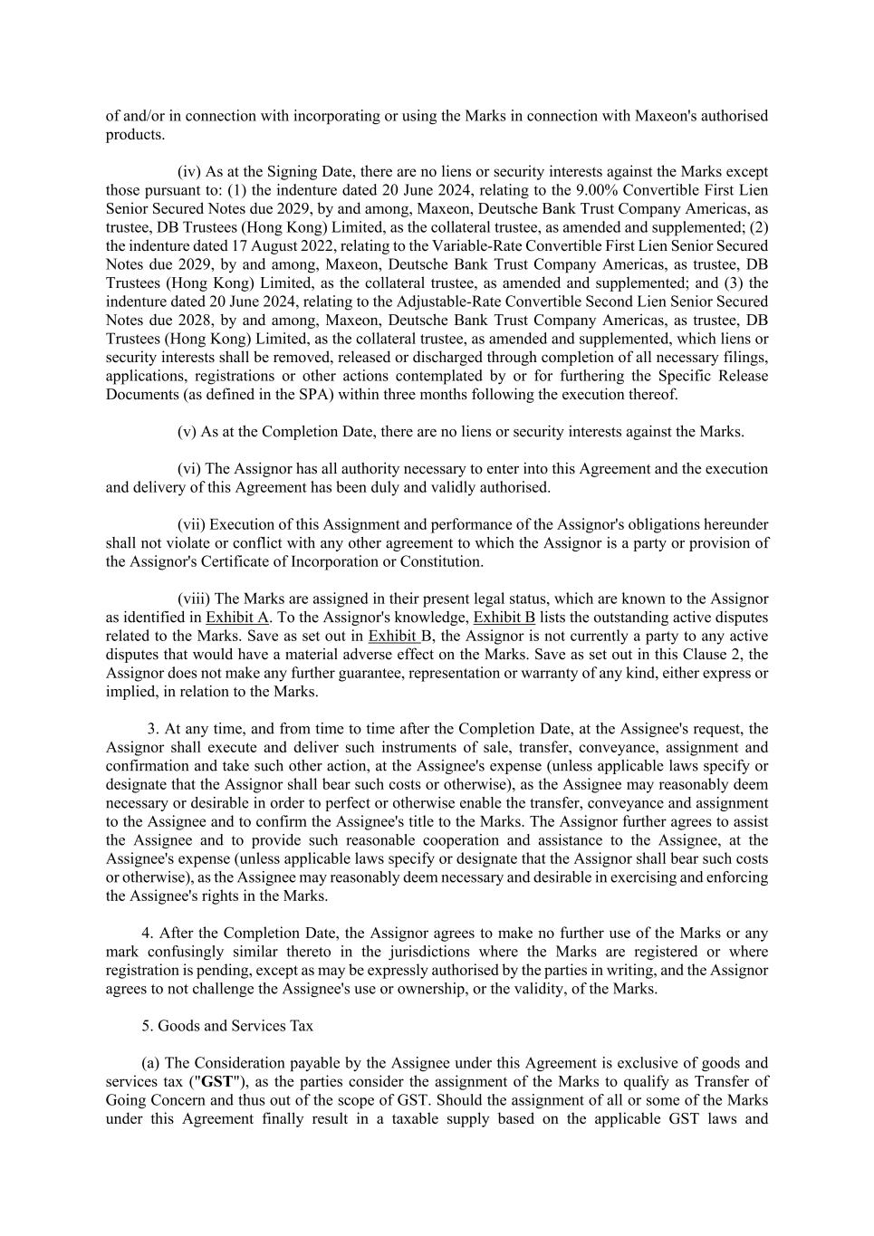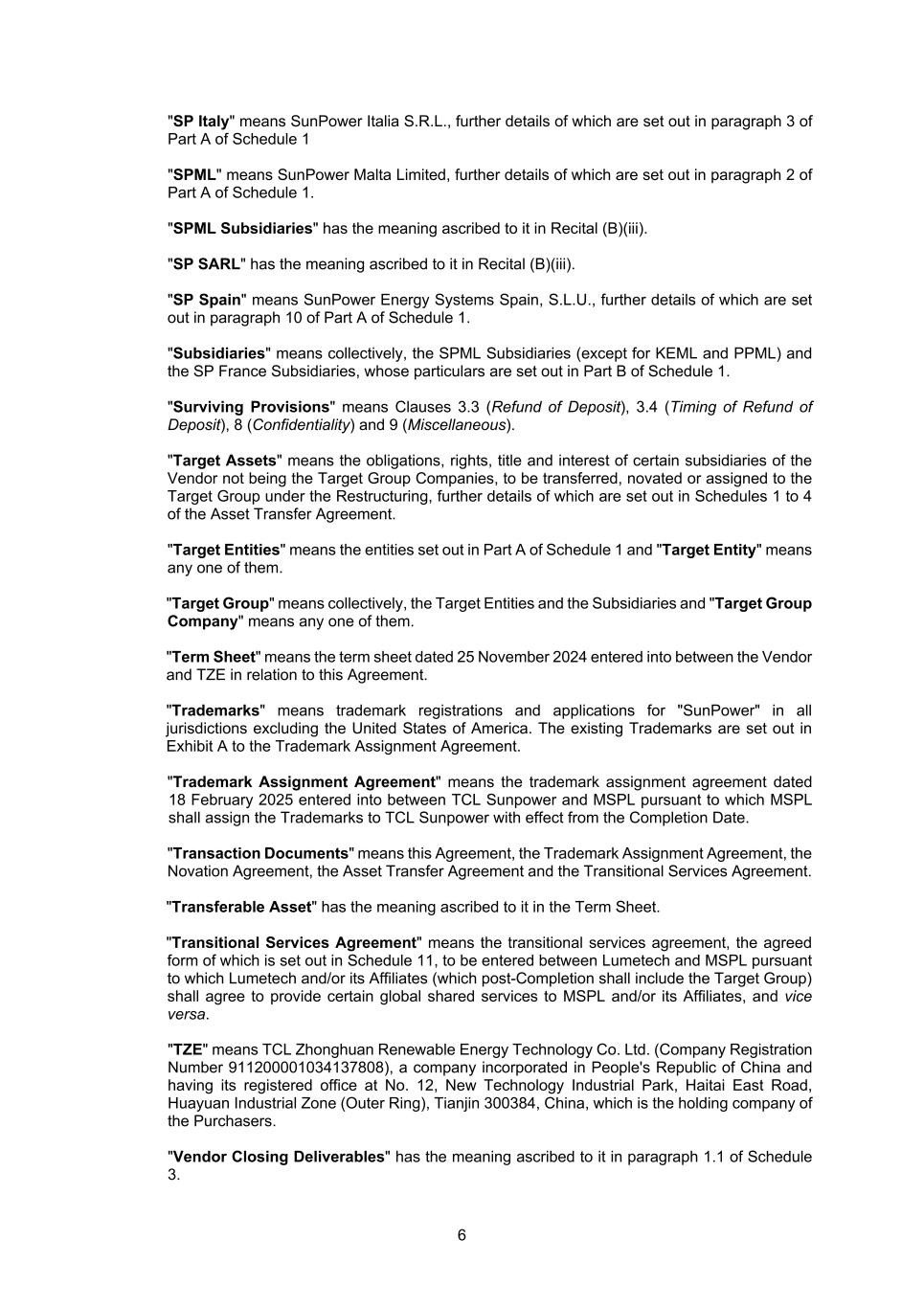 6 "SP Italy" means SunPower Italia S.R.L., further details of which are set out in paragraph 3 of Part A of Schedule 1 "SPML" means SunPower Malta Limited, further details of which are set out in paragraph 2 of Part A of Schedule 1. "SPML Subsidiaries" has the meaning ascribed to it in Recital (B)(iii). "SP SARL" has the meaning ascribed to it in Recital (B)(iii). "SP Spain" means SunPower Energy Systems Spain, S.L.U., further details of which are set out in paragraph 10 of Part A of Schedule 1. "Subsidiaries" means collectively, the SPML Subsidiaries (except for KEML and PPML) and the SP France Subsidiaries, whose particulars are set out in Part B of Schedule 1. "Surviving Provisions" means Clauses 3.3 (Refund of Deposit), 3.4 (Timing of Refund of Deposit), 8 (Confidentiality) and 9 (Miscellaneous). "Target Assets" means the obligations, rights, title and interest of certain subsidiaries of the Vendor not being the Target Group Companies, to be transferred, novated or assigned to the Target Group under the Restructuring, further details of which are set out in Schedules 1 to 4 of the Asset Transfer Agreement. "Target Entities" means the entities set out in Part A of Schedule 1 and "Target Entity" means any one of them. "Target Group" means collectively, the Target Entities and the Subsidiaries and "Target Group Company" means any one of them. "Term Sheet" means the term sheet dated 25 November 2024 entered into between the Vendor and TZE in relation to this Agreement. "Trademarks" means trademark registrations and applications for "SunPower" in all jurisdictions excluding the United States of America. The existing Trademarks are set out in Exhibit A to the Trademark Assignment Agreement. "Trademark Assignment Agreement" means the trademark assignment agreement dated 18 February 2025 entered into between TCL Sunpower and MSPL pursuant to which MSPL shall assign the Trademarks to TCL Sunpower with effect from the Completion Date. "Transaction Documents" means this Agreement, the Trademark Assignment Agreement, the Novation Agreement, the Asset Transfer Agreement and the Transitional Services Agreement. "Transferable Asset" has the meaning ascribed to it in the Term Sheet. "Transitional Services Agreement" means the transitional services agreement, the agreed form of which is set out in Schedule 11, to be entered between Lumetech and MSPL pursuant to which Lumetech and/or its Affiliates (which post-Completion shall include the Target Group) shall agree to provide certain global shared services to MSPL and/or its Affiliates, and vice versa. "TZE" means TCL Zhonghuan Renewable Energy Technology Co. Ltd. (Company Registration Number 911200001034137808), a company incorporated in People's Republic of China and having its registered office at No. 12, New Technology Industrial Park, Haitai East Road, Huayuan Industrial Zone (Outer Ring), Tianjin 300384, China, which is the holding company of the Purchasers. "Vendor Closing Deliverables" has the meaning ascribed to it in paragraph 1.1 of Schedule 3.