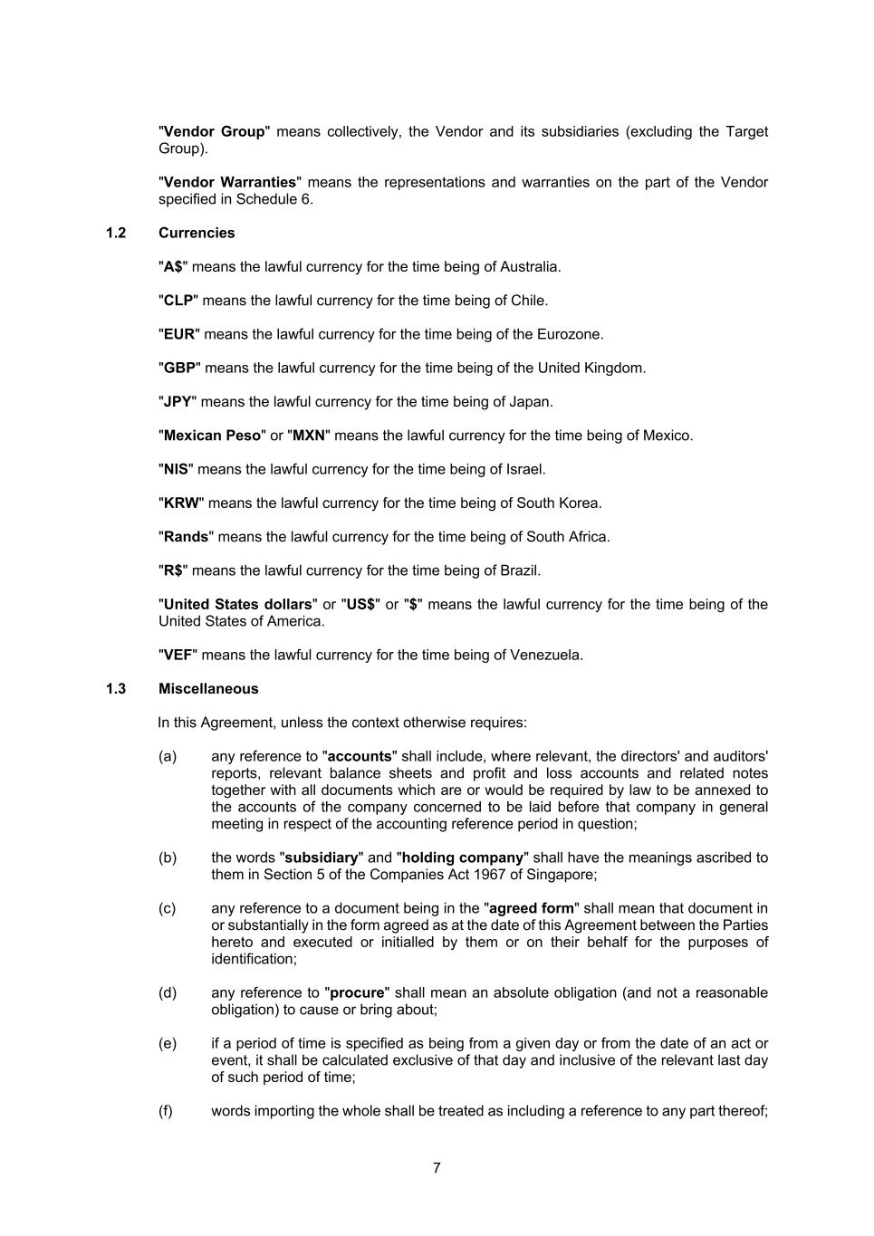 7 "Vendor Group" means collectively, the Vendor and its subsidiaries (excluding the Target Group). "Vendor Warranties" means the representations and warranties on the part of the Vendor specified in Schedule 6. 1.2 Currencies "A$" means the lawful currency for the time being of Australia. "CLP" means the lawful currency for the time being of Chile. "EUR" means the lawful currency for the time being of the Eurozone. "GBP" means the lawful currency for the time being of the United Kingdom. "JPY" means the lawful currency for the time being of Japan. "Mexican Peso" or "MXN" means the lawful currency for the time being of Mexico. "NIS" means the lawful currency for the time being of Israel. "KRW" means the lawful currency for the time being of South Korea. "Rands" means the lawful currency for the time being of South Africa. "R$" means the lawful currency for the time being of Brazil. "United States dollars" or "US$" or "$" means the lawful currency for the time being of the United States of America. "VEF" means the lawful currency for the time being of Venezuela. 1.3 Miscellaneous In this Agreement, unless the context otherwise requires: (a) any reference to "accounts" shall include, where relevant, the directors' and auditors' reports, relevant balance sheets and profit and loss accounts and related notes together with all documents which are or would be required by law to be annexed to the accounts of the company concerned to be laid before that company in general meeting in respect of the accounting reference period in question; (b) the words "subsidiary" and "holding company" shall have the meanings ascribed to them in Section 5 of the Companies Act 1967 of Singapore; (c) any reference to a document being in the "agreed form" shall mean that document in or substantially in the form agreed as at the date of this Agreement between the Parties hereto and executed or initialled by them or on their behalf for the purposes of identification; (d) any reference to "procure" shall mean an absolute obligation (and not a reasonable obligation) to cause or bring about; (e) if a period of time is specified as being from a given day or from the date of an act or event, it shall be calculated exclusive of that day and inclusive of the relevant last day of such period of time; (f) words importing the whole shall be treated as including a reference to any part thereof;