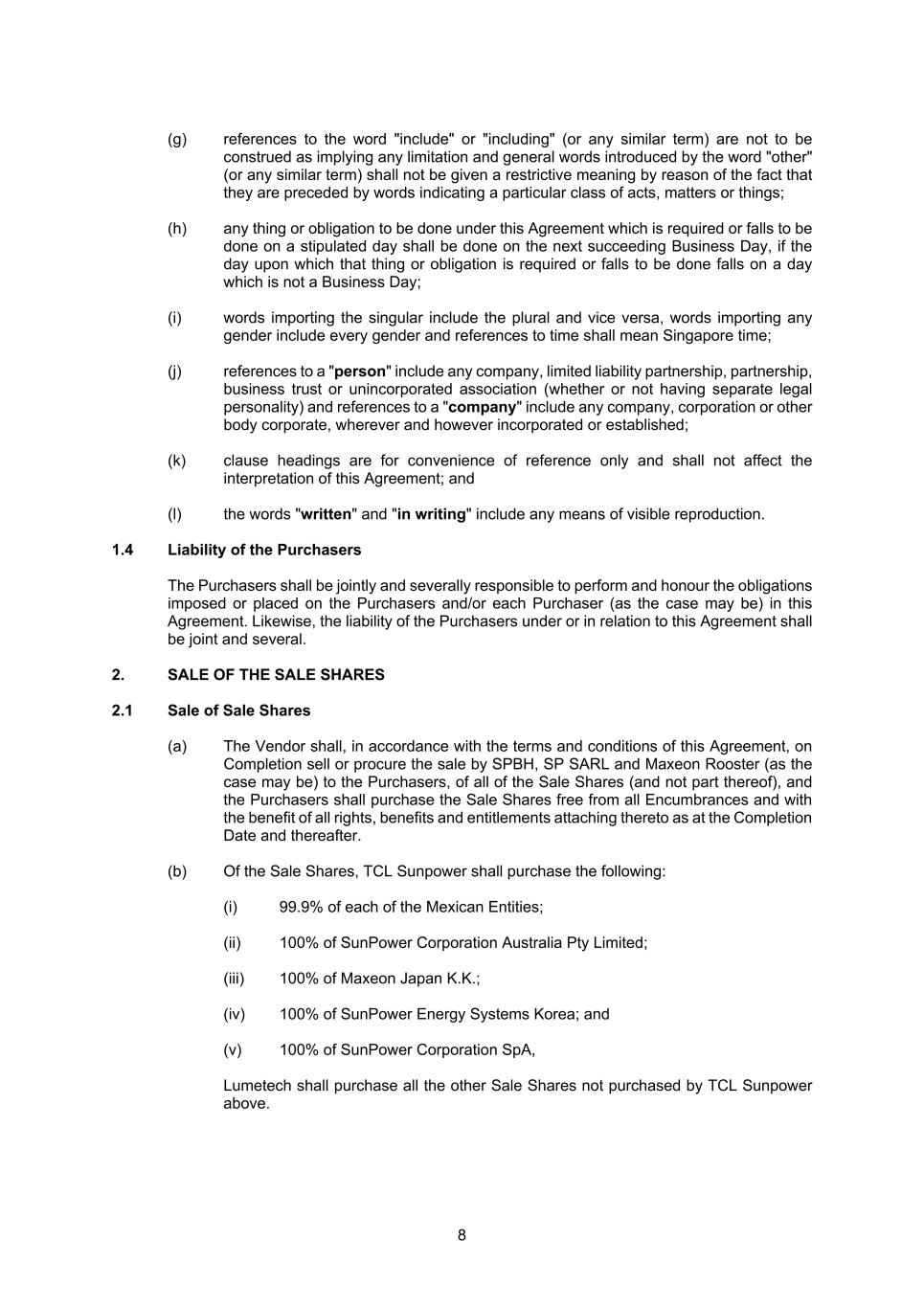 8 (g) references to the word "include" or "including" (or any similar term) are not to be construed as implying any limitation and general words introduced by the word "other" (or any similar term) shall not be given a restrictive meaning by reason of the fact that they are preceded by words indicating a particular class of acts, matters or things; (h) any thing or obligation to be done under this Agreement which is required or falls to be done on a stipulated day shall be done on the next succeeding Business Day, if the day upon which that thing or obligation is required or falls to be done falls on a day which is not a Business Day; (i) words importing the singular include the plural and vice versa, words importing any gender include every gender and references to time shall mean Singapore time; (j) references to a "person" include any company, limited liability partnership, partnership, business trust or unincorporated association (whether or not having separate legal personality) and references to a "company" include any company, corporation or other body corporate, wherever and however incorporated or established; (k) clause headings are for convenience of reference only and shall not affect the interpretation of this Agreement; and (l) the words "written" and "in writing" include any means of visible reproduction. 1.4 Liability of the Purchasers The Purchasers shall be jointly and severally responsible to perform and honour the obligations imposed or placed on the Purchasers and/or each Purchaser (as the case may be) in this Agreement. Likewise, the liability of the Purchasers under or in relation to this Agreement shall be joint and several. 2. SALE OF THE SALE SHARES 2.1 Sale of Sale Shares (a) The Vendor shall, in accordance with the terms and conditions of this Agreement, on Completion sell or procure the sale by SPBH, SP SARL and Maxeon Rooster (as the case may be) to the Purchasers, of all of the Sale Shares (and not part thereof), and the Purchasers shall purchase the Sale Shares free from all Encumbrances and with the benefit of all rights, benefits and entitlements attaching thereto as at the Completion Date and thereafter. (b) Of the Sale Shares, TCL Sunpower shall purchase the following: (i) 99.9% of each of the Mexican Entities; (ii) 100% of SunPower Corporation Australia Pty Limited; (iii) 100% of Maxeon Japan K.K.; (iv) 100% of SunPower Energy Systems Korea; and (v) 100% of SunPower Corporation SpA, Lumetech shall purchase all the other Sale Shares not purchased by TCL Sunpower above.