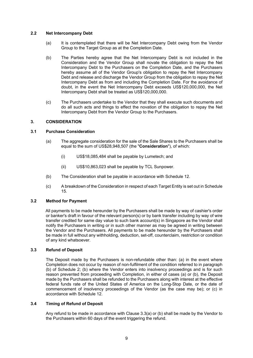 9 2.2 Net Intercompany Debt (a) It is contemplated that there will be Net Intercompany Debt owing from the Vendor Group to the Target Group as at the Completion Date. (b) The Parties hereby agree that the Net Intercompany Debt is not included in the Consideration and the Vendor Group shall novate the obligation to repay the Net Intercompany Debt to the Purchasers on the Completion Date, and the Purchasers hereby assume all of the Vendor Group's obligation to repay the Net Intercompany Debt and release and discharge the Vendor Group from the obligation to repay the Net Intercompany Debt as from and including the Completion Date. For the avoidance of doubt, in the event the Net Intercompany Debt exceeds US$120,000,000, the Net Intercompany Debt shall be treated as US$120,000,000. (c) The Purchasers undertake to the Vendor that they shall execute such documents and do all such acts and things to effect the novation of the obligation to repay the Net Intercompany Debt from the Vendor Group to the Purchasers. 3. CONSIDERATION 3.1 Purchase Consideration (a) The aggregate consideration for the sale of the Sale Shares to the Purchasers shall be equal to the sum of US$28,948,507 (the "Consideration"), of which: (i) US$18,085,484 shall be payable by Lumetech; and (ii) US$10,863,023 shall be payable by TCL Sunpower. (b) The Consideration shall be payable in accordance with Schedule 12. (c) A breakdown of the Consideration in respect of each Target Entity is set out in Schedule 15. 3.2 Method for Payment All payments to be made hereunder by the Purchasers shall be made by way of cashier's order or banker's draft in favour of the relevant person(s) or by bank transfer including by way of wire transfer credited for same day value to such bank account(s) in Singapore as the Vendor shall notify the Purchasers in writing or in such other manner as may be agreed in writing between the Vendor and the Purchasers. All payments to be made hereunder by the Purchasers shall be made in full without any withholding, deduction, set-off, counterclaim, restriction or condition of any kind whatsoever. 3.3 Refund of Deposit The Deposit made by the Purchasers is non-refundable other than: (a) in the event where Completion does not occur by reason of non-fulfilment of the condition referred to in paragraph (b) of Schedule 2; (b) where the Vendor enters into insolvency proceedings and is for such reason prevented from proceeding with Completion, in either of cases (a) or (b), the Deposit made by the Purchasers shall be refunded to the Purchasers along with interest at the effective federal funds rate of the United States of America on the Long-Stop Date, or the date of commencement of insolvency proceedings of the Vendor (as the case may be); or (c) in accordance with Schedule 12. 3.4 Timing of Refund of Deposit Any refund to be made in accordance with Clause 3.3(a) or (b) shall be made by the Vendor to the Purchasers within 60 days of the event triggering the refund.