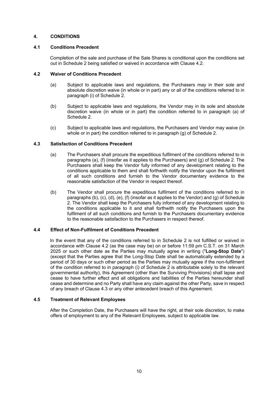 10 4. CONDITIONS 4.1 Conditions Precedent Completion of the sale and purchase of the Sale Shares is conditional upon the conditions set out in Schedule 2 being satisfied or waived in accordance with Clause 4.2. 4.2 Waiver of Conditions Precedent (a) Subject to applicable laws and regulations, the Purchasers may in their sole and absolute discretion waive (in whole or in part) any or all of the conditions referred to in paragraph (i) of Schedule 2. (b) Subject to applicable laws and regulations, the Vendor may in its sole and absolute discretion waive (in whole or in part) the condition referred to in paragraph (a) of Schedule 2. (c) Subject to applicable laws and regulations, the Purchasers and Vendor may waive (in whole or in part) the condition referred to in paragraph (g) of Schedule 2. 4.3 Satisfaction of Conditions Precedent (a) The Purchasers shall procure the expeditious fulfilment of the conditions referred to in paragraphs (a), (f) (insofar as it applies to the Purchasers) and (g) of Schedule 2. The Purchasers shall keep the Vendor fully informed of any development relating to the conditions applicable to them and shall forthwith notify the Vendor upon the fulfilment of all such conditions and furnish to the Vendor documentary evidence to the reasonable satisfaction of the Vendor in respect thereof. (b) The Vendor shall procure the expeditious fulfilment of the conditions referred to in paragraphs (b), (c), (d), (e), (f) (insofar as it applies to the Vendor) and (g) of Schedule 2. The Vendor shall keep the Purchasers fully informed of any development relating to the conditions applicable to it and shall forthwith notify the Purchasers upon the fulfilment of all such conditions and furnish to the Purchasers documentary evidence to the reasonable satisfaction to the Purchasers in respect thereof. 4.4 Effect of Non-Fulfilment of Conditions Precedent In the event that any of the conditions referred to in Schedule 2 is not fulfilled or waived in accordance with Clause 4.2 (as the case may be) on or before 11:59 pm C.S.T. on 31 March 2025 or such other date as the Parties may mutually agree in writing ("Long-Stop Date") (except that the Parties agree that the Long-Stop Date shall be automatically extended by a period of 30 days or such other period as the Parties may mutually agree if the non-fulfilment of the condition referred to in paragraph (i) of Schedule 2 is attributable solely to the relevant governmental authority), this Agreement (other than the Surviving Provisions) shall lapse and cease to have further effect and all obligations and liabilities of the Parties hereunder shall cease and determine and no Party shall have any claim against the other Party, save in respect of any breach of Clause 4.3 or any other antecedent breach of this Agreement. 4.5 Treatment of Relevant Employees After the Completion Date, the Purchasers will have the right, at their sole discretion, to make offers of employment to any of the Relevant Employees, subject to applicable law.