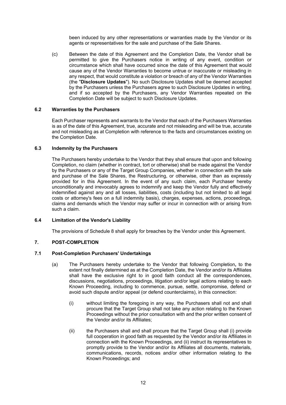 12 been induced by any other representations or warranties made by the Vendor or its agents or representatives for the sale and purchase of the Sale Shares. (c) Between the date of this Agreement and the Completion Date, the Vendor shall be permitted to give the Purchasers notice in writing of any event, condition or circumstance which shall have occurred since the date of this Agreement that would cause any of the Vendor Warranties to become untrue or inaccurate or misleading in any respect, that would constitute a violation or breach of any of the Vendor Warranties (the "Disclosure Updates"). No such Disclosure Updates shall be deemed accepted by the Purchasers unless the Purchasers agree to such Disclosure Updates in writing, and if so accepted by the Purchasers, any Vendor Warranties repeated on the Completion Date will be subject to such Disclosure Updates. 6.2 Warranties by the Purchasers Each Purchaser represents and warrants to the Vendor that each of the Purchasers Warranties is as of the date of this Agreement, true, accurate and not misleading and will be true, accurate and not misleading as at Completion with reference to the facts and circumstances existing on the Completion Date. 6.3 Indemnity by the Purchasers The Purchasers hereby undertake to the Vendor that they shall ensure that upon and following Completion, no claim (whether in contract, tort or otherwise) shall be made against the Vendor by the Purchasers or any of the Target Group Companies, whether in connection with the sale and purchase of the Sale Shares, the Restructuring, or otherwise, other than as expressly provided for in this Agreement. In the event of any such claim, each Purchaser hereby unconditionally and irrevocably agrees to indemnify and keep the Vendor fully and effectively indemnified against any and all losses, liabilities, costs (including but not limited to all legal costs or attorney's fees on a full indemnity basis), charges, expenses, actions, proceedings, claims and demands which the Vendor may suffer or incur in connection with or arising from such a claim. 6.4 Limitation of the Vendor's Liability The provisions of Schedule 8 shall apply for breaches by the Vendor under this Agreement. 7. POST-COMPLETION 7.1 Post-Completion Purchasers' Undertakings (a) The Purchasers hereby undertake to the Vendor that following Completion, to the extent not finally determined as at the Completion Date, the Vendor and/or its Affiliates shall have the exclusive right to in good faith conduct all the correspondences, discussions, negotiations, proceedings, litigation and/or legal actions relating to each Known Proceeding, including to commence, pursue, settle, compromise, defend or avoid such dispute and/or appeal (or defend counterclaims), in this connection: (i) without limiting the foregoing in any way, the Purchasers shall not and shall procure that the Target Group shall not take any action relating to the Known Proceedings without the prior consultation with and the prior written consent of the Vendor and/or its Affiliates; (ii) the Purchasers shall and shall procure that the Target Group shall (i) provide full cooperation in good faith as requested by the Vendor and/or its Affiliates in connection with the Known Proceedings, and (ii) instruct its representatives to promptly provide to the Vendor and/or its Affiliates all documents, materials, communications, records, notices and/or other information relating to the Known Proceedings; and
