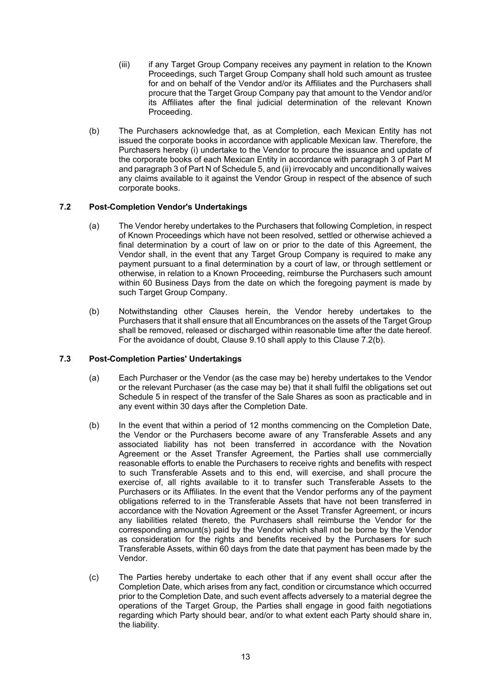 13 (iii) if any Target Group Company receives any payment in relation to the Known Proceedings, such Target Group Company shall hold such amount as trustee for and on behalf of the Vendor and/or its Affiliates and the Purchasers shall procure that the Target Group Company pay that amount to the Vendor and/or its Affiliates after the final judicial determination of the relevant Known Proceeding. (b) The Purchasers acknowledge that, as at Completion, each Mexican Entity has not issued the corporate books in accordance with applicable Mexican law. Therefore, the Purchasers hereby (i) undertake to the Vendor to procure the issuance and update of the corporate books of each Mexican Entity in accordance with paragraph 3 of Part M and paragraph 3 of Part N of Schedule 5, and (ii) irrevocably and unconditionally waives any claims available to it against the Vendor Group in respect of the absence of such corporate books. 7.2 Post-Completion Vendor's Undertakings (a) The Vendor hereby undertakes to the Purchasers that following Completion, in respect of Known Proceedings which have not been resolved, settled or otherwise achieved a final determination by a court of law on or prior to the date of this Agreement, the Vendor shall, in the event that any Target Group Company is required to make any payment pursuant to a final determination by a court of law, or through settlement or otherwise, in relation to a Known Proceeding, reimburse the Purchasers such amount within 60 Business Days from the date on which the foregoing payment is made by such Target Group Company. (b) Notwithstanding other Clauses herein, the Vendor hereby undertakes to the Purchasers that it shall ensure that all Encumbrances on the assets of the Target Group shall be removed, released or discharged within reasonable time after the date hereof. For the avoidance of doubt, Clause 9.10 shall apply to this Clause 7.2(b). 7.3 Post-Completion Parties' Undertakings (a) Each Purchaser or the Vendor (as the case may be) hereby undertakes to the Vendor or the relevant Purchaser (as the case may be) that it shall fulfil the obligations set out Schedule 5 in respect of the transfer of the Sale Shares as soon as practicable and in any event within 30 days after the Completion Date. (b) In the event that within a period of 12 months commencing on the Completion Date, the Vendor or the Purchasers become aware of any Transferable Assets and any associated liability has not been transferred in accordance with the Novation Agreement or the Asset Transfer Agreement, the Parties shall use commercially reasonable efforts to enable the Purchasers to receive rights and benefits with respect to such Transferable Assets and to this end, will exercise, and shall procure the exercise of, all rights available to it to transfer such Transferable Assets to the Purchasers or its Affiliates. In the event that the Vendor performs any of the payment obligations referred to in the Transferable Assets that have not been transferred in accordance with the Novation Agreement or the Asset Transfer Agreement, or incurs any liabilities related thereto, the Purchasers shall reimburse the Vendor for the corresponding amount(s) paid by the Vendor which shall not be borne by the Vendor as consideration for the rights and benefits received by the Purchasers for such Transferable Assets, within 60 days from the date that payment has been made by the Vendor. (c) The Parties hereby undertake to each other that if any event shall occur after the Completion Date, which arises from any fact, condition or circumstance which occurred prior to the Completion Date, and such event affects adversely to a material degree the operations of the Target Group, the Parties shall engage in good faith negotiations regarding which Party should bear, and/or to what extent each Party should share in, the liability.