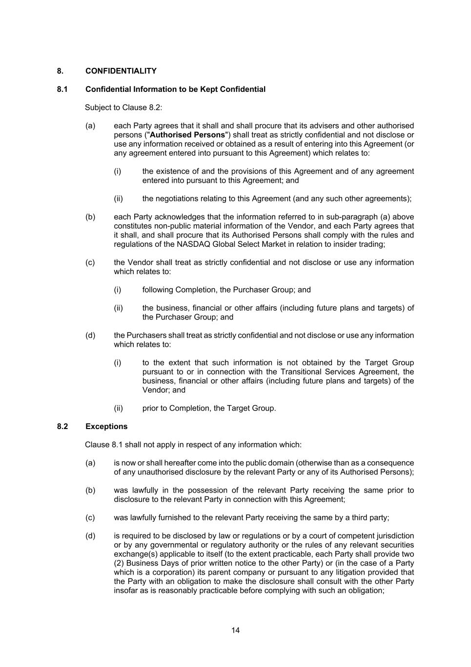 14 8. CONFIDENTIALITY 8.1 Confidential Information to be Kept Confidential Subject to Clause 8.2: (a) each Party agrees that it shall and shall procure that its advisers and other authorised persons ("Authorised Persons") shall treat as strictly confidential and not disclose or use any information received or obtained as a result of entering into this Agreement (or any agreement entered into pursuant to this Agreement) which relates to: (i) the existence of and the provisions of this Agreement and of any agreement entered into pursuant to this Agreement; and (ii) the negotiations relating to this Agreement (and any such other agreements); (b) each Party acknowledges that the information referred to in sub-paragraph (a) above constitutes non-public material information of the Vendor, and each Party agrees that it shall, and shall procure that its Authorised Persons shall comply with the rules and regulations of the NASDAQ Global Select Market in relation to insider trading; (c) the Vendor shall treat as strictly confidential and not disclose or use any information which relates to: (i) following Completion, the Purchaser Group; and (ii) the business, financial or other affairs (including future plans and targets) of the Purchaser Group; and (d) the Purchasers shall treat as strictly confidential and not disclose or use any information which relates to: (i) to the extent that such information is not obtained by the Target Group pursuant to or in connection with the Transitional Services Agreement, the business, financial or other affairs (including future plans and targets) of the Vendor; and (ii) prior to Completion, the Target Group. 8.2 Exceptions Clause 8.1 shall not apply in respect of any information which: (a) is now or shall hereafter come into the public domain (otherwise than as a consequence of any unauthorised disclosure by the relevant Party or any of its Authorised Persons); (b) was lawfully in the possession of the relevant Party receiving the same prior to disclosure to the relevant Party in connection with this Agreement; (c) was lawfully furnished to the relevant Party receiving the same by a third party; (d) is required to be disclosed by law or regulations or by a court of competent jurisdiction or by any governmental or regulatory authority or the rules of any relevant securities exchange(s) applicable to itself (to the extent practicable, each Party shall provide two (2) Business Days of prior written notice to the other Party) or (in the case of a Party which is a corporation) its parent company or pursuant to any litigation provided that the Party with an obligation to make the disclosure shall consult with the other Party insofar as is reasonably practicable before complying with such an obligation;