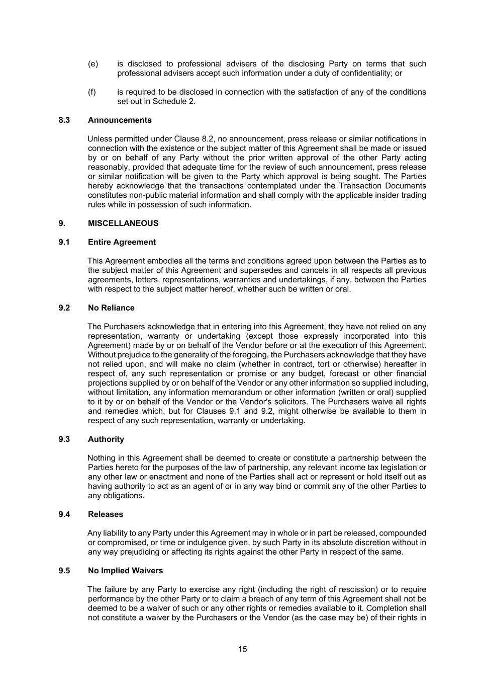 15 (e) is disclosed to professional advisers of the disclosing Party on terms that such professional advisers accept such information under a duty of confidentiality; or (f) is required to be disclosed in connection with the satisfaction of any of the conditions set out in Schedule 2. 8.3 Announcements Unless permitted under Clause 8.2, no announcement, press release or similar notifications in connection with the existence or the subject matter of this Agreement shall be made or issued by or on behalf of any Party without the prior written approval of the other Party acting reasonably, provided that adequate time for the review of such announcement, press release or similar notification will be given to the Party which approval is being sought. The Parties hereby acknowledge that the transactions contemplated under the Transaction Documents constitutes non-public material information and shall comply with the applicable insider trading rules while in possession of such information. 9. MISCELLANEOUS 9.1 Entire Agreement This Agreement embodies all the terms and conditions agreed upon between the Parties as to the subject matter of this Agreement and supersedes and cancels in all respects all previous agreements, letters, representations, warranties and undertakings, if any, between the Parties with respect to the subject matter hereof, whether such be written or oral. 9.2 No Reliance The Purchasers acknowledge that in entering into this Agreement, they have not relied on any representation, warranty or undertaking (except those expressly incorporated into this Agreement) made by or on behalf of the Vendor before or at the execution of this Agreement. Without prejudice to the generality of the foregoing, the Purchasers acknowledge that they have not relied upon, and will make no claim (whether in contract, tort or otherwise) hereafter in respect of, any such representation or promise or any budget, forecast or other financial projections supplied by or on behalf of the Vendor or any other information so supplied including, without limitation, any information memorandum or other information (written or oral) supplied to it by or on behalf of the Vendor or the Vendor's solicitors. The Purchasers waive all rights and remedies which, but for Clauses 9.1 and 9.2, might otherwise be available to them in respect of any such representation, warranty or undertaking. 9.3 Authority Nothing in this Agreement shall be deemed to create or constitute a partnership between the Parties hereto for the purposes of the law of partnership, any relevant income tax legislation or any other law or enactment and none of the Parties shall act or represent or hold itself out as having authority to act as an agent of or in any way bind or commit any of the other Parties to any obligations. 9.4 Releases Any liability to any Party under this Agreement may in whole or in part be released, compounded or compromised, or time or indulgence given, by such Party in its absolute discretion without in any way prejudicing or affecting its rights against the other Party in respect of the same. 9.5 No Implied Waivers The failure by any Party to exercise any right (including the right of rescission) or to require performance by the other Party or to claim a breach of any term of this Agreement shall not be deemed to be a waiver of such or any other rights or remedies available to it. Completion shall not constitute a waiver by the Purchasers or the Vendor (as the case may be) of their rights in