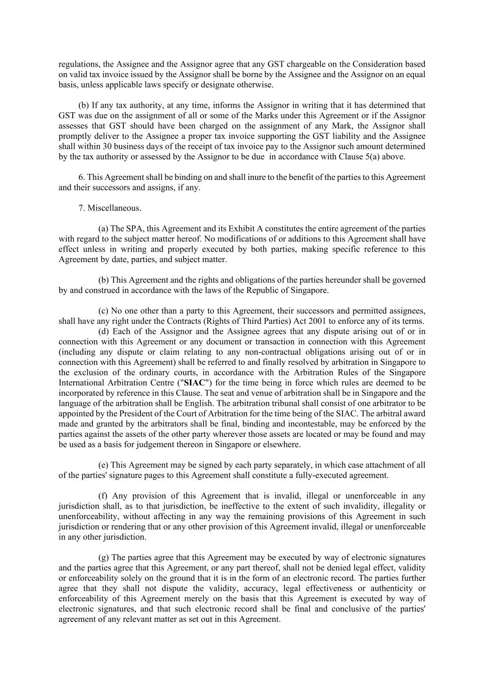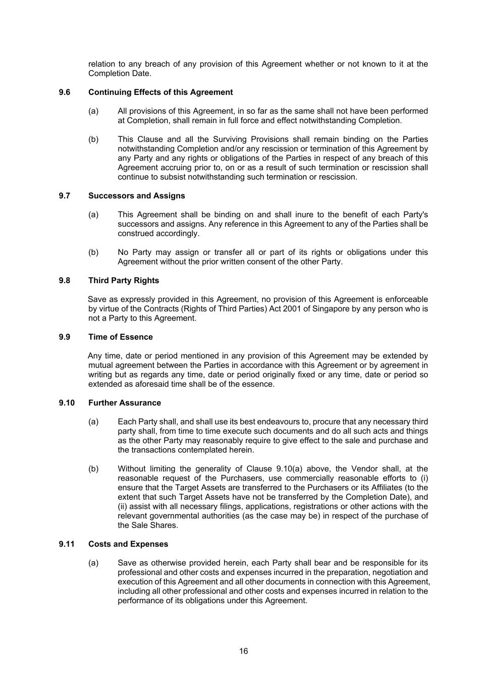 16 relation to any breach of any provision of this Agreement whether or not known to it at the Completion Date. 9.6 Continuing Effects of this Agreement (a) All provisions of this Agreement, in so far as the same shall not have been performed at Completion, shall remain in full force and effect notwithstanding Completion. (b) This Clause and all the Surviving Provisions shall remain binding on the Parties notwithstanding Completion and/or any rescission or termination of this Agreement by any Party and any rights or obligations of the Parties in respect of any breach of this Agreement accruing prior to, on or as a result of such termination or rescission shall continue to subsist notwithstanding such termination or rescission. 9.7 Successors and Assigns (a) This Agreement shall be binding on and shall inure to the benefit of each Party's successors and assigns. Any reference in this Agreement to any of the Parties shall be construed accordingly. (b) No Party may assign or transfer all or part of its rights or obligations under this Agreement without the prior written consent of the other Party. 9.8 Third Party Rights Save as expressly provided in this Agreement, no provision of this Agreement is enforceable by virtue of the Contracts (Rights of Third Parties) Act 2001 of Singapore by any person who is not a Party to this Agreement. 9.9 Time of Essence Any time, date or period mentioned in any provision of this Agreement may be extended by mutual agreement between the Parties in accordance with this Agreement or by agreement in writing but as regards any time, date or period originally fixed or any time, date or period so extended as aforesaid time shall be of the essence. 9.10 Further Assurance (a) Each Party shall, and shall use its best endeavours to, procure that any necessary third party shall, from time to time execute such documents and do all such acts and things as the other Party may reasonably require to give effect to the sale and purchase and the transactions contemplated herein. (b) Without limiting the generality of Clause 9.10(a) above, the Vendor shall, at the reasonable request of the Purchasers, use commercially reasonable efforts to (i) ensure that the Target Assets are transferred to the Purchasers or its Affiliates (to the extent that such Target Assets have not be transferred by the Completion Date), and (ii) assist with all necessary filings, applications, registrations or other actions with the relevant governmental authorities (as the case may be) in respect of the purchase of the Sale Shares. 9.11 Costs and Expenses (a) Save as otherwise provided herein, each Party shall bear and be responsible for its professional and other costs and expenses incurred in the preparation, negotiation and execution of this Agreement and all other documents in connection with this Agreement, including all other professional and other costs and expenses incurred in relation to the performance of its obligations under this Agreement.