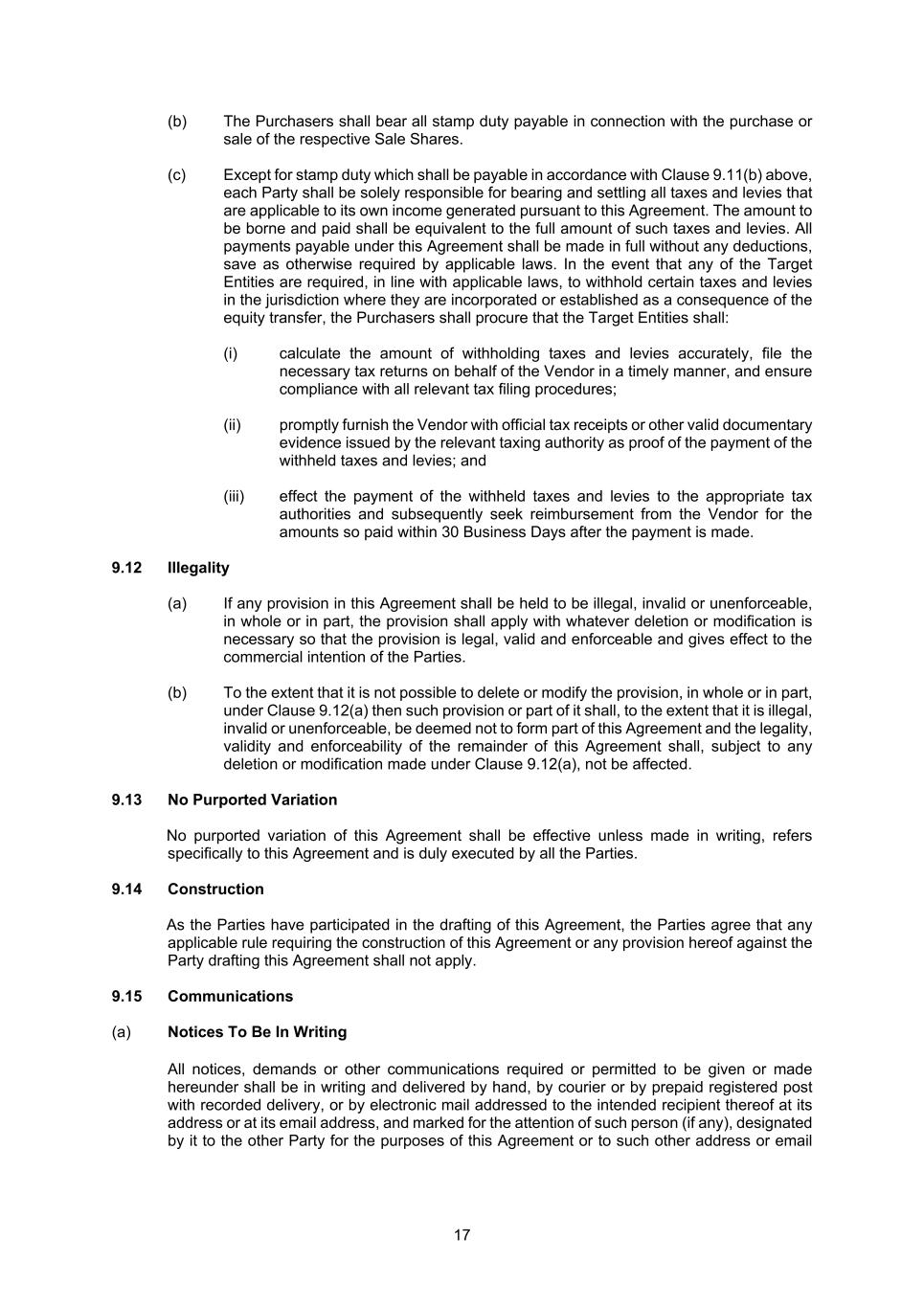 17 (b) The Purchasers shall bear all stamp duty payable in connection with the purchase or sale of the respective Sale Shares. (c) Except for stamp duty which shall be payable in accordance with Clause 9.11(b) above, each Party shall be solely responsible for bearing and settling all taxes and levies that are applicable to its own income generated pursuant to this Agreement. The amount to be borne and paid shall be equivalent to the full amount of such taxes and levies. All payments payable under this Agreement shall be made in full without any deductions, save as otherwise required by applicable laws. In the event that any of the Target Entities are required, in line with applicable laws, to withhold certain taxes and levies in the jurisdiction where they are incorporated or established as a consequence of the equity transfer, the Purchasers shall procure that the Target Entities shall: (i) calculate the amount of withholding taxes and levies accurately, file the necessary tax returns on behalf of the Vendor in a timely manner, and ensure compliance with all relevant tax filing procedures; (ii) promptly furnish the Vendor with official tax receipts or other valid documentary evidence issued by the relevant taxing authority as proof of the payment of the withheld taxes and levies; and (iii) effect the payment of the withheld taxes and levies to the appropriate tax authorities and subsequently seek reimbursement from the Vendor for the amounts so paid within 30 Business Days after the payment is made. 9.12 Illegality (a) If any provision in this Agreement shall be held to be illegal, invalid or unenforceable, in whole or in part, the provision shall apply with whatever deletion or modification is necessary so that the provision is legal, valid and enforceable and gives effect to the commercial intention of the Parties. (b) To the extent that it is not possible to delete or modify the provision, in whole or in part, under Clause 9.12(a) then such provision or part of it shall, to the extent that it is illegal, invalid or unenforceable, be deemed not to form part of this Agreement and the legality, validity and enforceability of the remainder of this Agreement shall, subject to any deletion or modification made under Clause 9.12(a), not be affected. 9.13 No Purported Variation No purported variation of this Agreement shall be effective unless made in writing, refers specifically to this Agreement and is duly executed by all the Parties. 9.14 Construction As the Parties have participated in the drafting of this Agreement, the Parties agree that any applicable rule requiring the construction of this Agreement or any provision hereof against the Party drafting this Agreement shall not apply. 9.15 Communications (a) Notices To Be In Writing All notices, demands or other communications required or permitted to be given or made hereunder shall be in writing and delivered by hand, by courier or by prepaid registered post with recorded delivery, or by electronic mail addressed to the intended recipient thereof at its address or at its email address, and marked for the attention of such person (if any), designated by it to the other Party for the purposes of this Agreement or to such other address or email