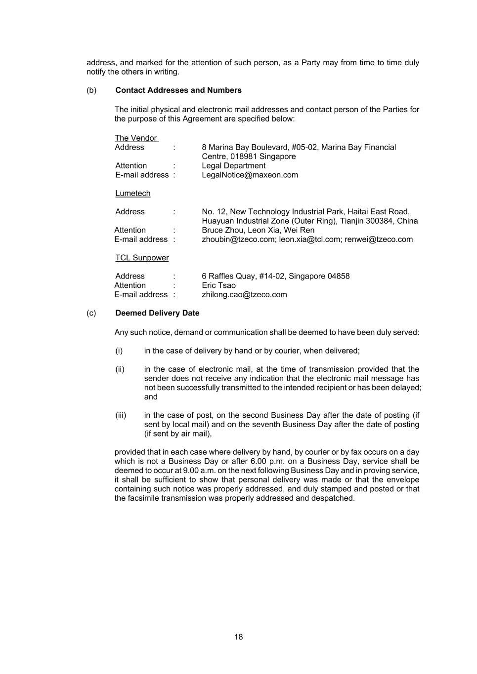 18 address, and marked for the attention of such person, as a Party may from time to time duly notify the others in writing. (b) Contact Addresses and Numbers The initial physical and electronic mail addresses and contact person of the Parties for the purpose of this Agreement are specified below: The Vendor Address : 8 Marina Bay Boulevard, #05-02, Marina Bay Financial Centre, 018981 Singapore Attention : Legal Department E-mail address : LegalNotice@maxeon.com Lumetech Address : No. 12, New Technology Industrial Park, Haitai East Road, Huayuan Industrial Zone (Outer Ring), Tianjin 300384, China Attention : Bruce Zhou, Leon Xia, Wei Ren E-mail address : zhoubin@tzeco.com; leon.xia@tcl.com; renwei@tzeco.com TCL Sunpower Address : 6 Raffles Quay, #14-02, Singapore 04858 Attention : Eric Tsao E-mail address : zhilong.cao@tzeco.com (c) Deemed Delivery Date Any such notice, demand or communication shall be deemed to have been duly served: (i) in the case of delivery by hand or by courier, when delivered; (ii) in the case of electronic mail, at the time of transmission provided that the sender does not receive any indication that the electronic mail message has not been successfully transmitted to the intended recipient or has been delayed; and (iii) in the case of post, on the second Business Day after the date of posting (if sent by local mail) and on the seventh Business Day after the date of posting (if sent by air mail), provided that in each case where delivery by hand, by courier or by fax occurs on a day which is not a Business Day or after 6.00 p.m. on a Business Day, service shall be deemed to occur at 9.00 a.m. on the next following Business Day and in proving service, it shall be sufficient to show that personal delivery was made or that the envelope containing such notice was properly addressed, and duly stamped and posted or that the facsimile transmission was properly addressed and despatched.