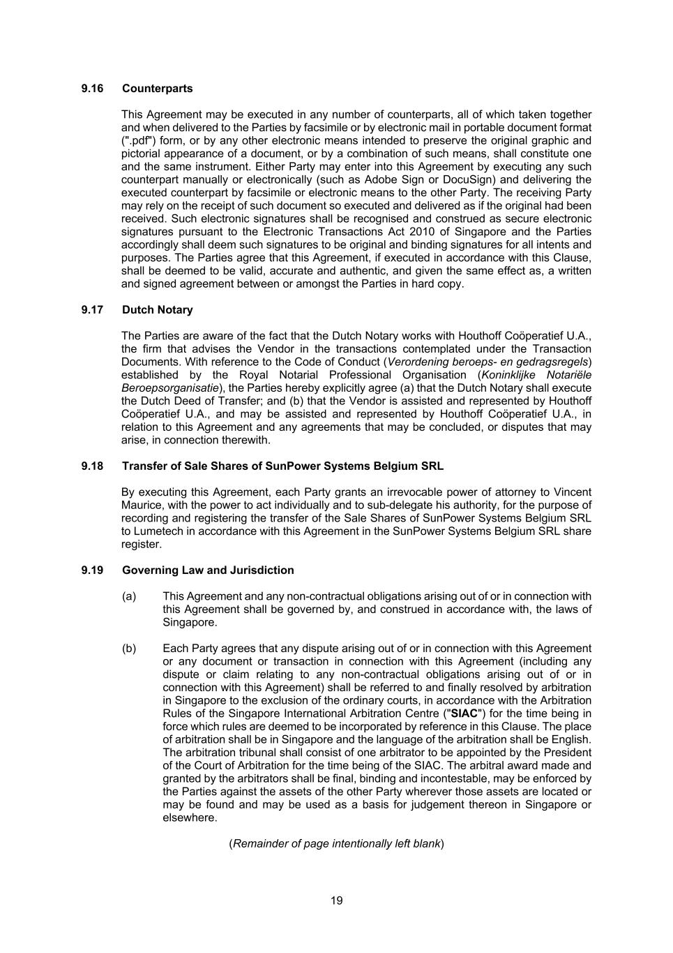 19 9.16 Counterparts This Agreement may be executed in any number of counterparts, all of which taken together and when delivered to the Parties by facsimile or by electronic mail in portable document format (".pdf") form, or by any other electronic means intended to preserve the original graphic and pictorial appearance of a document, or by a combination of such means, shall constitute one and the same instrument. Either Party may enter into this Agreement by executing any such counterpart manually or electronically (such as Adobe Sign or DocuSign) and delivering the executed counterpart by facsimile or electronic means to the other Party. The receiving Party may rely on the receipt of such document so executed and delivered as if the original had been received. Such electronic signatures shall be recognised and construed as secure electronic signatures pursuant to the Electronic Transactions Act 2010 of Singapore and the Parties accordingly shall deem such signatures to be original and binding signatures for all intents and purposes. The Parties agree that this Agreement, if executed in accordance with this Clause, shall be deemed to be valid, accurate and authentic, and given the same effect as, a written and signed agreement between or amongst the Parties in hard copy. 9.17 Dutch Notary The Parties are aware of the fact that the Dutch Notary works with Houthoff Coöperatief U.A., the firm that advises the Vendor in the transactions contemplated under the Transaction Documents. With reference to the Code of Conduct (Verordening beroeps- en gedragsregels) established by the Royal Notarial Professional Organisation (Koninklijke Notariële Beroepsorganisatie), the Parties hereby explicitly agree (a) that the Dutch Notary shall execute the Dutch Deed of Transfer; and (b) that the Vendor is assisted and represented by Houthoff Coöperatief U.A., and may be assisted and represented by Houthoff Coöperatief U.A., in relation to this Agreement and any agreements that may be concluded, or disputes that may arise, in connection therewith. 9.18 Transfer of Sale Shares of SunPower Systems Belgium SRL By executing this Agreement, each Party grants an irrevocable power of attorney to Vincent Maurice, with the power to act individually and to sub-delegate his authority, for the purpose of recording and registering the transfer of the Sale Shares of SunPower Systems Belgium SRL to Lumetech in accordance with this Agreement in the SunPower Systems Belgium SRL share register. 9.19 Governing Law and Jurisdiction (a) This Agreement and any non-contractual obligations arising out of or in connection with this Agreement shall be governed by, and construed in accordance with, the laws of Singapore. (b) Each Party agrees that any dispute arising out of or in connection with this Agreement or any document or transaction in connection with this Agreement (including any dispute or claim relating to any non-contractual obligations arising out of or in connection with this Agreement) shall be referred to and finally resolved by arbitration in Singapore to the exclusion of the ordinary courts, in accordance with the Arbitration Rules of the Singapore International Arbitration Centre ("SIAC") for the time being in force which rules are deemed to be incorporated by reference in this Clause. The place of arbitration shall be in Singapore and the language of the arbitration shall be English. The arbitration tribunal shall consist of one arbitrator to be appointed by the President of the Court of Arbitration for the time being of the SIAC. The arbitral award made and granted by the arbitrators shall be final, binding and incontestable, may be enforced by the Parties against the assets of the other Party wherever those assets are located or may be found and may be used as a basis for judgement thereon in Singapore or elsewhere. (Remainder of page intentionally left blank)