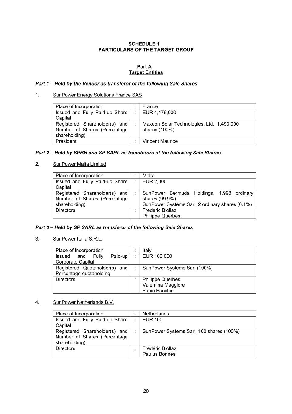 20 SCHEDULE 1 PARTICULARS OF THE TARGET GROUP Part A Target Entities Part 1 – Held by the Vendor as transferor of the following Sale Shares 1. SunPower Energy Solutions France SAS Place of Incorporation : France Issued and Fully Paid-up Share Capital : EUR 4,479,000 Registered Shareholder(s) and Number of Shares (Percentage shareholding) : Maxeon Solar Technologies, Ltd., 1,493,000 shares (100%) President : Vincent Maurice Part 2 – Held by SPBH and SP SARL as transferors of the following Sale Shares 2. SunPower Malta Limited Place of Incorporation : Malta Issued and Fully Paid-up Share Capital : EUR 2,000 Registered Shareholder(s) and Number of Shares (Percentage shareholding) : SunPower Bermuda Holdings, 1,998 ordinary shares (99.9%) SunPower Systems Sarl, 2 ordinary shares (0.1%) Directors : Frederic Biollaz Philippe Querbes Part 3 – Held by SP SARL as transferor of the following Sale Shares 3. SunPower Italia S.R.L. Place of Incorporation : Italy Issued and Fully Paid-up Corporate Capital : EUR 100,000 Registered Quotaholder(s) and Percentage quotaholding : SunPower Systems Sarl (100%) Directors : Philippe Querbes Valentina Maggiore Fabio Bacchin 4. SunPower Netherlands B.V. Place of Incorporation : Netherlands Issued and Fully Paid-up Share Capital : EUR 100 Registered Shareholder(s) and Number of Shares (Percentage shareholding) : SunPower Systems Sarl, 100 shares (100%) Directors : Frédéric Biollaz Paulus Bonnes