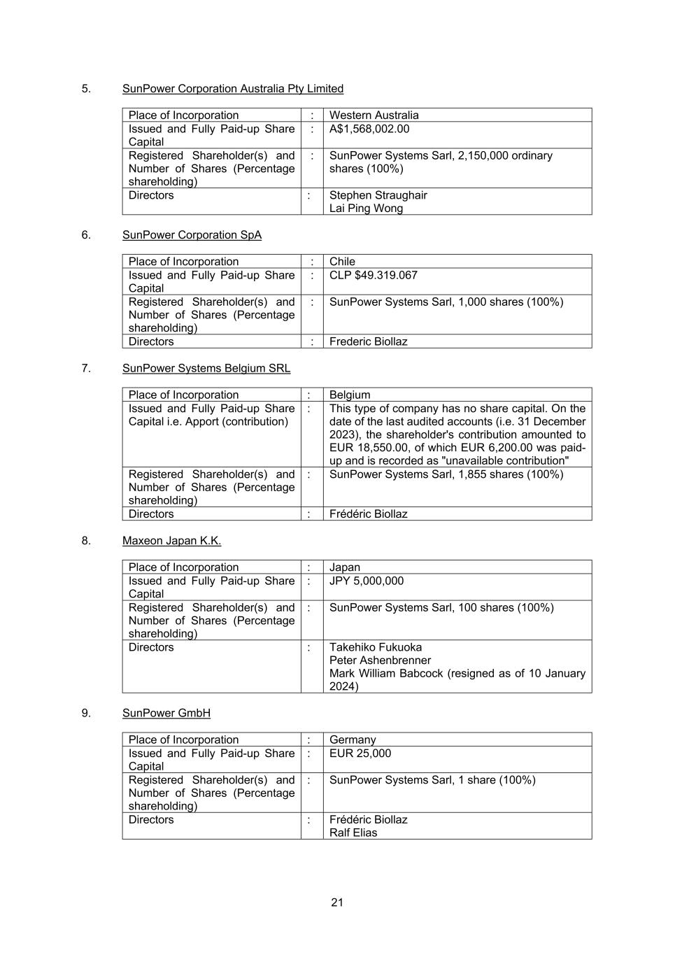 21 5. SunPower Corporation Australia Pty Limited Place of Incorporation : Western Australia Issued and Fully Paid-up Share Capital : A$1,568,002.00 Registered Shareholder(s) and Number of Shares (Percentage shareholding) : SunPower Systems Sarl, 2,150,000 ordinary shares (100%) Directors : Stephen Straughair Lai Ping Wong 6. SunPower Corporation SpA Place of Incorporation : Chile Issued and Fully Paid-up Share Capital : CLP $49.319.067 Registered Shareholder(s) and Number of Shares (Percentage shareholding) : SunPower Systems Sarl, 1,000 shares (100%) Directors : Frederic Biollaz 7. SunPower Systems Belgium SRL Place of Incorporation : Belgium Issued and Fully Paid-up Share Capital i.e. Apport (contribution) : This type of company has no share capital. On the date of the last audited accounts (i.e. 31 December 2023), the shareholder's contribution amounted to EUR 18,550.00, of which EUR 6,200.00 was paid- up and is recorded as "unavailable contribution" Registered Shareholder(s) and Number of Shares (Percentage shareholding) : SunPower Systems Sarl, 1,855 shares (100%) Directors : Frédéric Biollaz 8. Maxeon Japan K.K. Place of Incorporation : Japan Issued and Fully Paid-up Share Capital : JPY 5,000,000 Registered Shareholder(s) and Number of Shares (Percentage shareholding) : SunPower Systems Sarl, 100 shares (100%) Directors : Takehiko Fukuoka Peter Ashenbrenner Mark William Babcock (resigned as of 10 January 2024) 9. SunPower GmbH Place of Incorporation : Germany Issued and Fully Paid-up Share Capital : EUR 25,000 Registered Shareholder(s) and Number of Shares (Percentage shareholding) : SunPower Systems Sarl, 1 share (100%) Directors : Frédéric Biollaz Ralf Elias
