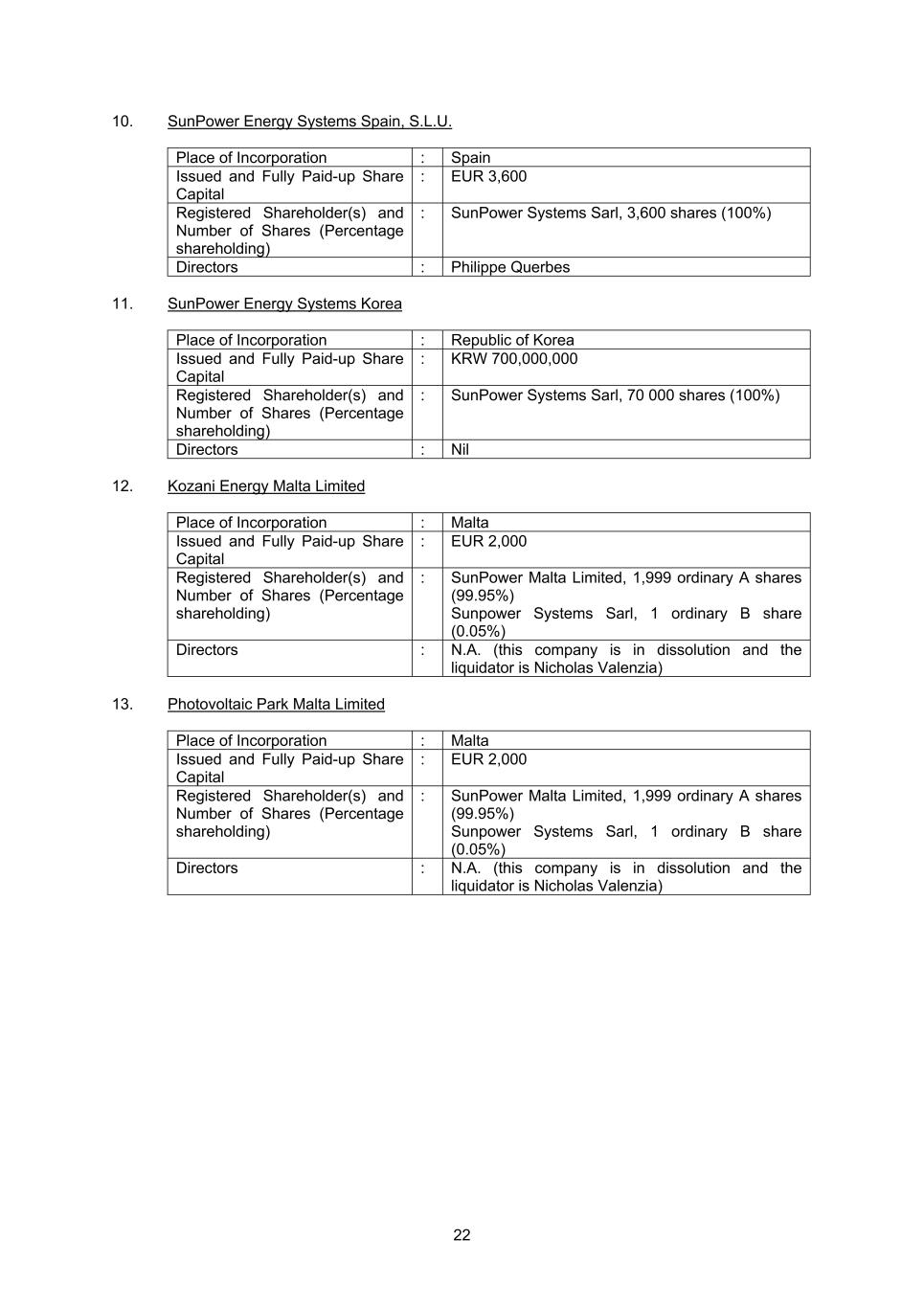 22 10. SunPower Energy Systems Spain, S.L.U. Place of Incorporation : Spain Issued and Fully Paid-up Share Capital : EUR 3,600 Registered Shareholder(s) and Number of Shares (Percentage shareholding) : SunPower Systems Sarl, 3,600 shares (100%) Directors : Philippe Querbes 11. SunPower Energy Systems Korea Place of Incorporation : Republic of Korea Issued and Fully Paid-up Share Capital : KRW 700,000,000 Registered Shareholder(s) and Number of Shares (Percentage shareholding) : SunPower Systems Sarl, 70 000 shares (100%) Directors : Nil 12. Kozani Energy Malta Limited Place of Incorporation : Malta Issued and Fully Paid-up Share Capital : EUR 2,000 Registered Shareholder(s) and Number of Shares (Percentage shareholding) : SunPower Malta Limited, 1,999 ordinary A shares (99.95%) Sunpower Systems Sarl, 1 ordinary B share (0.05%) Directors : N.A. (this company is in dissolution and the liquidator is Nicholas Valenzia) 13. Photovoltaic Park Malta Limited Place of Incorporation : Malta Issued and Fully Paid-up Share Capital : EUR 2,000 Registered Shareholder(s) and Number of Shares (Percentage shareholding) : SunPower Malta Limited, 1,999 ordinary A shares (99.95%) Sunpower Systems Sarl, 1 ordinary B share (0.05%) Directors : N.A. (this company is in dissolution and the liquidator is Nicholas Valenzia)
