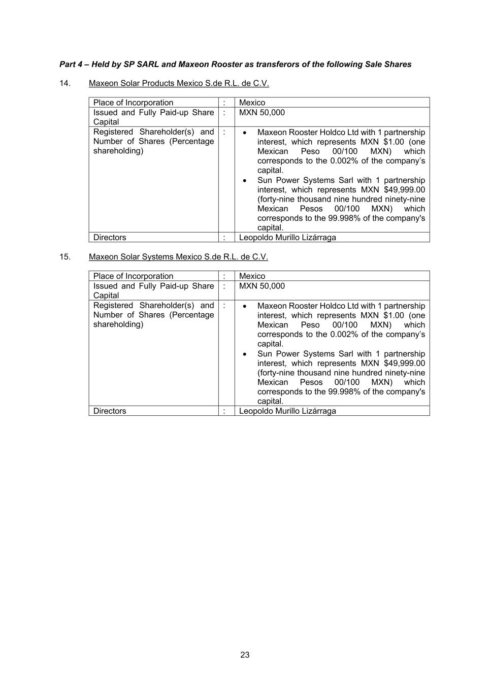 23 Part 4 – Held by SP SARL and Maxeon Rooster as transferors of the following Sale Shares 14. Maxeon Solar Products Mexico S.de R.L. de C.V. Place of Incorporation : Mexico Issued and Fully Paid-up Share Capital : MXN 50,000 Registered Shareholder(s) and Number of Shares (Percentage shareholding) : • Maxeon Rooster Holdco Ltd with 1 partnership interest, which represents MXN $1.00 (one Mexican Peso 00/100 MXN) which corresponds to the 0.002% of the company’s capital. • Sun Power Systems Sarl with 1 partnership interest, which represents MXN $49,999.00 (forty-nine thousand nine hundred ninety-nine Mexican Pesos 00/100 MXN) which corresponds to the 99.998% of the company's capital. Directors : Leopoldo Murillo Lizárraga 15. Maxeon Solar Systems Mexico S.de R.L. de C.V. Place of Incorporation : Mexico Issued and Fully Paid-up Share Capital : MXN 50,000 Registered Shareholder(s) and Number of Shares (Percentage shareholding) : • Maxeon Rooster Holdco Ltd with 1 partnership interest, which represents MXN $1.00 (one Mexican Peso 00/100 MXN) which corresponds to the 0.002% of the company’s capital. • Sun Power Systems Sarl with 1 partnership interest, which represents MXN $49,999.00 (forty-nine thousand nine hundred ninety-nine Mexican Pesos 00/100 MXN) which corresponds to the 99.998% of the company's capital. Directors : Leopoldo Murillo Lizárraga