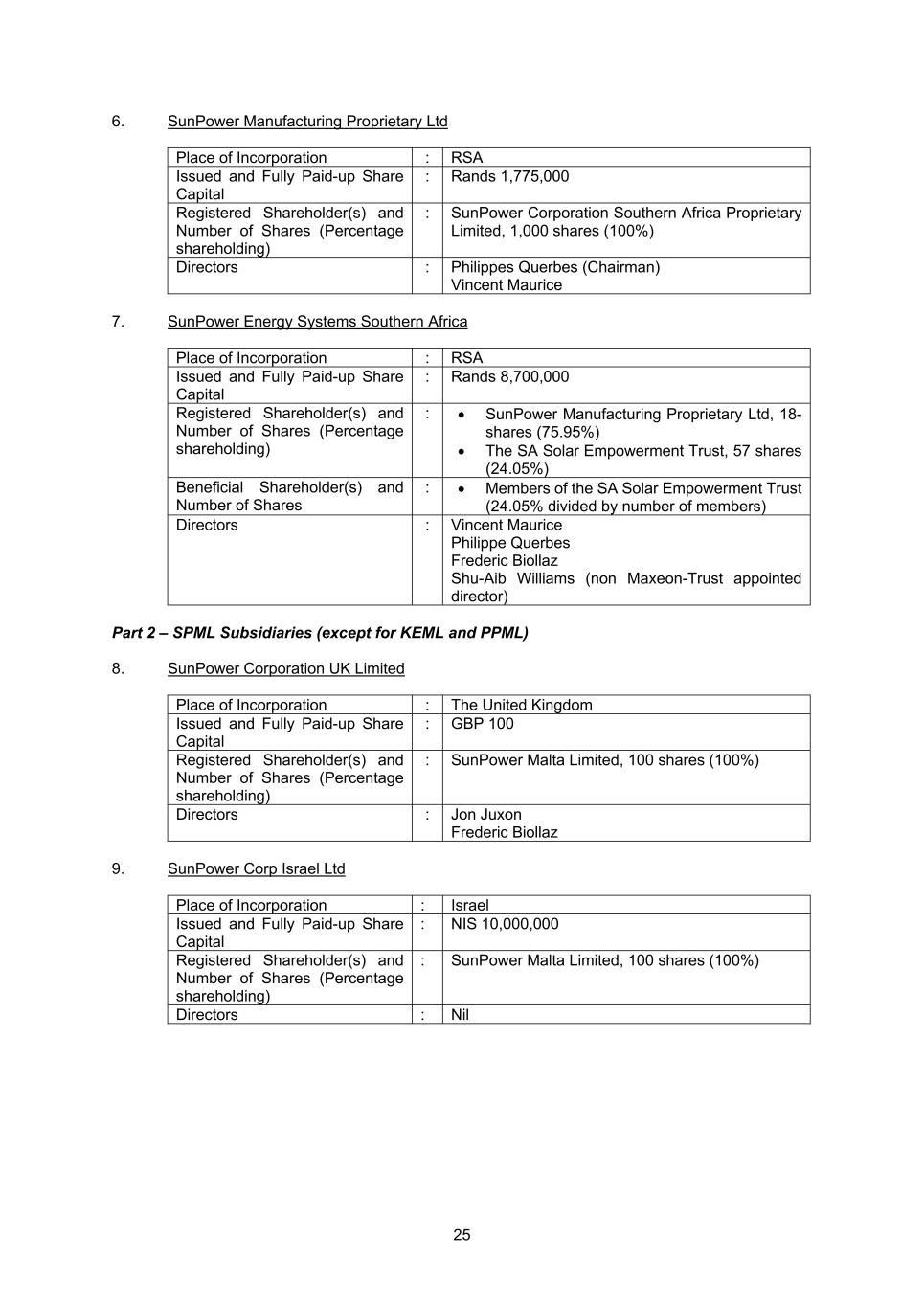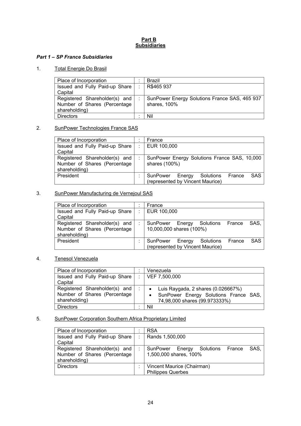 24 Part B Subsidiaries Part 1 – SP France Subsidiaries 1. Total Energie Do Brasil Place of Incorporation : Brazil Issued and Fully Paid-up Share Capital : R$465 937 Registered Shareholder(s) and Number of Shares (Percentage shareholding) : SunPower Energy Solutions France SAS, 465 937 shares, 100% Directors : Nil 2. SunPower Technologies France SAS Place of Incorporation : France Issued and Fully Paid-up Share Capital : EUR 100,000 Registered Shareholder(s) and Number of Shares (Percentage shareholding) : SunPower Energy Solutions France SAS, 10,000 shares (100%) President : SunPower Energy Solutions France SAS (represented by Vincent Maurice) 3. SunPower Manufacturing de Vernejoul SAS Place of Incorporation : France Issued and Fully Paid-up Share Capital : EUR 100,000 Registered Shareholder(s) and Number of Shares (Percentage shareholding) : SunPower Energy Solutions France SAS, 10,000,000 shares (100%) President : SunPower Energy Solutions France SAS (represented by Vincent Maurice) 4. Tenesol Venezuela Place of Incorporation : Venezuela Issued and Fully Paid-up Share Capital : VEF 7,500,000 Registered Shareholder(s) and Number of Shares (Percentage shareholding) : • Luis Raygada, 2 shares (0.026667%) • SunPower Energy Solutions France SAS, 74,98,000 shares (99.973333%) Directors : Nil 5. SunPower Corporation Southern Africa Proprietary Limited Place of Incorporation : RSA Issued and Fully Paid-up Share Capital : Rands 1,500,000 Registered Shareholder(s) and Number of Shares (Percentage shareholding) : SunPower Energy Solutions France SAS, 1,500,000 shares, 100% Directors : Vincent Maurice (Chairman) Philippes Querbes