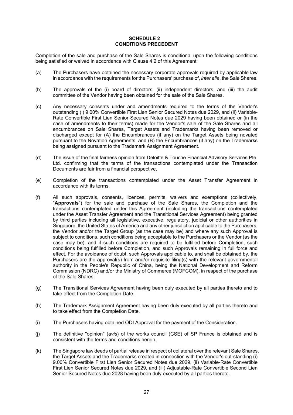 27 SCHEDULE 2 CONDITIONS PRECEDENT Completion of the sale and purchase of the Sale Shares is conditional upon the following conditions being satisfied or waived in accordance with Clause 4.2 of this Agreement: (a) The Purchasers have obtained the necessary corporate approvals required by applicable law in accordance with the requirements for the Purchasers' purchase of, inter alia, the Sale Shares. (b) The approvals of the (i) board of directors, (ii) independent directors, and (iii) the audit committee of the Vendor having been obtained for the sale of the Sale Shares. (c) Any necessary consents under and amendments required to the terms of the Vendor's outstanding (i) 9.00% Convertible First Lien Senior Secured Notes due 2029, and (ii) Variable- Rate Convertible First Lien Senior Secured Notes due 2029 having been obtained or (in the case of amendments to their terms) made for the Vendor's sale of the Sale Shares and all encumbrances on Sale Shares, Target Assets and Trademarks having been removed or discharged except for (A) the Encumbrances (if any) on the Target Assets being novated pursuant to the Novation Agreements, and (B) the Encumbrances (if any) on the Trademarks being assigned pursuant to the Trademark Assignment Agreement. (d) The issue of the final fairness opinion from Deloitte & Touche Financial Advisory Services Pte. Ltd. confirming that the terms of the transactions contemplated under the Transaction Documents are fair from a financial perspective. (e) Completion of the transactions contemplated under the Asset Transfer Agreement in accordance with its terms. (f) All such approvals, consents, licences, permits, waivers and exemptions (collectively, "Approvals") for the sale and purchase of the Sale Shares, the Completion and the transactions contemplated under this Agreement (including the transactions contemplated under the Asset Transfer Agreement and the Transitional Services Agreement) being granted by third parties including all legislative, executive, regulatory, judicial or other authorities in Singapore, the United States of America and any other jurisdiction applicable to the Purchasers, the Vendor and/or the Target Group (as the case may be) and where any such Approval is subject to conditions, such conditions being acceptable to the Purchasers or the Vendor (as the case may be), and if such conditions are required to be fulfilled before Completion, such conditions being fulfilled before Completion, and such Approvals remaining in full force and effect. For the avoidance of doubt, such Approvals applicable to, and shall be obtained by, the Purchasers are the approval(s) from and/or requisite filing(s) with the relevant governmental authority in the People's Republic of China, being the National Development and Reform Commission (NDRC) and/or the Ministry of Commerce (MOFCOM), in respect of the purchase of the Sale Shares. (g) The Transitional Services Agreement having been duly executed by all parties thereto and to take effect from the Completion Date. (h) The Trademark Assignment Agreement having been duly executed by all parties thereto and to take effect from the Completion Date. (i) The Purchasers having obtained ODI Approval for the payment of the Consideration. (j) The definitive "opinion" (avis) of the works council (CSE) of SP France is obtained and is consistent with the terms and conditions herein. (k) The Singapore law deeds of partial release in respect of collateral over the relevant Sale Shares, the Target Assets and the Trademarks created in connection with the Vendor's out-standing (i) 9.00% Convertible First Lien Senior Secured Notes due 2029, (ii) Variable-Rate Convertible First Lien Senior Secured Notes due 2029, and (iii) Adjustable-Rate Convertible Second Lien Senior Secured Notes due 2028 having been duly executed by all parties thereto.