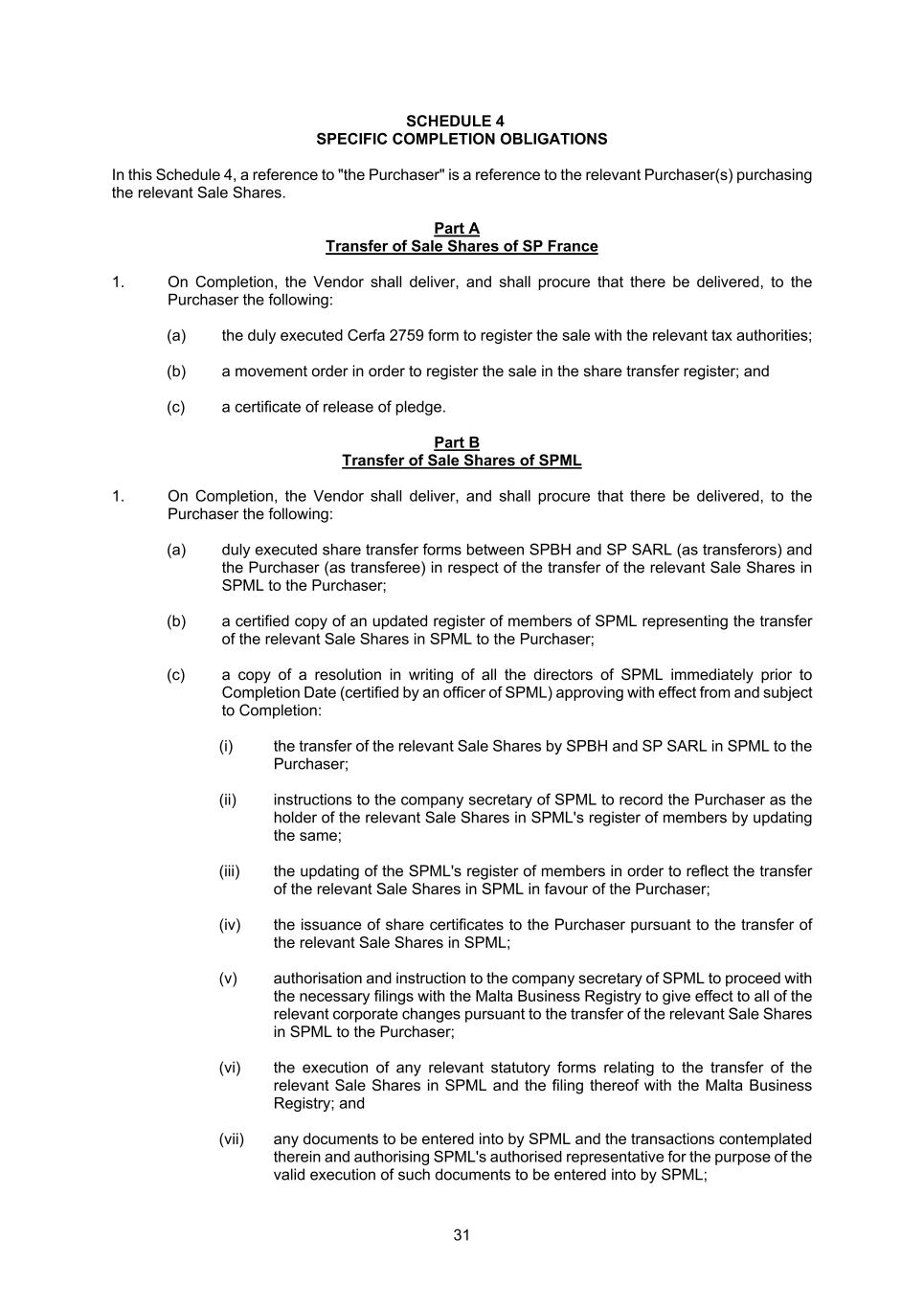 31 SCHEDULE 4 SPECIFIC COMPLETION OBLIGATIONS In this Schedule 4, a reference to "the Purchaser" is a reference to the relevant Purchaser(s) purchasing the relevant Sale Shares. Part A Transfer of Sale Shares of SP France 1. On Completion, the Vendor shall deliver, and shall procure that there be delivered, to the Purchaser the following: (a) the duly executed Cerfa 2759 form to register the sale with the relevant tax authorities; (b) a movement order in order to register the sale in the share transfer register; and (c) a certificate of release of pledge. Part B Transfer of Sale Shares of SPML 1. On Completion, the Vendor shall deliver, and shall procure that there be delivered, to the Purchaser the following: (a) duly executed share transfer forms between SPBH and SP SARL (as transferors) and the Purchaser (as transferee) in respect of the transfer of the relevant Sale Shares in SPML to the Purchaser; (b) a certified copy of an updated register of members of SPML representing the transfer of the relevant Sale Shares in SPML to the Purchaser; (c) a copy of a resolution in writing of all the directors of SPML immediately prior to Completion Date (certified by an officer of SPML) approving with effect from and subject to Completion: (i) the transfer of the relevant Sale Shares by SPBH and SP SARL in SPML to the Purchaser; (ii) instructions to the company secretary of SPML to record the Purchaser as the holder of the relevant Sale Shares in SPML's register of members by updating the same; (iii) the updating of the SPML's register of members in order to reflect the transfer of the relevant Sale Shares in SPML in favour of the Purchaser; (iv) the issuance of share certificates to the Purchaser pursuant to the transfer of the relevant Sale Shares in SPML; (v) authorisation and instruction to the company secretary of SPML to proceed with the necessary filings with the Malta Business Registry to give effect to all of the relevant corporate changes pursuant to the transfer of the relevant Sale Shares in SPML to the Purchaser; (vi) the execution of any relevant statutory forms relating to the transfer of the relevant Sale Shares in SPML and the filing thereof with the Malta Business Registry; and (vii) any documents to be entered into by SPML and the transactions contemplated therein and authorising SPML's authorised representative for the purpose of the valid execution of such documents to be entered into by SPML;