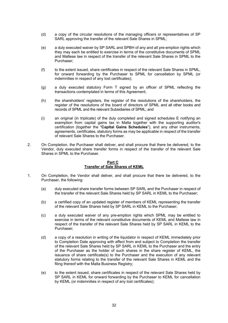 32 (d) a copy of the circular resolutions of the managing officers or representatives of SP SARL approving the transfer of the relevant Sale Shares in SPML; (e) a duly executed waiver by SP SARL and SPBH of any and all pre-emption rights which they may each be entitled to exercise in terms of the constitutive documents of SPML and Maltese law in respect of the transfer of the relevant Sale Shares in SPML to the Purchaser; (f) to the extent issued, share certificates in respect of the relevant Sale Shares in SPML, for onward forwarding by the Purchaser to SPML for cancellation by SPML (or indemnities in respect of any lost certificates); (g) a duly executed statutory Form T signed by an officer of SPML reflecting the transactions contemplated in terms of this Agreement; (h) the shareholders' registers, the register of the resolutions of the shareholders, the register of the resolutions of the board of directors of SPML and all other books and records of SPML and the relevant Subsidiaries of SPML; and (i) an original (in triplicate) of the duly completed and signed schedules E notifying an exemption from capital gains tax in Malta together with the supporting auditor's certification (together the "Capital Gains Schedules"), and any other instruments, agreements, certificates, statutory forms as may be applicable in respect of the transfer of relevant Sale Shares to the Purchaser. 2. On Completion, the Purchaser shall deliver, and shall procure that there be delivered, to the Vendor, duly executed share transfer forms in respect of the transfer of the relevant Sale Shares in SPML to the Purchaser. Part C Transfer of Sale Shares of KEML 1. On Completion, the Vendor shall deliver, and shall procure that there be delivered, to the Purchaser, the following: (a) duly executed share transfer forms between SP SARL and the Purchaser in respect of the transfer of the relevant Sale Shares held by SP SARL in KEML to the Purchaser; (b) a certified copy of an updated register of members of KEML representing the transfer of the relevant Sale Shares held by SP SARL in KEML to the Purchaser; (c) a duly executed waiver of any pre-emption rights which SPML may be entitled to exercise in terms of the relevant constitutive documents of KEML and Maltese law in respect of the transfer of the relevant Sale Shares held by SP SARL in KEML to the Purchaser; (d) a copy of a resolution in writing of the liquidator in respect of KEML immediately prior to Completion Date approving with effect from and subject to Completion the transfer of the relevant Sale Shares held by SP SARL in KEML to the Purchaser and the entry of the Purchaser as the holder of such shares in the share register of KEML, the issuance of share certificate(s) to the Purchaser and the execution of any relevant statutory forms relating to the transfer of the relevant Sale Shares in KEML and the filing thereof with the Malta Business Registry; (e) to the extent issued, share certificates in respect of the relevant Sale Shares held by SP SARL in KEML for onward forwarding by the Purchaser to KEML for cancellation by KEML (or indemnities in respect of any lost certificates);