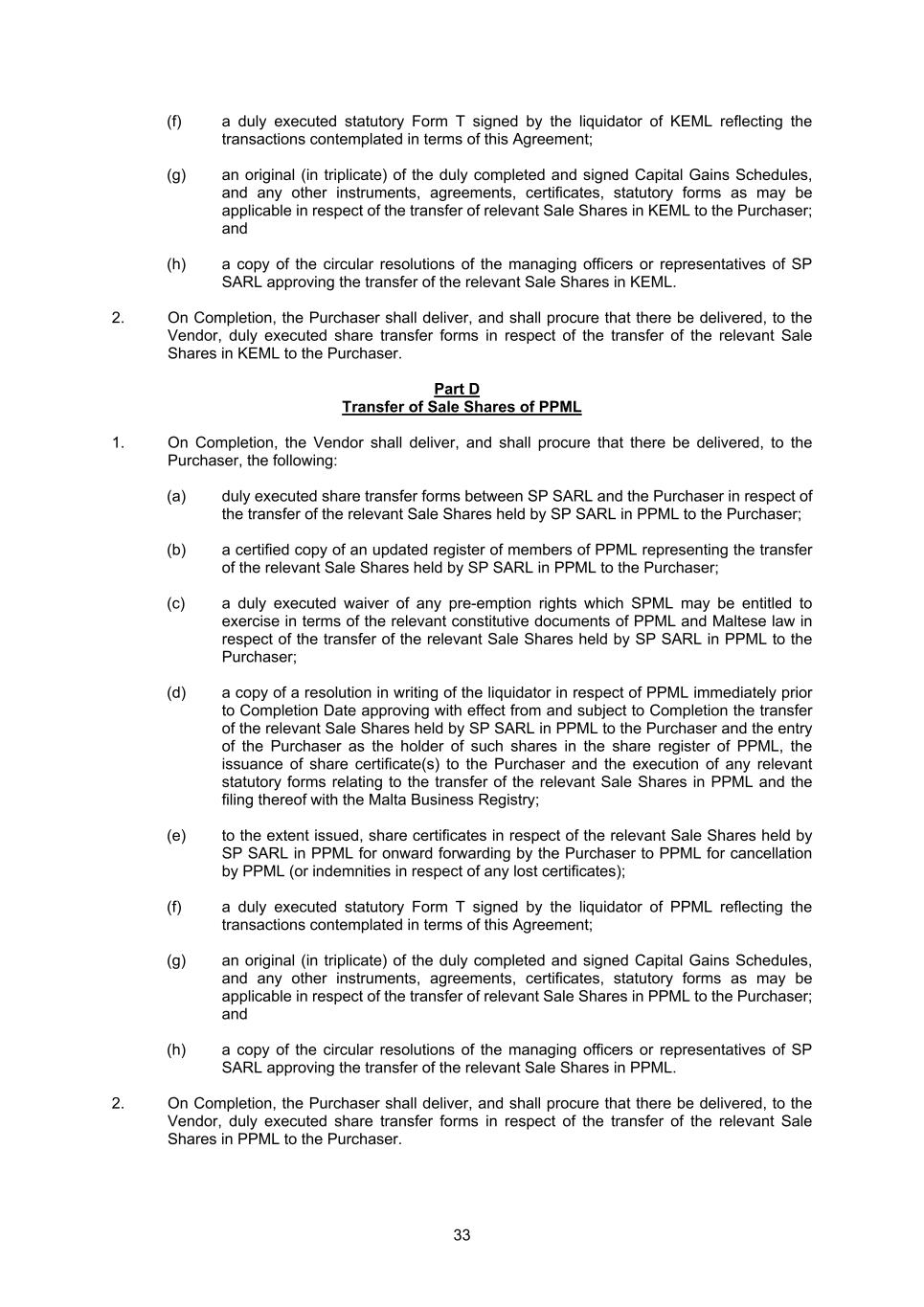33 (f) a duly executed statutory Form T signed by the liquidator of KEML reflecting the transactions contemplated in terms of this Agreement; (g) an original (in triplicate) of the duly completed and signed Capital Gains Schedules, and any other instruments, agreements, certificates, statutory forms as may be applicable in respect of the transfer of relevant Sale Shares in KEML to the Purchaser; and (h) a copy of the circular resolutions of the managing officers or representatives of SP SARL approving the transfer of the relevant Sale Shares in KEML. 2. On Completion, the Purchaser shall deliver, and shall procure that there be delivered, to the Vendor, duly executed share transfer forms in respect of the transfer of the relevant Sale Shares in KEML to the Purchaser. Part D Transfer of Sale Shares of PPML 1. On Completion, the Vendor shall deliver, and shall procure that there be delivered, to the Purchaser, the following: (a) duly executed share transfer forms between SP SARL and the Purchaser in respect of the transfer of the relevant Sale Shares held by SP SARL in PPML to the Purchaser; (b) a certified copy of an updated register of members of PPML representing the transfer of the relevant Sale Shares held by SP SARL in PPML to the Purchaser; (c) a duly executed waiver of any pre-emption rights which SPML may be entitled to exercise in terms of the relevant constitutive documents of PPML and Maltese law in respect of the transfer of the relevant Sale Shares held by SP SARL in PPML to the Purchaser; (d) a copy of a resolution in writing of the liquidator in respect of PPML immediately prior to Completion Date approving with effect from and subject to Completion the transfer of the relevant Sale Shares held by SP SARL in PPML to the Purchaser and the entry of the Purchaser as the holder of such shares in the share register of PPML, the issuance of share certificate(s) to the Purchaser and the execution of any relevant statutory forms relating to the transfer of the relevant Sale Shares in PPML and the filing thereof with the Malta Business Registry; (e) to the extent issued, share certificates in respect of the relevant Sale Shares held by SP SARL in PPML for onward forwarding by the Purchaser to PPML for cancellation by PPML (or indemnities in respect of any lost certificates); (f) a duly executed statutory Form T signed by the liquidator of PPML reflecting the transactions contemplated in terms of this Agreement; (g) an original (in triplicate) of the duly completed and signed Capital Gains Schedules, and any other instruments, agreements, certificates, statutory forms as may be applicable in respect of the transfer of relevant Sale Shares in PPML to the Purchaser; and (h) a copy of the circular resolutions of the managing officers or representatives of SP SARL approving the transfer of the relevant Sale Shares in PPML. 2. On Completion, the Purchaser shall deliver, and shall procure that there be delivered, to the Vendor, duly executed share transfer forms in respect of the transfer of the relevant Sale Shares in PPML to the Purchaser.