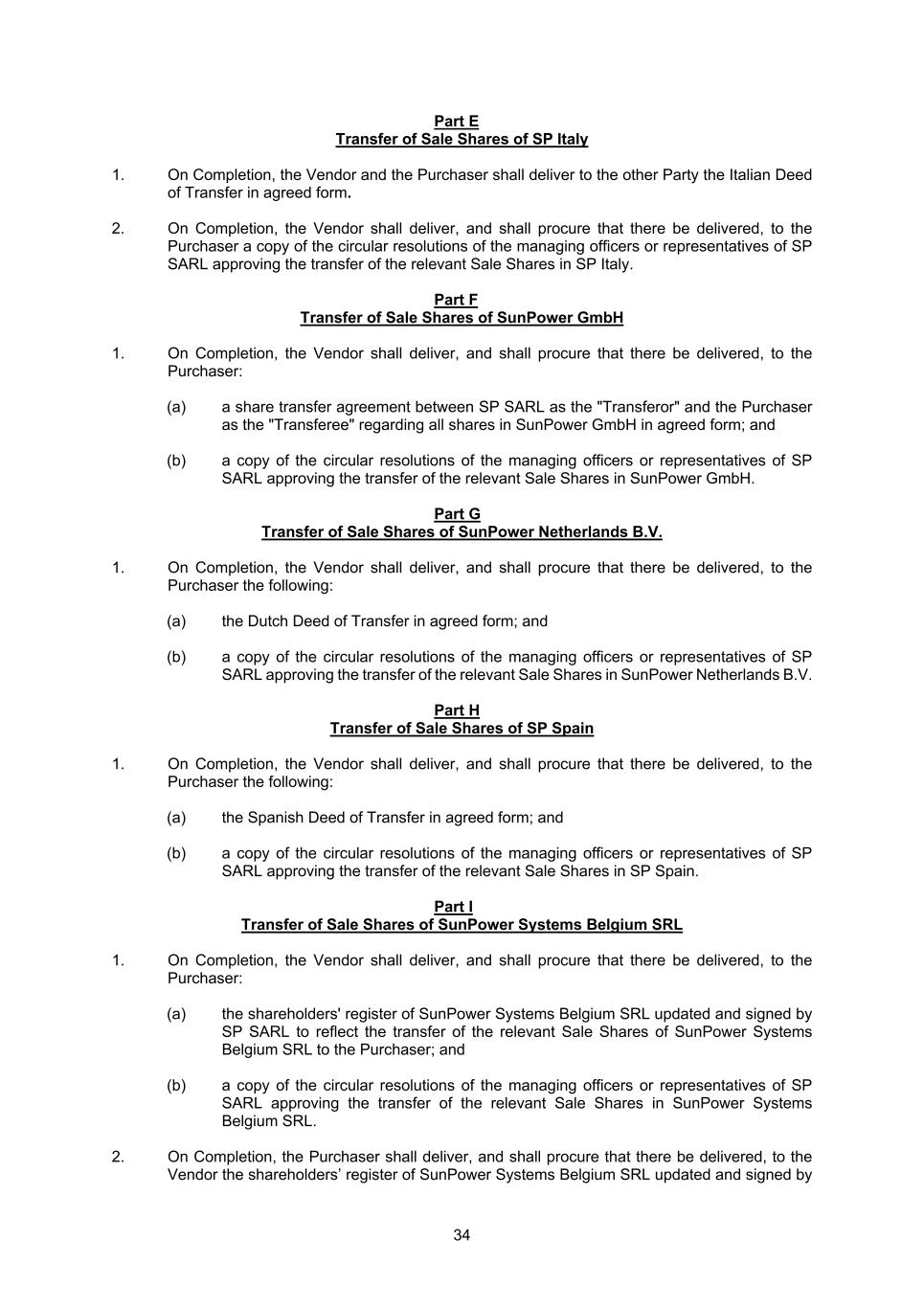 34 Part E Transfer of Sale Shares of SP Italy 1. On Completion, the Vendor and the Purchaser shall deliver to the other Party the Italian Deed of Transfer in agreed form. 2. On Completion, the Vendor shall deliver, and shall procure that there be delivered, to the Purchaser a copy of the circular resolutions of the managing officers or representatives of SP SARL approving the transfer of the relevant Sale Shares in SP Italy. Part F Transfer of Sale Shares of SunPower GmbH 1. On Completion, the Vendor shall deliver, and shall procure that there be delivered, to the Purchaser: (a) a share transfer agreement between SP SARL as the "Transferor" and the Purchaser as the "Transferee" regarding all shares in SunPower GmbH in agreed form; and (b) a copy of the circular resolutions of the managing officers or representatives of SP SARL approving the transfer of the relevant Sale Shares in SunPower GmbH. Part G Transfer of Sale Shares of SunPower Netherlands B.V. 1. On Completion, the Vendor shall deliver, and shall procure that there be delivered, to the Purchaser the following: (a) the Dutch Deed of Transfer in agreed form; and (b) a copy of the circular resolutions of the managing officers or representatives of SP SARL approving the transfer of the relevant Sale Shares in SunPower Netherlands B.V. Part H Transfer of Sale Shares of SP Spain 1. On Completion, the Vendor shall deliver, and shall procure that there be delivered, to the Purchaser the following: (a) the Spanish Deed of Transfer in agreed form; and (b) a copy of the circular resolutions of the managing officers or representatives of SP SARL approving the transfer of the relevant Sale Shares in SP Spain. Part I Transfer of Sale Shares of SunPower Systems Belgium SRL 1. On Completion, the Vendor shall deliver, and shall procure that there be delivered, to the Purchaser: (a) the shareholders' register of SunPower Systems Belgium SRL updated and signed by SP SARL to reflect the transfer of the relevant Sale Shares of SunPower Systems Belgium SRL to the Purchaser; and (b) a copy of the circular resolutions of the managing officers or representatives of SP SARL approving the transfer of the relevant Sale Shares in SunPower Systems Belgium SRL. 2. On Completion, the Purchaser shall deliver, and shall procure that there be delivered, to the Vendor the shareholders’ register of SunPower Systems Belgium SRL updated and signed by
