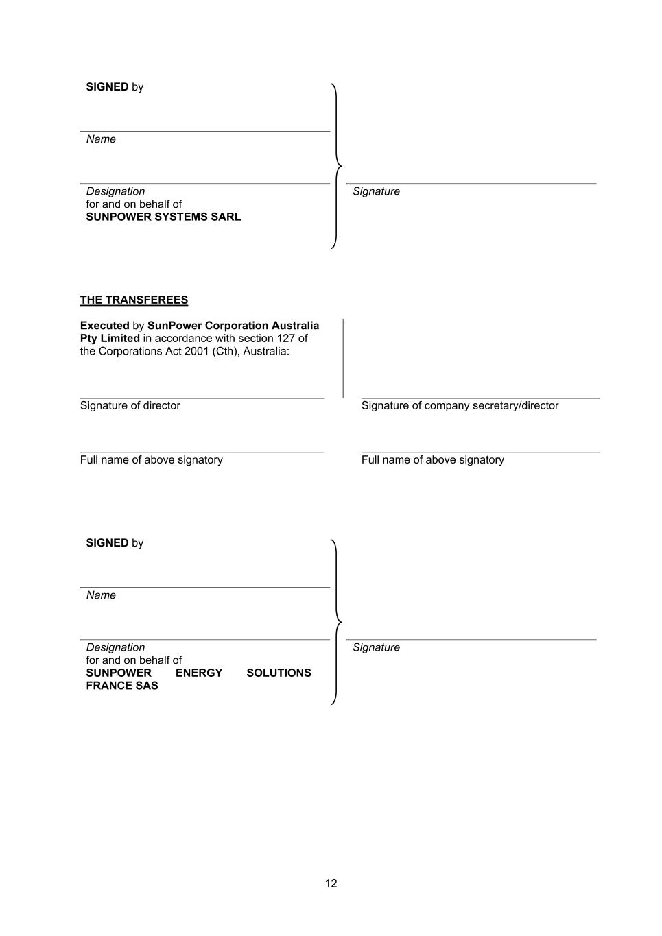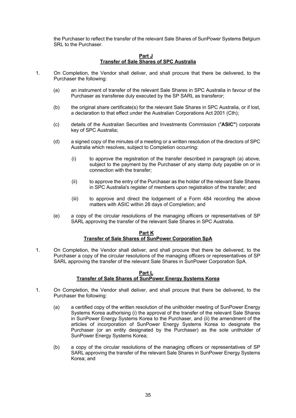 35 the Purchaser to reflect the transfer of the relevant Sale Shares of SunPower Systems Belgium SRL to the Purchaser. Part J Transfer of Sale Shares of SPC Australia 1. On Completion, the Vendor shall deliver, and shall procure that there be delivered, to the Purchaser the following: (a) an instrument of transfer of the relevant Sale Shares in SPC Australia in favour of the Purchaser as transferee duly executed by the SP SARL as transferor; (b) the original share certificate(s) for the relevant Sale Shares in SPC Australia, or if lost, a declaration to that effect under the Australian Corporations Act 2001 (Cth); (c) details of the Australian Securities and Investments Commission ("ASIC") corporate key of SPC Australia; (d) a signed copy of the minutes of a meeting or a written resolution of the directors of SPC Australia which resolves, subject to Completion occurring: (i) to approve the registration of the transfer described in paragraph (a) above, subject to the payment by the Purchaser of any stamp duty payable on or in connection with the transfer; (ii) to approve the entry of the Purchaser as the holder of the relevant Sale Shares in SPC Australia's register of members upon registration of the transfer; and (iii) to approve and direct the lodgement of a Form 484 recording the above matters with ASIC within 28 days of Completion; and (e) a copy of the circular resolutions of the managing officers or representatives of SP SARL approving the transfer of the relevant Sale Shares in SPC Australia. Part K Transfer of Sale Shares of SunPower Corporation SpA 1. On Completion, the Vendor shall deliver, and shall procure that there be delivered, to the Purchaser a copy of the circular resolutions of the managing officers or representatives of SP SARL approving the transfer of the relevant Sale Shares in SunPower Corporation SpA. Part L Transfer of Sale Shares of SunPower Energy Systems Korea 1. On Completion, the Vendor shall deliver, and shall procure that there be delivered, to the Purchaser the following: (a) a certified copy of the written resolution of the unitholder meeting of SunPower Energy Systems Korea authorising (i) the approval of the transfer of the relevant Sale Shares in SunPower Energy Systems Korea to the Purchaser, and (ii) the amendment of the articles of incorporation of SunPower Energy Systems Korea to designate the Purchaser (or an entity designated by the Purchaser) as the sole unitholder of SunPower Energy Systems Korea; (b) a copy of the circular resolutions of the managing officers or representatives of SP SARL approving the transfer of the relevant Sale Shares in SunPower Energy Systems Korea; and