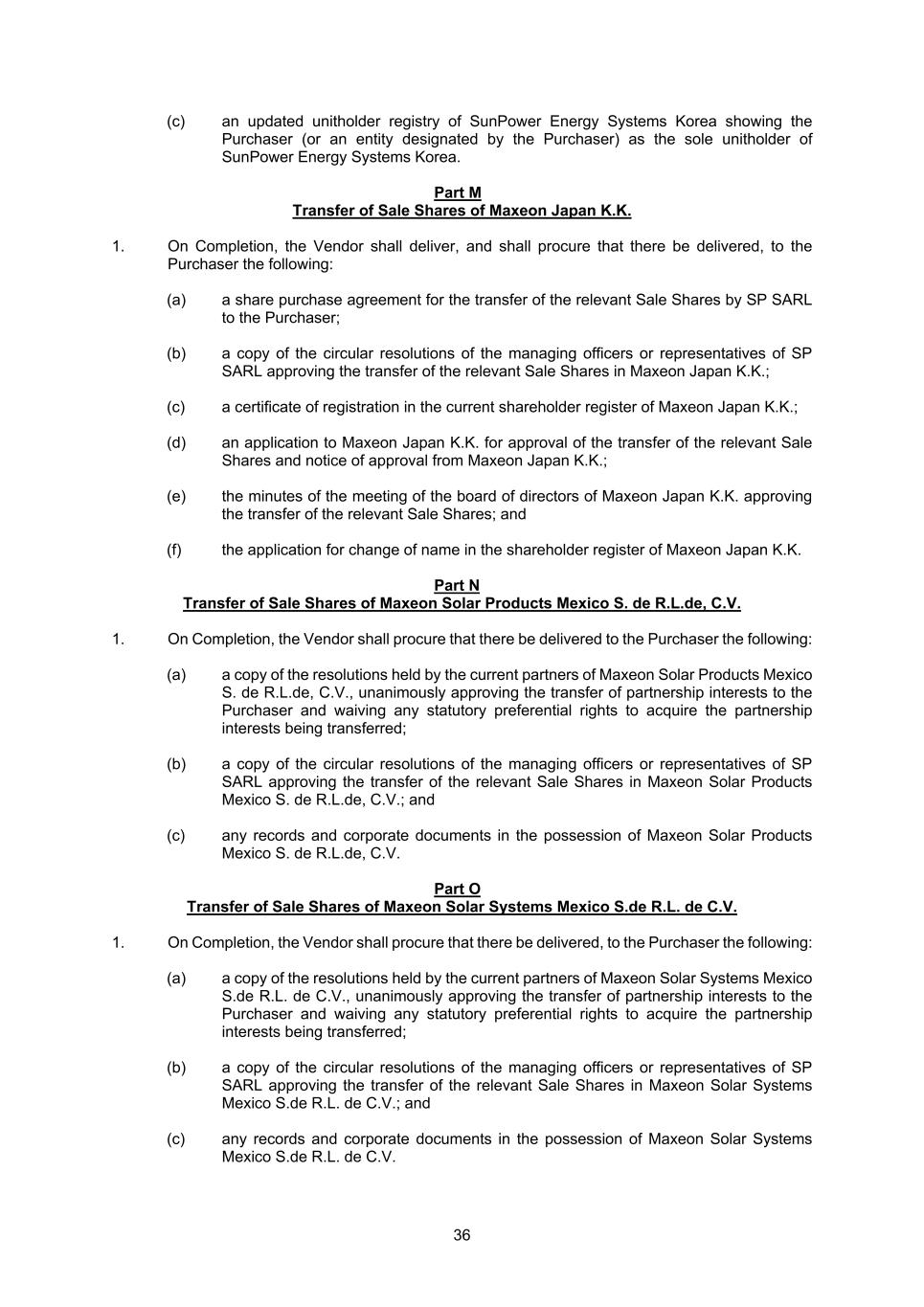36 (c) an updated unitholder registry of SunPower Energy Systems Korea showing the Purchaser (or an entity designated by the Purchaser) as the sole unitholder of SunPower Energy Systems Korea. Part M Transfer of Sale Shares of Maxeon Japan K.K. 1. On Completion, the Vendor shall deliver, and shall procure that there be delivered, to the Purchaser the following: (a) a share purchase agreement for the transfer of the relevant Sale Shares by SP SARL to the Purchaser; (b) a copy of the circular resolutions of the managing officers or representatives of SP SARL approving the transfer of the relevant Sale Shares in Maxeon Japan K.K.; (c) a certificate of registration in the current shareholder register of Maxeon Japan K.K.; (d) an application to Maxeon Japan K.K. for approval of the transfer of the relevant Sale Shares and notice of approval from Maxeon Japan K.K.; (e) the minutes of the meeting of the board of directors of Maxeon Japan K.K. approving the transfer of the relevant Sale Shares; and (f) the application for change of name in the shareholder register of Maxeon Japan K.K. Part N Transfer of Sale Shares of Maxeon Solar Products Mexico S. de R.L.de, C.V. 1. On Completion, the Vendor shall procure that there be delivered to the Purchaser the following: (a) a copy of the resolutions held by the current partners of Maxeon Solar Products Mexico S. de R.L.de, C.V., unanimously approving the transfer of partnership interests to the Purchaser and waiving any statutory preferential rights to acquire the partnership interests being transferred; (b) a copy of the circular resolutions of the managing officers or representatives of SP SARL approving the transfer of the relevant Sale Shares in Maxeon Solar Products Mexico S. de R.L.de, C.V.; and (c) any records and corporate documents in the possession of Maxeon Solar Products Mexico S. de R.L.de, C.V. Part O Transfer of Sale Shares of Maxeon Solar Systems Mexico S.de R.L. de C.V. 1. On Completion, the Vendor shall procure that there be delivered, to the Purchaser the following: (a) a copy of the resolutions held by the current partners of Maxeon Solar Systems Mexico S.de R.L. de C.V., unanimously approving the transfer of partnership interests to the Purchaser and waiving any statutory preferential rights to acquire the partnership interests being transferred; (b) a copy of the circular resolutions of the managing officers or representatives of SP SARL approving the transfer of the relevant Sale Shares in Maxeon Solar Systems Mexico S.de R.L. de C.V.; and (c) any records and corporate documents in the possession of Maxeon Solar Systems Mexico S.de R.L. de C.V.