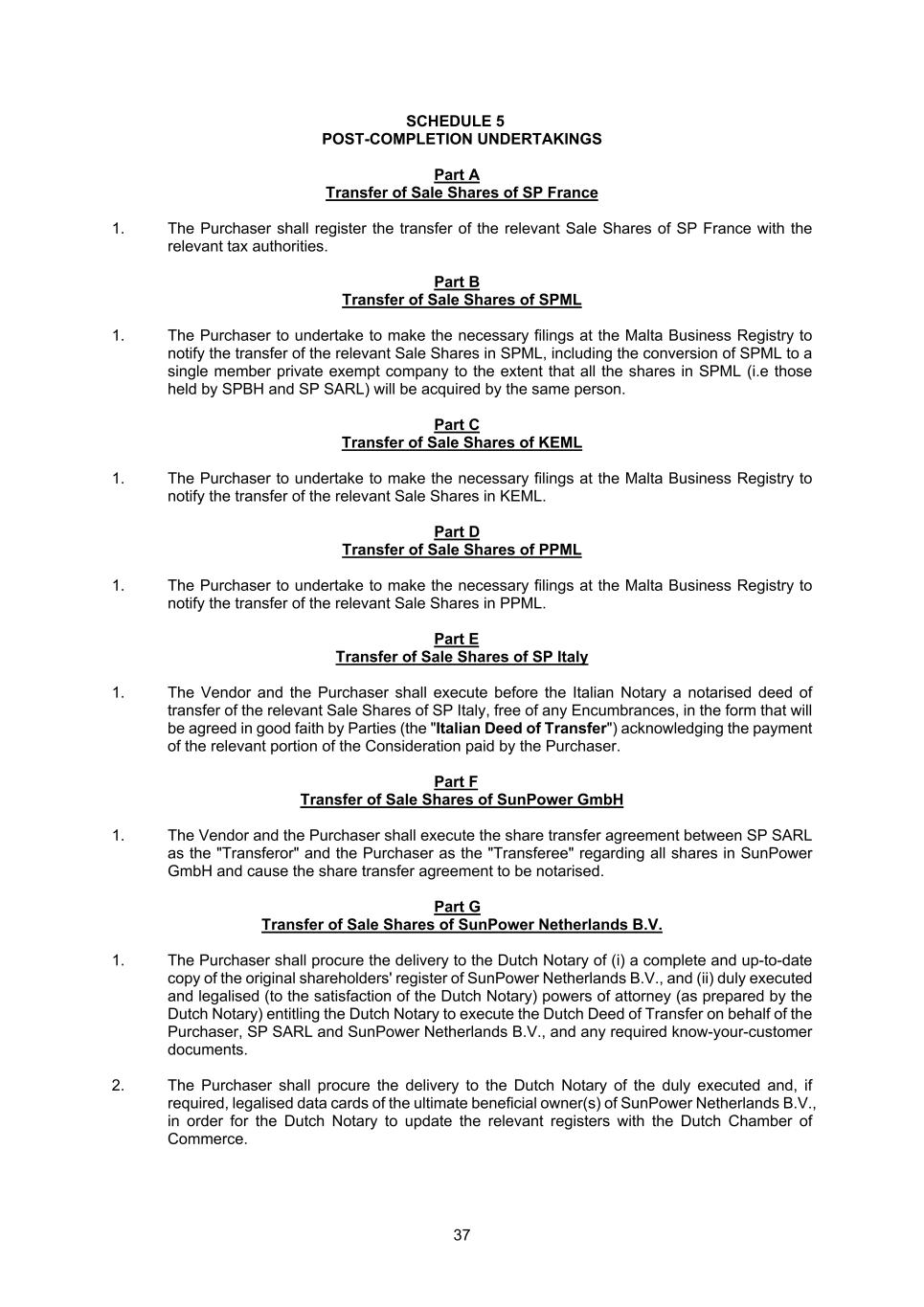 37 SCHEDULE 5 POST-COMPLETION UNDERTAKINGS Part A Transfer of Sale Shares of SP France 1. The Purchaser shall register the transfer of the relevant Sale Shares of SP France with the relevant tax authorities. Part B Transfer of Sale Shares of SPML 1. The Purchaser to undertake to make the necessary filings at the Malta Business Registry to notify the transfer of the relevant Sale Shares in SPML, including the conversion of SPML to a single member private exempt company to the extent that all the shares in SPML (i.e those held by SPBH and SP SARL) will be acquired by the same person. Part C Transfer of Sale Shares of KEML 1. The Purchaser to undertake to make the necessary filings at the Malta Business Registry to notify the transfer of the relevant Sale Shares in KEML. Part D Transfer of Sale Shares of PPML 1. The Purchaser to undertake to make the necessary filings at the Malta Business Registry to notify the transfer of the relevant Sale Shares in PPML. Part E Transfer of Sale Shares of SP Italy 1. The Vendor and the Purchaser shall execute before the Italian Notary a notarised deed of transfer of the relevant Sale Shares of SP Italy, free of any Encumbrances, in the form that will be agreed in good faith by Parties (the "Italian Deed of Transfer") acknowledging the payment of the relevant portion of the Consideration paid by the Purchaser. Part F Transfer of Sale Shares of SunPower GmbH 1. The Vendor and the Purchaser shall execute the share transfer agreement between SP SARL as the "Transferor" and the Purchaser as the "Transferee" regarding all shares in SunPower GmbH and cause the share transfer agreement to be notarised. Part G Transfer of Sale Shares of SunPower Netherlands B.V. 1. The Purchaser shall procure the delivery to the Dutch Notary of (i) a complete and up-to-date copy of the original shareholders' register of SunPower Netherlands B.V., and (ii) duly executed and legalised (to the satisfaction of the Dutch Notary) powers of attorney (as prepared by the Dutch Notary) entitling the Dutch Notary to execute the Dutch Deed of Transfer on behalf of the Purchaser, SP SARL and SunPower Netherlands B.V., and any required know-your-customer documents. 2. The Purchaser shall procure the delivery to the Dutch Notary of the duly executed and, if required, legalised data cards of the ultimate beneficial owner(s) of SunPower Netherlands B.V., in order for the Dutch Notary to update the relevant registers with the Dutch Chamber of Commerce.