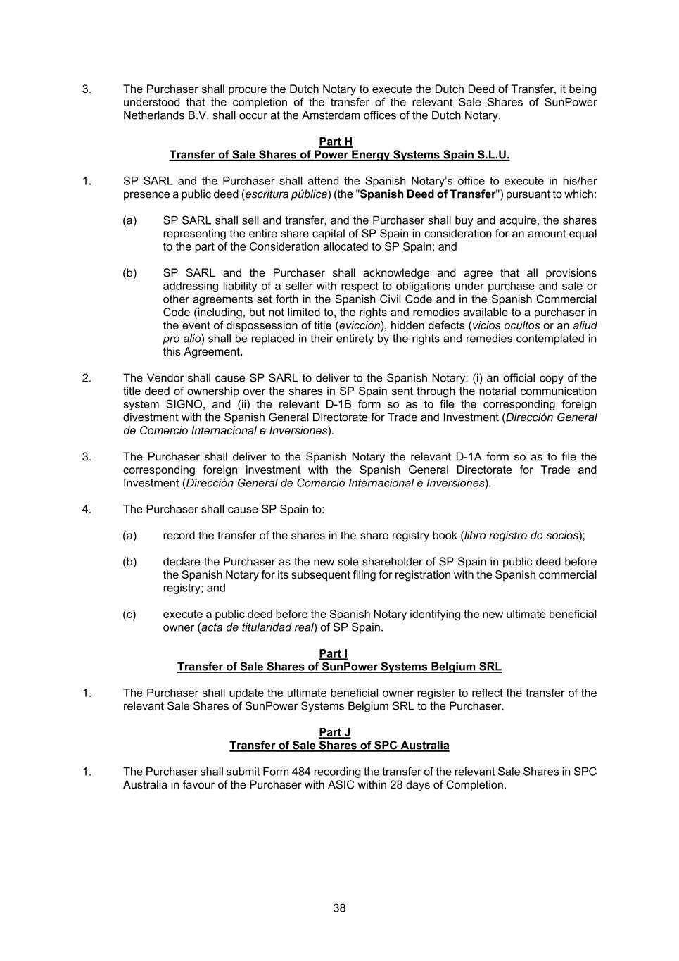 38 3. The Purchaser shall procure the Dutch Notary to execute the Dutch Deed of Transfer, it being understood that the completion of the transfer of the relevant Sale Shares of SunPower Netherlands B.V. shall occur at the Amsterdam offices of the Dutch Notary. Part H Transfer of Sale Shares of Power Energy Systems Spain S.L.U. 1. SP SARL and the Purchaser shall attend the Spanish Notary’s office to execute in his/her presence a public deed (escritura pública) (the "Spanish Deed of Transfer") pursuant to which: (a) SP SARL shall sell and transfer, and the Purchaser shall buy and acquire, the shares representing the entire share capital of SP Spain in consideration for an amount equal to the part of the Consideration allocated to SP Spain; and (b) SP SARL and the Purchaser shall acknowledge and agree that all provisions addressing liability of a seller with respect to obligations under purchase and sale or other agreements set forth in the Spanish Civil Code and in the Spanish Commercial Code (including, but not limited to, the rights and remedies available to a purchaser in the event of dispossession of title (evicción), hidden defects (vicios ocultos or an aliud pro alio) shall be replaced in their entirety by the rights and remedies contemplated in this Agreement. 2. The Vendor shall cause SP SARL to deliver to the Spanish Notary: (i) an official copy of the title deed of ownership over the shares in SP Spain sent through the notarial communication system SIGNO, and (ii) the relevant D-1B form so as to file the corresponding foreign divestment with the Spanish General Directorate for Trade and Investment (Dirección General de Comercio Internacional e Inversiones). 3. The Purchaser shall deliver to the Spanish Notary the relevant D-1A form so as to file the corresponding foreign investment with the Spanish General Directorate for Trade and Investment (Dirección General de Comercio Internacional e Inversiones). 4. The Purchaser shall cause SP Spain to: (a) record the transfer of the shares in the share registry book (libro registro de socios); (b) declare the Purchaser as the new sole shareholder of SP Spain in public deed before the Spanish Notary for its subsequent filing for registration with the Spanish commercial registry; and (c) execute a public deed before the Spanish Notary identifying the new ultimate beneficial owner (acta de titularidad real) of SP Spain. Part I Transfer of Sale Shares of SunPower Systems Belgium SRL 1. The Purchaser shall update the ultimate beneficial owner register to reflect the transfer of the relevant Sale Shares of SunPower Systems Belgium SRL to the Purchaser. Part J Transfer of Sale Shares of SPC Australia 1. The Purchaser shall submit Form 484 recording the transfer of the relevant Sale Shares in SPC Australia in favour of the Purchaser with ASIC within 28 days of Completion.