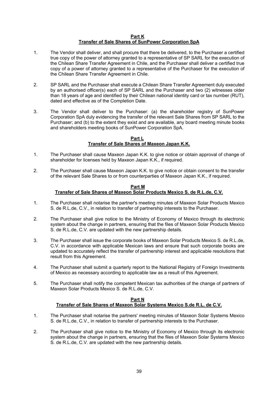 39 Part K Transfer of Sale Shares of SunPower Corporation SpA 1. The Vendor shall deliver, and shall procure that there be delivered, to the Purchaser a certified true copy of the power of attorney granted to a representative of SP SARL for the execution of the Chilean Share Transfer Agreement in Chile, and the Purchaser shall deliver a certified true copy of a power of attorney granted to a representative of the Purchaser for the execution of the Chilean Share Transfer Agreement in Chile. 2. SP SARL and the Purchaser shall execute a Chilean Share Transfer Agreement duly executed by an authorised officer(s) each of SP SARL and the Purchaser and two (2) witnesses older than 18 years of age and identified by their Chilean national identity card or tax number (RUT), dated and effective as of the Completion Date. 3. The Vendor shall deliver to the Purchaser: (a) the shareholder registry of SunPower Corporation SpA duly evidencing the transfer of the relevant Sale Shares from SP SARL to the Purchaser; and (b) to the extent they exist and are available, any board meeting minute books and shareholders meeting books of SunPower Corporation SpA. Part L Transfer of Sale Shares of Maxeon Japan K.K. 1. The Purchaser shall cause Maxeon Japan K.K. to give notice or obtain approval of change of shareholder for licenses held by Maxeon Japan K.K., if required. 2. The Purchaser shall cause Maxeon Japan K.K. to give notice or obtain consent to the transfer of the relevant Sale Shares to or from counterparties of Maxeon Japan K.K., if required. Part M Transfer of Sale Shares of Maxeon Solar Products Mexico S. de R.L.de, C.V. 1. The Purchaser shall notarise the partner's meeting minutes of Maxeon Solar Products Mexico S. de R.L.de, C.V., in relation to transfer of partnership interests to the Purchaser. 2. The Purchaser shall give notice to the Ministry of Economy of Mexico through its electronic system about the change in partners, ensuring that the files of Maxeon Solar Products Mexico S. de R.L.de, C.V. are updated with the new partnership details. 3. The Purchaser shall issue the corporate books of Maxeon Solar Products Mexico S. de R.L.de, C.V. in accordance with applicable Mexican laws and ensure that such corporate books are updated to accurately reflect the transfer of partnership interest and applicable resolutions that result from this Agreement. 4. The Purchaser shall submit a quarterly report to the National Registry of Foreign Investments of Mexico as necessary according to applicable law as a result of this Agreement. 5. The Purchaser shall notify the competent Mexican tax authorities of the change of partners of Maxeon Solar Products Mexico S. de R.L.de, C.V. Part N Transfer of Sale Shares of Maxeon Solar Systems Mexico S.de R.L. de C.V. 1. The Purchaser shall notarise the partners' meeting minutes of Maxeon Solar Systems Mexico S. de R.L.de, C.V., in relation to transfer of partnership interests to the Purchaser. 2. The Purchaser shall give notice to the Ministry of Economy of Mexico through its electronic system about the change in partners, ensuring that the files of Maxeon Solar Systems Mexico S. de R.L.de, C.V. are updated with the new partnership details.
