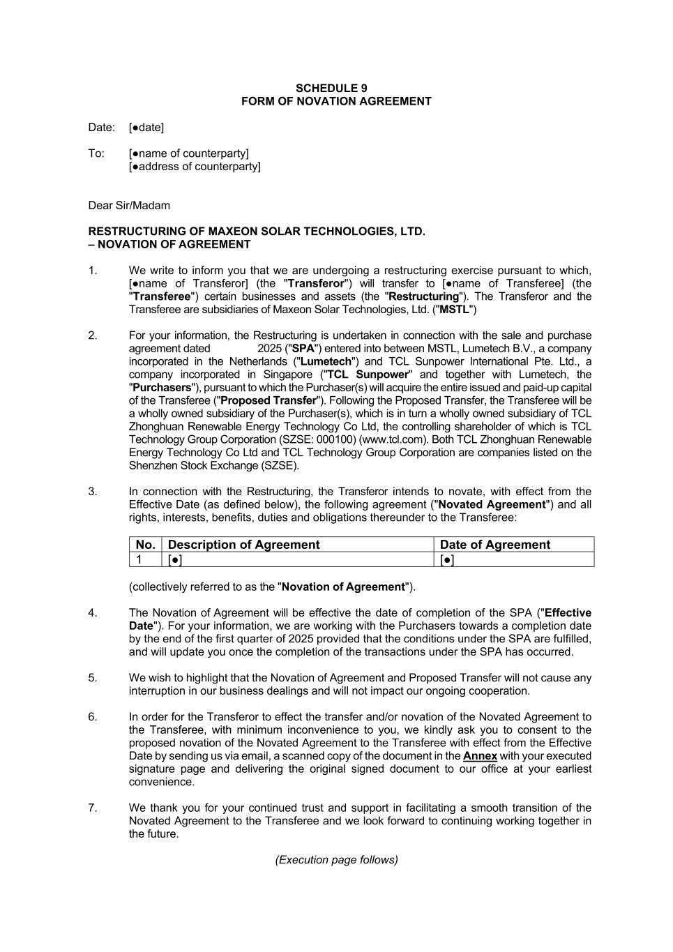 SCHEDULE 9 FORM OF NOVATION AGREEMENT Date: [●date] To: [●name of counterparty] [●address of counterparty] Dear Sir/Madam RESTRUCTURING OF MAXEON SOLAR TECHNOLOGIES, LTD. – NOVATION OF AGREEMENT 1. We write to inform you that we are undergoing a restructuring exercise pursuant to which, [●name of Transferor] (the "Transferor") will transfer to [●name of Transferee] (the "Transferee") certain businesses and assets (the "Restructuring"). The Transferor and the Transferee are subsidiaries of Maxeon Solar Technologies, Ltd. ("MSTL") 2. For your information, the Restructuring is undertaken in connection with the sale and purchase agreement dated 2025 ("SPA") entered into between MSTL, Lumetech B.V., a company incorporated in the Netherlands ("Lumetech") and TCL Sunpower International Pte. Ltd., a company incorporated in Singapore ("TCL Sunpower" and together with Lumetech, the "Purchasers"), pursuant to which the Purchaser(s) will acquire the entire issued and paid-up capital of the Transferee ("Proposed Transfer"). Following the Proposed Transfer, the Transferee will be a wholly owned subsidiary of the Purchaser(s), which is in turn a wholly owned subsidiary of TCL Zhonghuan Renewable Energy Technology Co Ltd, the controlling shareholder of which is TCL Technology Group Corporation (SZSE: 000100) (www.tcl.com). Both TCL Zhonghuan Renewable Energy Technology Co Ltd and TCL Technology Group Corporation are companies listed on the Shenzhen Stock Exchange (SZSE). 3. In connection with the Restructuring, the Transferor intends to novate, with effect from the Effective Date (as defined below), the following agreement ("Novated Agreement") and all rights, interests, benefits, duties and obligations thereunder to the Transferee: No. Description of Agreement Date of Agreement 1 [●] [●] (collectively referred to as the "Novation of Agreement"). 4. The Novation of Agreement will be effective the date of completion of the SPA ("Effective Date"). For your information, we are working with the Purchasers towards a completion date by the end of the first quarter of 2025 provided that the conditions under the SPA are fulfilled, and will update you once the completion of the transactions under the SPA has occurred. 5. We wish to highlight that the Novation of Agreement and Proposed Transfer will not cause any interruption in our business dealings and will not impact our ongoing cooperation. 6. In order for the Transferor to effect the transfer and/or novation of the Novated Agreement to the Transferee, with minimum inconvenience to you, we kindly ask you to consent to the proposed novation of the Novated Agreement to the Transferee with effect from the Effective Date by sending us via email, a scanned copy of the document in the Annex with your executed signature page and delivering the original signed document to our office at your earliest convenience. 7. We thank you for your continued trust and support in facilitating a smooth transition of the Novated Agreement to the Transferee and we look forward to continuing working together in the future. (Execution page follows)