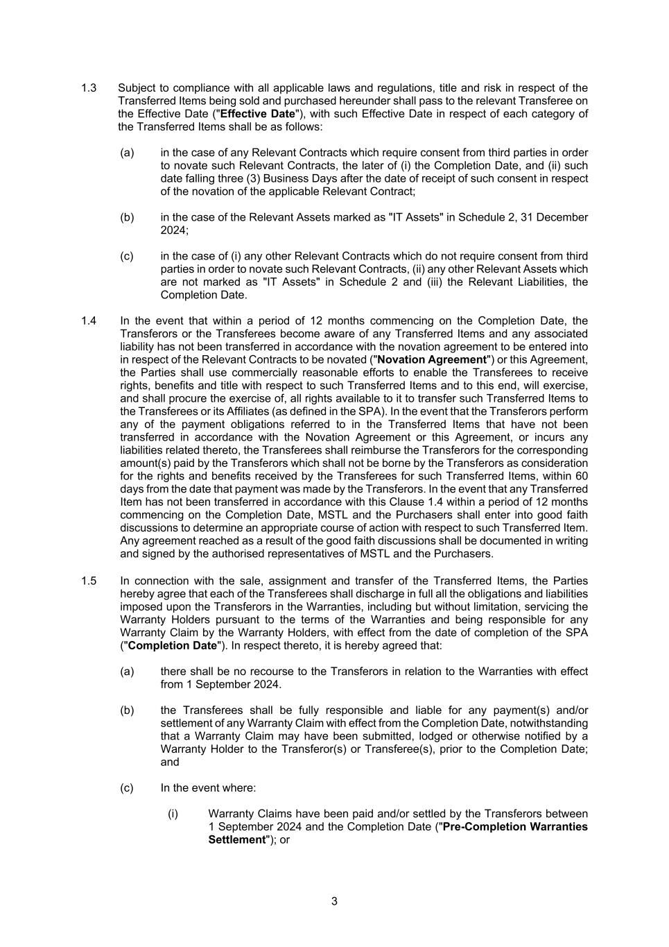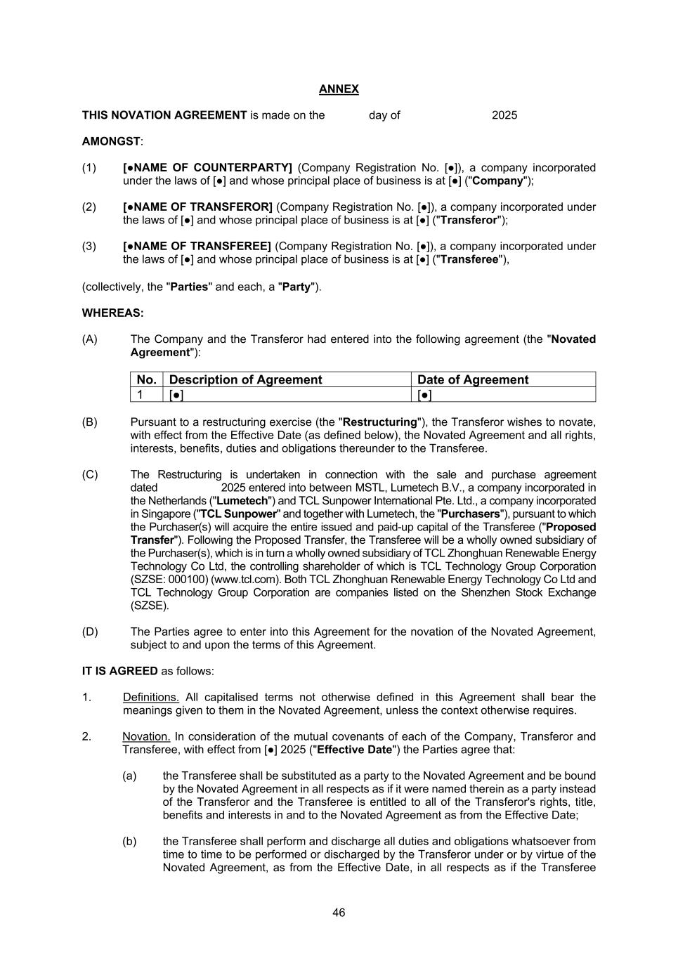 46 ANNEX THIS NOVATION AGREEMENT is made on the day of 2025 AMONGST: (1) [●NAME OF COUNTERPARTY] (Company Registration No. [●]), a company incorporated under the laws of [●] and whose principal place of business is at [●] ("Company"); (2) [●NAME OF TRANSFEROR] (Company Registration No. [●]), a company incorporated under the laws of [●] and whose principal place of business is at [●] ("Transferor"); (3) [●NAME OF TRANSFEREE] (Company Registration No. [●]), a company incorporated under the laws of [●] and whose principal place of business is at [●] ("Transferee"), (collectively, the "Parties" and each, a "Party"). WHEREAS: (A) The Company and the Transferor had entered into the following agreement (the "Novated Agreement"): No. Description of Agreement Date of Agreement 1 [●] [●] (B) Pursuant to a restructuring exercise (the "Restructuring"), the Transferor wishes to novate, with effect from the Effective Date (as defined below), the Novated Agreement and all rights, interests, benefits, duties and obligations thereunder to the Transferee. (C) The Restructuring is undertaken in connection with the sale and purchase agreement dated 2025 entered into between MSTL, Lumetech B.V., a company incorporated in the Netherlands ("Lumetech") and TCL Sunpower International Pte. Ltd., a company incorporated in Singapore ("TCL Sunpower" and together with Lumetech, the "Purchasers"), pursuant to which the Purchaser(s) will acquire the entire issued and paid-up capital of the Transferee ("Proposed Transfer"). Following the Proposed Transfer, the Transferee will be a wholly owned subsidiary of the Purchaser(s), which is in turn a wholly owned subsidiary of TCL Zhonghuan Renewable Energy Technology Co Ltd, the controlling shareholder of which is TCL Technology Group Corporation (SZSE: 000100) (www.tcl.com). Both TCL Zhonghuan Renewable Energy Technology Co Ltd and TCL Technology Group Corporation are companies listed on the Shenzhen Stock Exchange (SZSE). (D) The Parties agree to enter into this Agreement for the novation of the Novated Agreement, subject to and upon the terms of this Agreement. IT IS AGREED as follows: 1. Definitions. All capitalised terms not otherwise defined in this Agreement shall bear the meanings given to them in the Novated Agreement, unless the context otherwise requires. 2. Novation. In consideration of the mutual covenants of each of the Company, Transferor and Transferee, with effect from [●] 2025 ("Effective Date") the Parties agree that: (a) the Transferee shall be substituted as a party to the Novated Agreement and be bound by the Novated Agreement in all respects as if it were named therein as a party instead of the Transferor and the Transferee is entitled to all of the Transferor's rights, title, benefits and interests in and to the Novated Agreement as from the Effective Date; (b) the Transferee shall perform and discharge all duties and obligations whatsoever from time to time to be performed or discharged by the Transferor under or by virtue of the Novated Agreement, as from the Effective Date, in all respects as if the Transferee