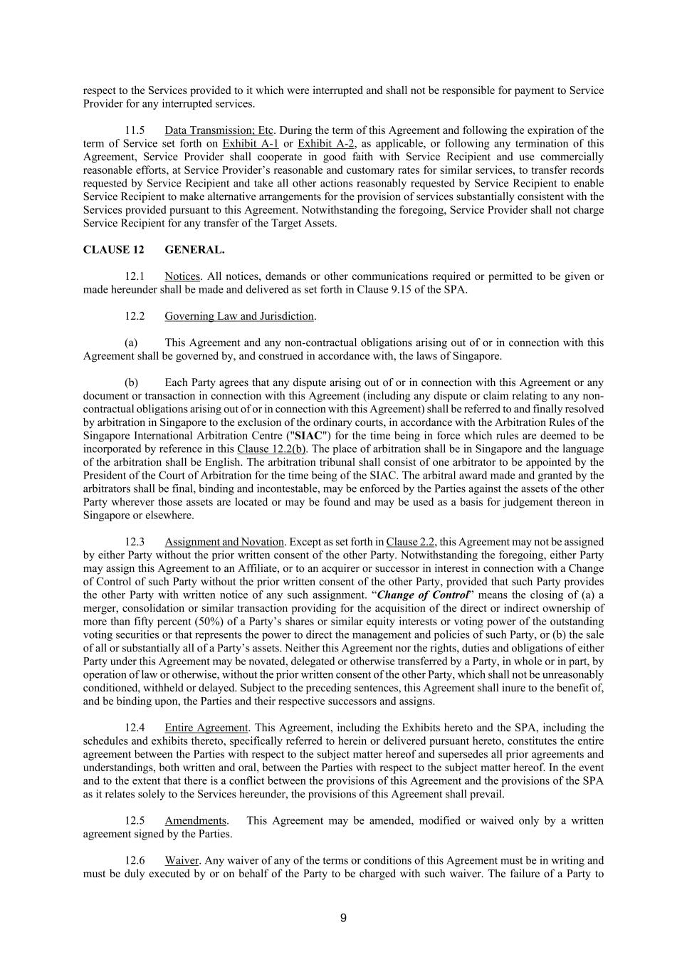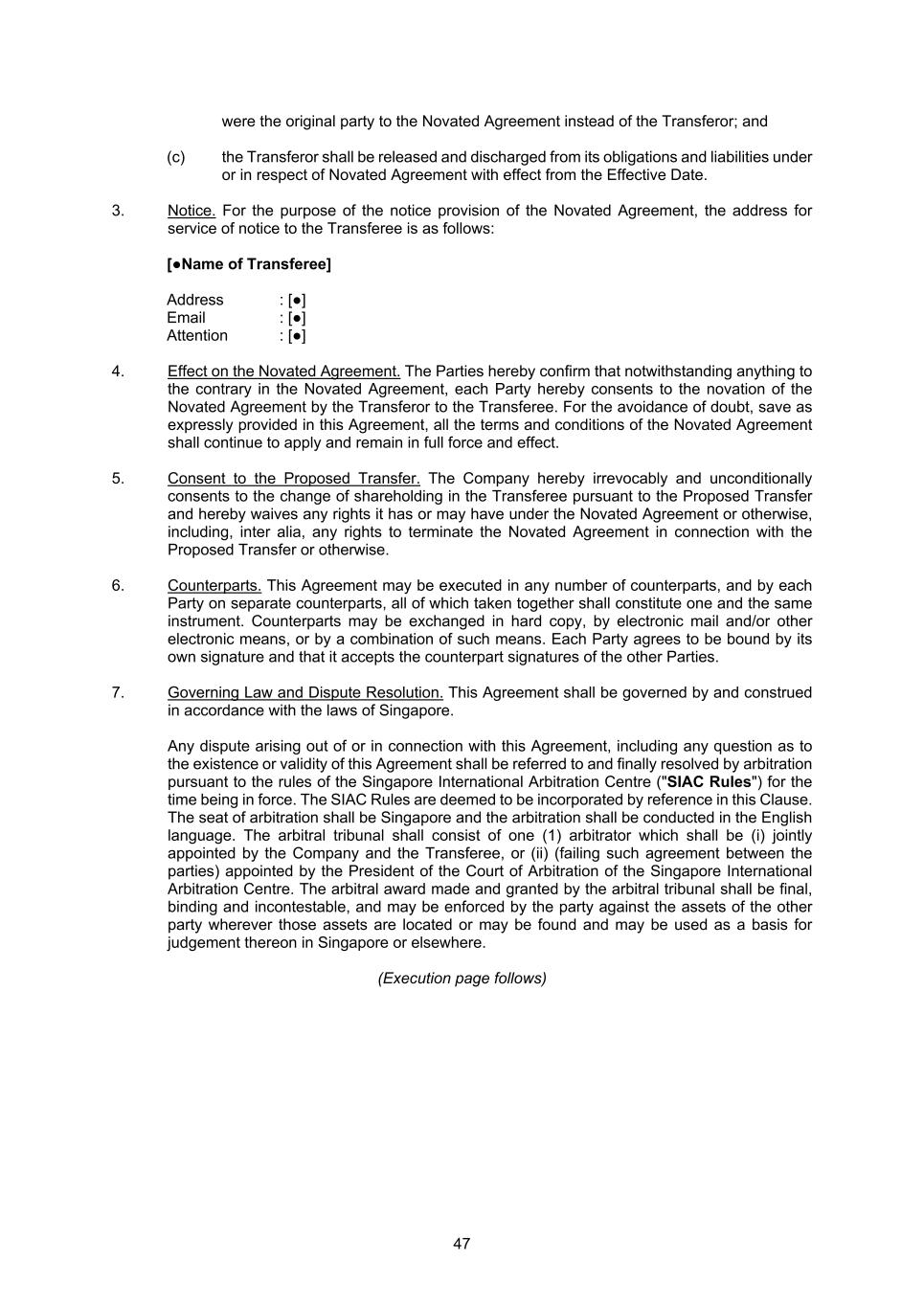 47 were the original party to the Novated Agreement instead of the Transferor; and (c) the Transferor shall be released and discharged from its obligations and liabilities under or in respect of Novated Agreement with effect from the Effective Date. 3. Notice. For the purpose of the notice provision of the Novated Agreement, the address for service of notice to the Transferee is as follows: [●Name of Transferee] Address : [●] Email : [●] Attention : [●] 4. Effect on the Novated Agreement. The Parties hereby confirm that notwithstanding anything to the contrary in the Novated Agreement, each Party hereby consents to the novation of the Novated Agreement by the Transferor to the Transferee. For the avoidance of doubt, save as expressly provided in this Agreement, all the terms and conditions of the Novated Agreement shall continue to apply and remain in full force and effect. 5. Consent to the Proposed Transfer. The Company hereby irrevocably and unconditionally consents to the change of shareholding in the Transferee pursuant to the Proposed Transfer and hereby waives any rights it has or may have under the Novated Agreement or otherwise, including, inter alia, any rights to terminate the Novated Agreement in connection with the Proposed Transfer or otherwise. 6. Counterparts. This Agreement may be executed in any number of counterparts, and by each Party on separate counterparts, all of which taken together shall constitute one and the same instrument. Counterparts may be exchanged in hard copy, by electronic mail and/or other electronic means, or by a combination of such means. Each Party agrees to be bound by its own signature and that it accepts the counterpart signatures of the other Parties. 7. Governing Law and Dispute Resolution. This Agreement shall be governed by and construed in accordance with the laws of Singapore. Any dispute arising out of or in connection with this Agreement, including any question as to the existence or validity of this Agreement shall be referred to and finally resolved by arbitration pursuant to the rules of the Singapore International Arbitration Centre ("SIAC Rules") for the time being in force. The SIAC Rules are deemed to be incorporated by reference in this Clause. The seat of arbitration shall be Singapore and the arbitration shall be conducted in the English language. The arbitral tribunal shall consist of one (1) arbitrator which shall be (i) jointly appointed by the Company and the Transferee, or (ii) (failing such agreement between the parties) appointed by the President of the Court of Arbitration of the Singapore International Arbitration Centre. The arbitral award made and granted by the arbitral tribunal shall be final, binding and incontestable, and may be enforced by the party against the assets of the other party wherever those assets are located or may be found and may be used as a basis for judgement thereon in Singapore or elsewhere. (Execution page follows)