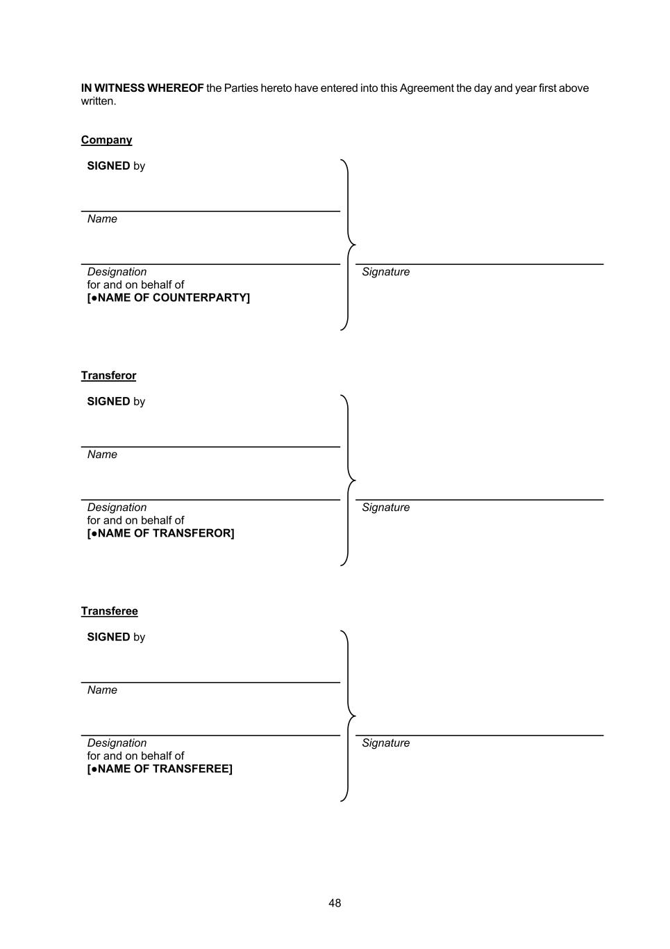 48 IN WITNESS WHEREOF the Parties hereto have entered into this Agreement the day and year first above written. Company SIGNED by Name Designation Signature for and on behalf of [●NAME OF COUNTERPARTY] Transferor SIGNED by Name Designation Signature for and on behalf of [●NAME OF TRANSFEROR] Transferee SIGNED by Name Designation Signature for and on behalf of [●NAME OF TRANSFEREE]