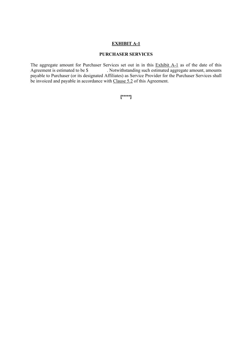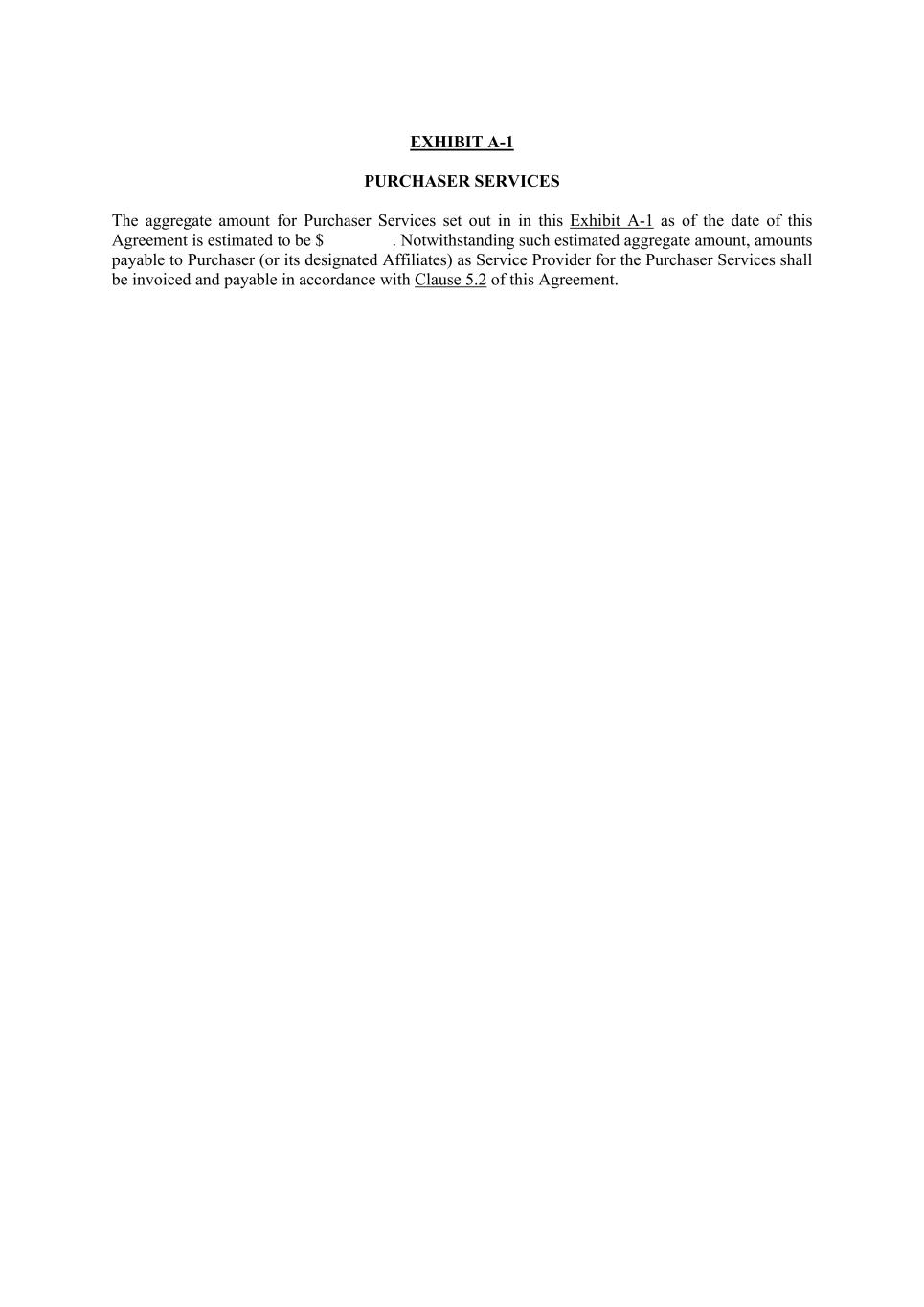 EXHIBIT A-1 PURCHASER SERVICES The aggregate amount for Purchaser Services set out in in this Exhibit A-1 as of the date of this Agreement is estimated to be $ . Notwithstanding such estimated aggregate amount, amounts payable to Purchaser (or its designated Affiliates) as Service Provider for the Purchaser Services shall be invoiced and payable in accordance with Clause 5.2 of this Agreement. [*****]